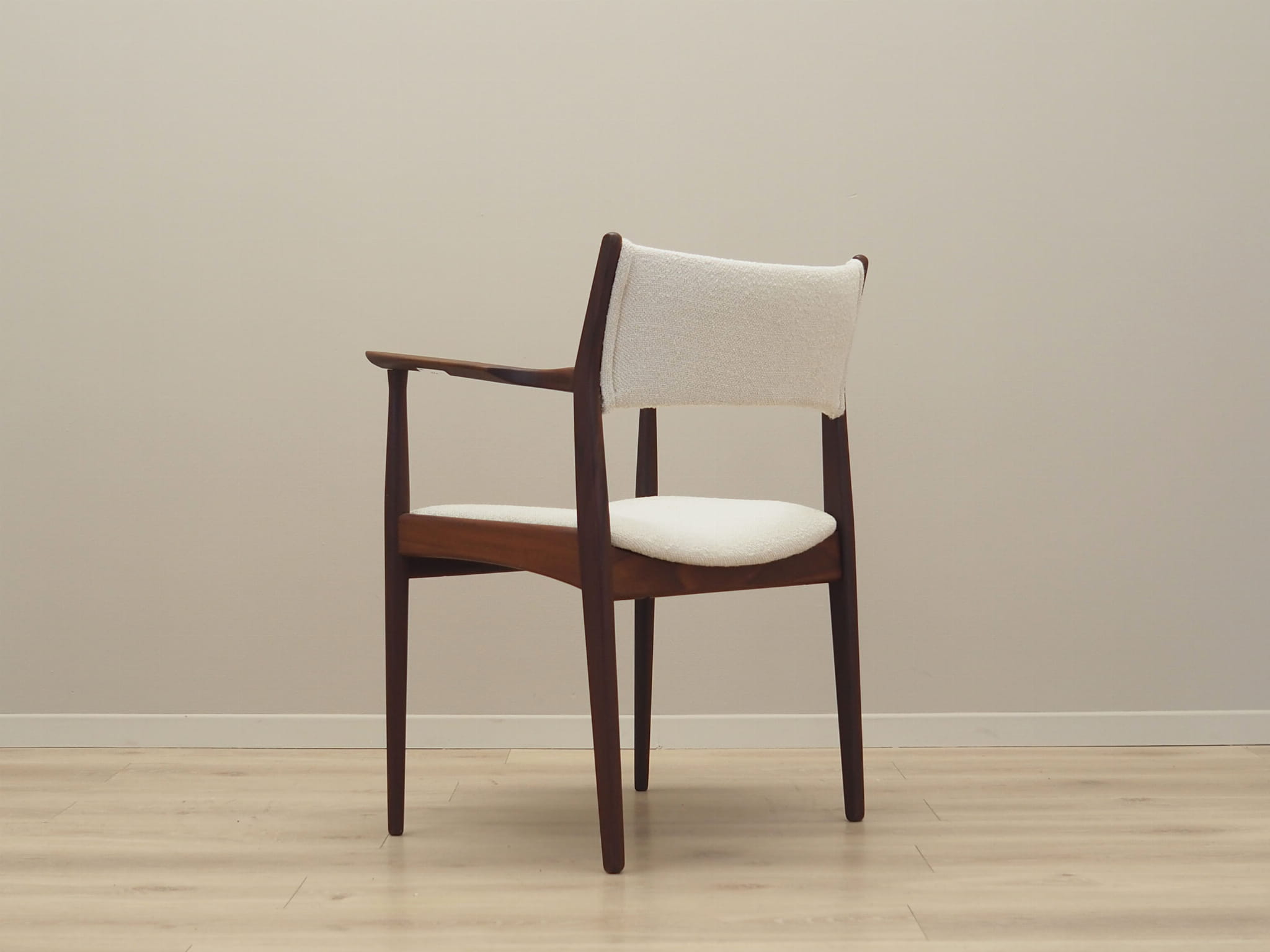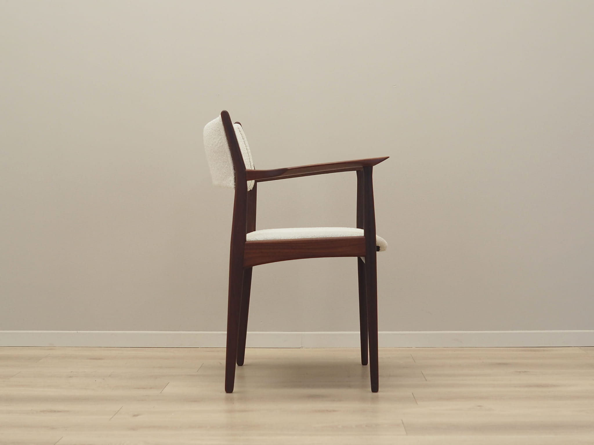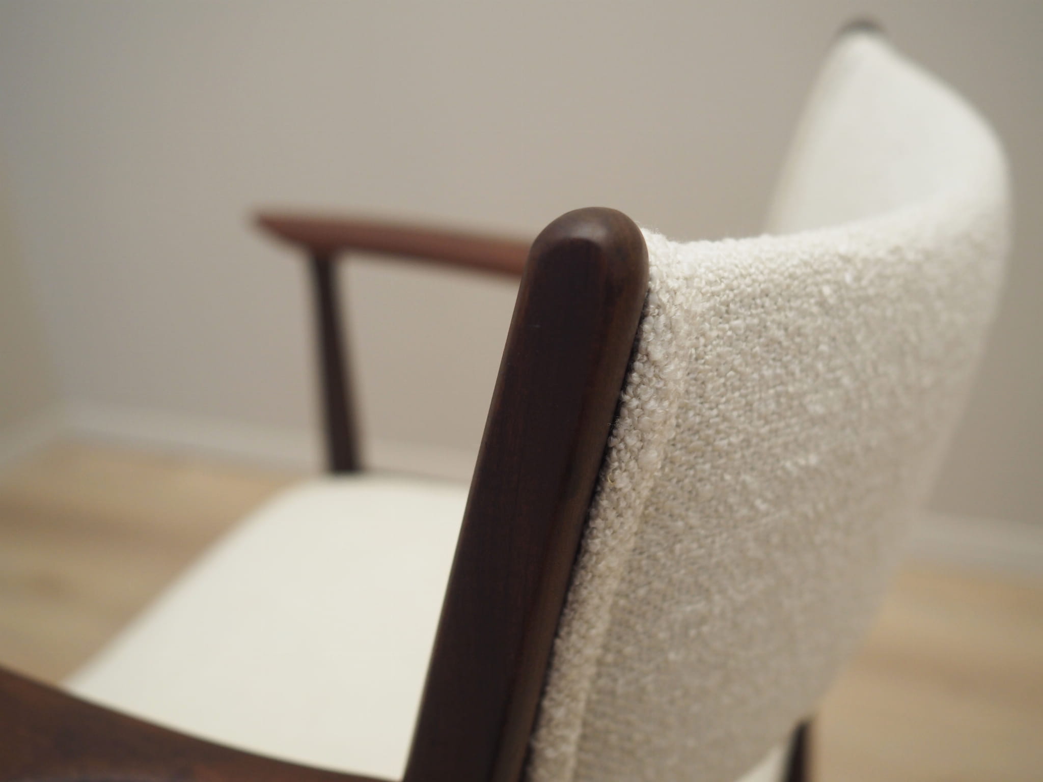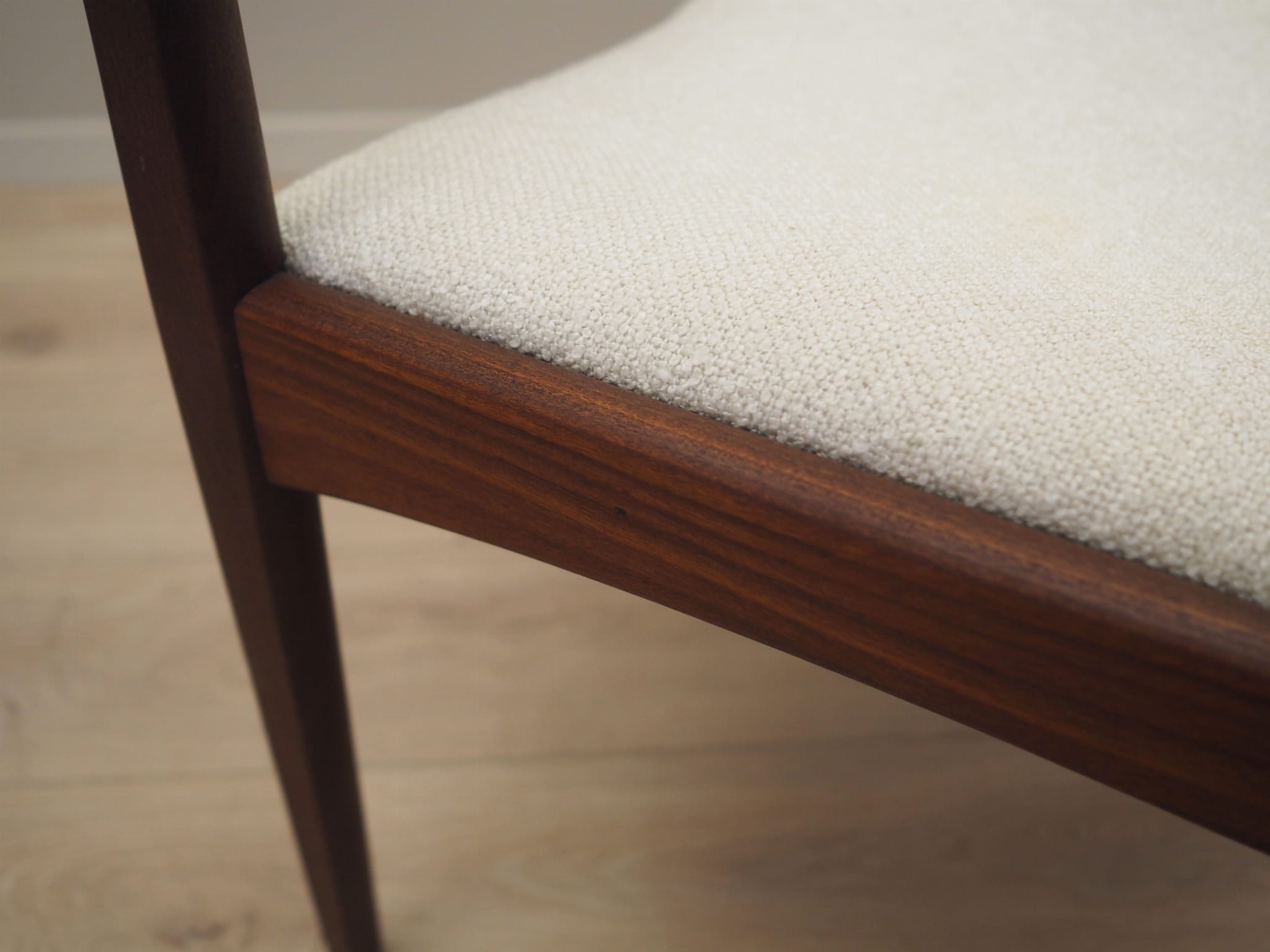 The structure is made of teak wood. The wood has been refreshed. The armchair has undergone upholstery restoration, the fabric has been exchanged for a new one. The upholstery was made in the colour ecru, high quality fabric with clear weave was used.