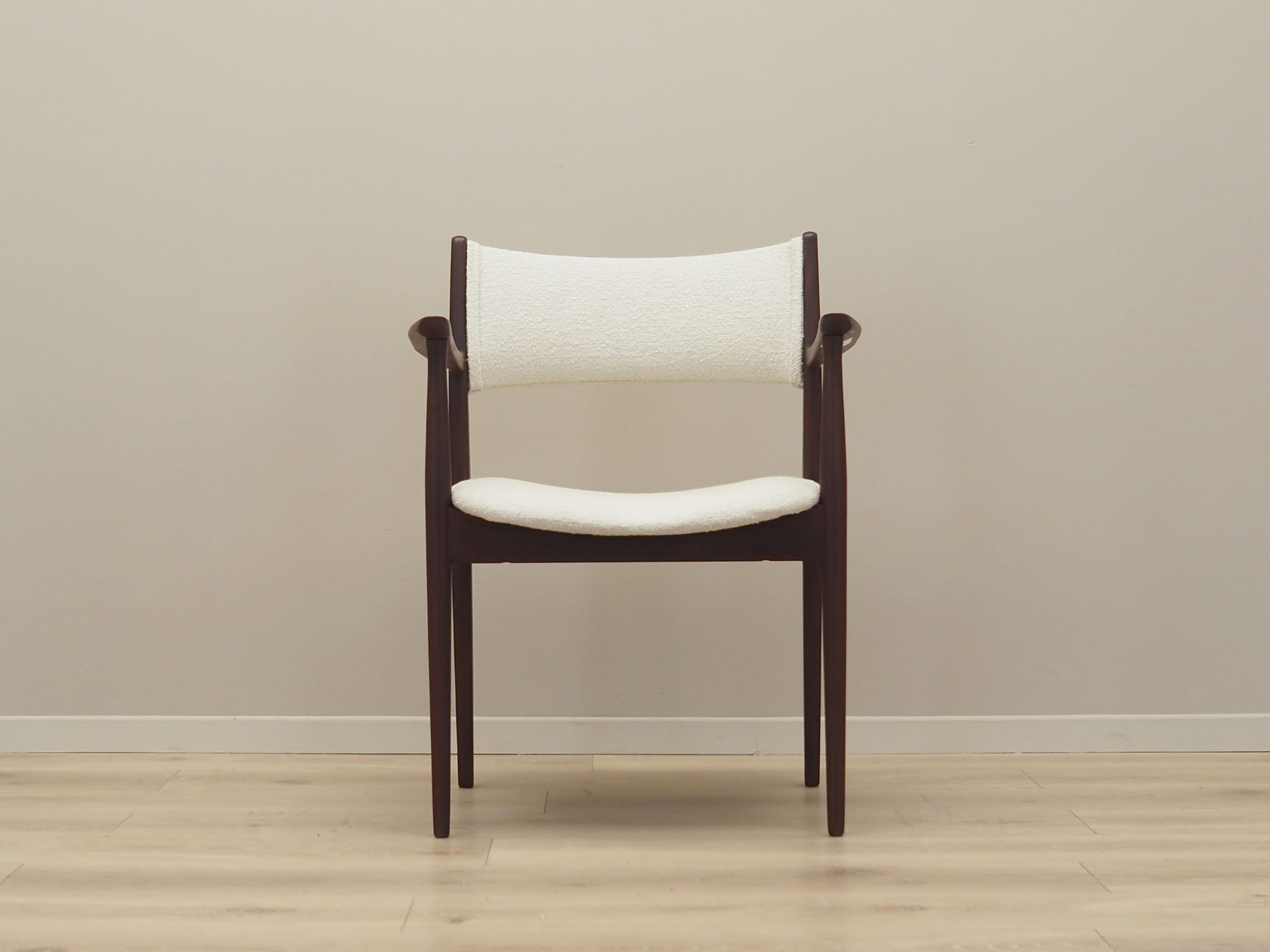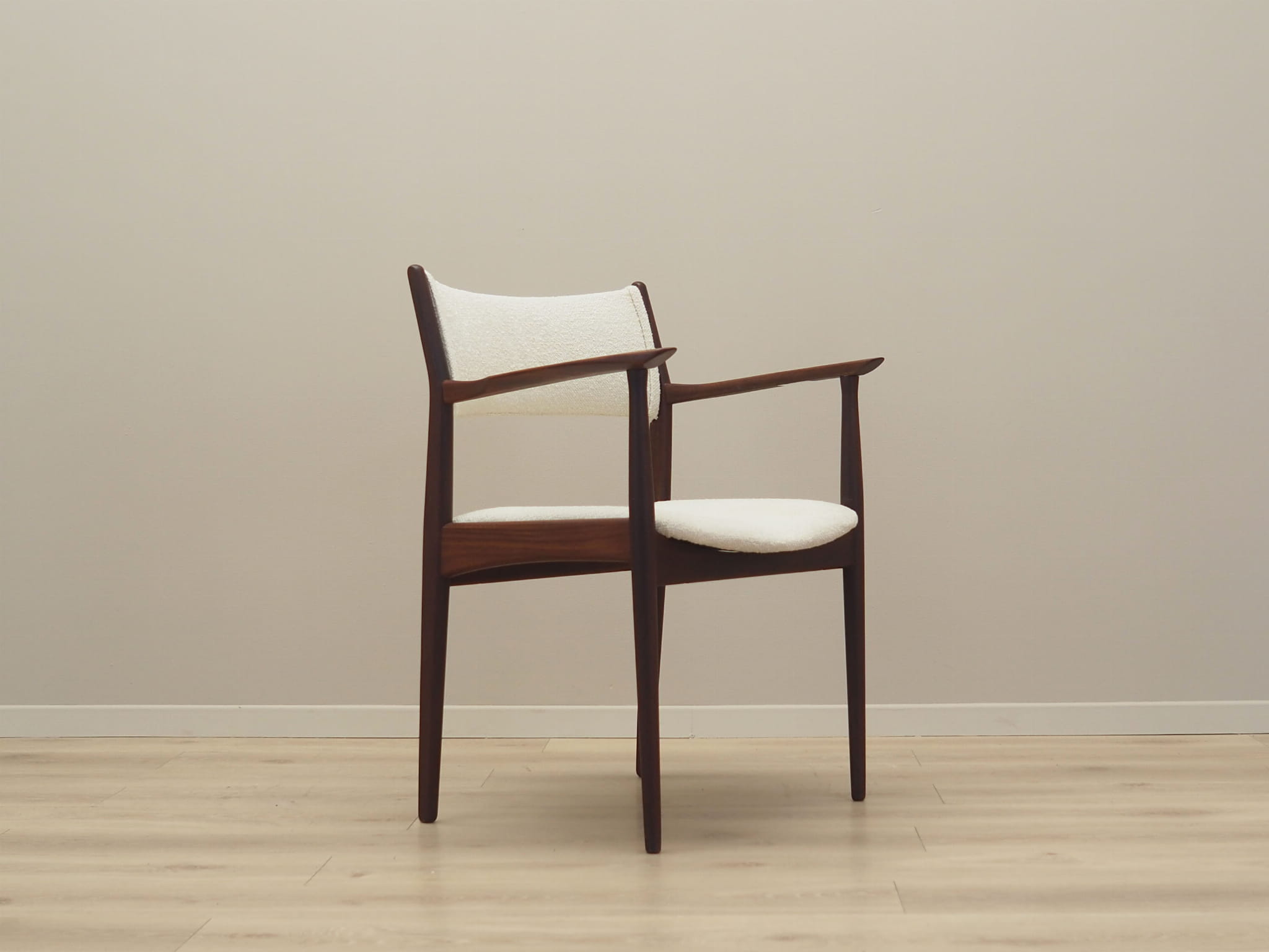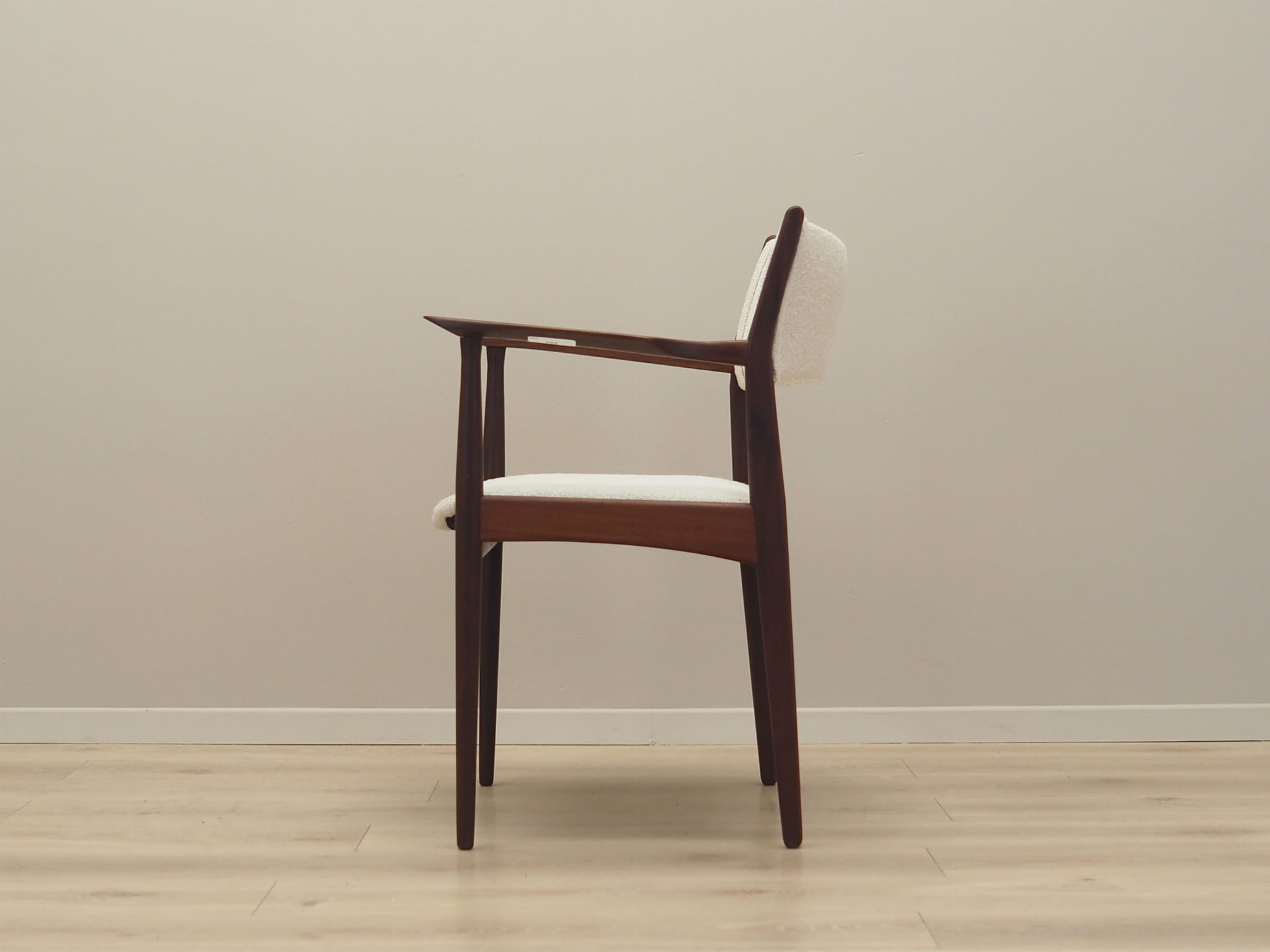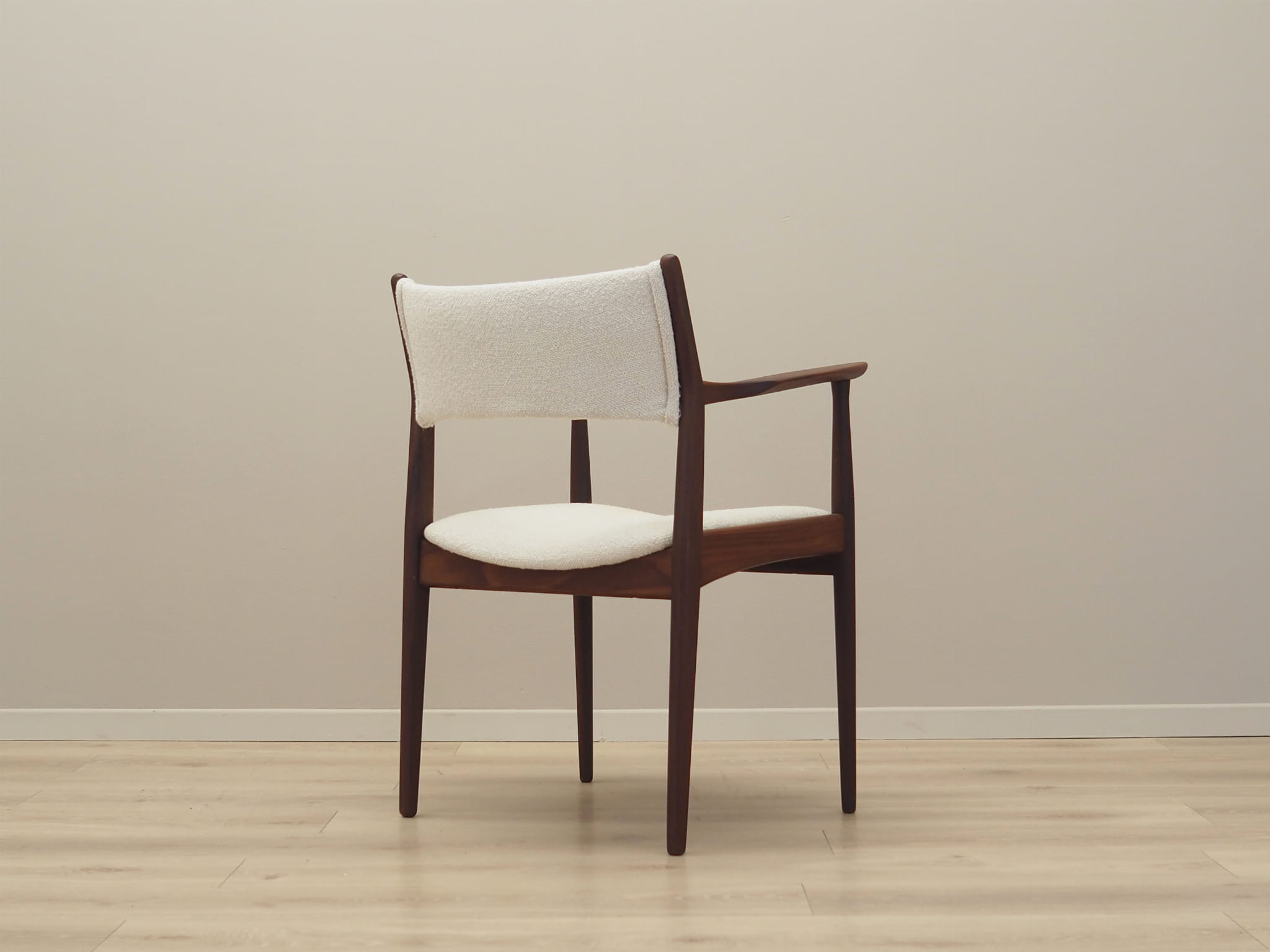 The structure is made of teak wood. The wood has been refreshed. The armchair has undergone upholstery restoration, the fabric has been exchanged for a new one. The upholstery was made in the colour ecru, high quality fabric with clear weave was used.