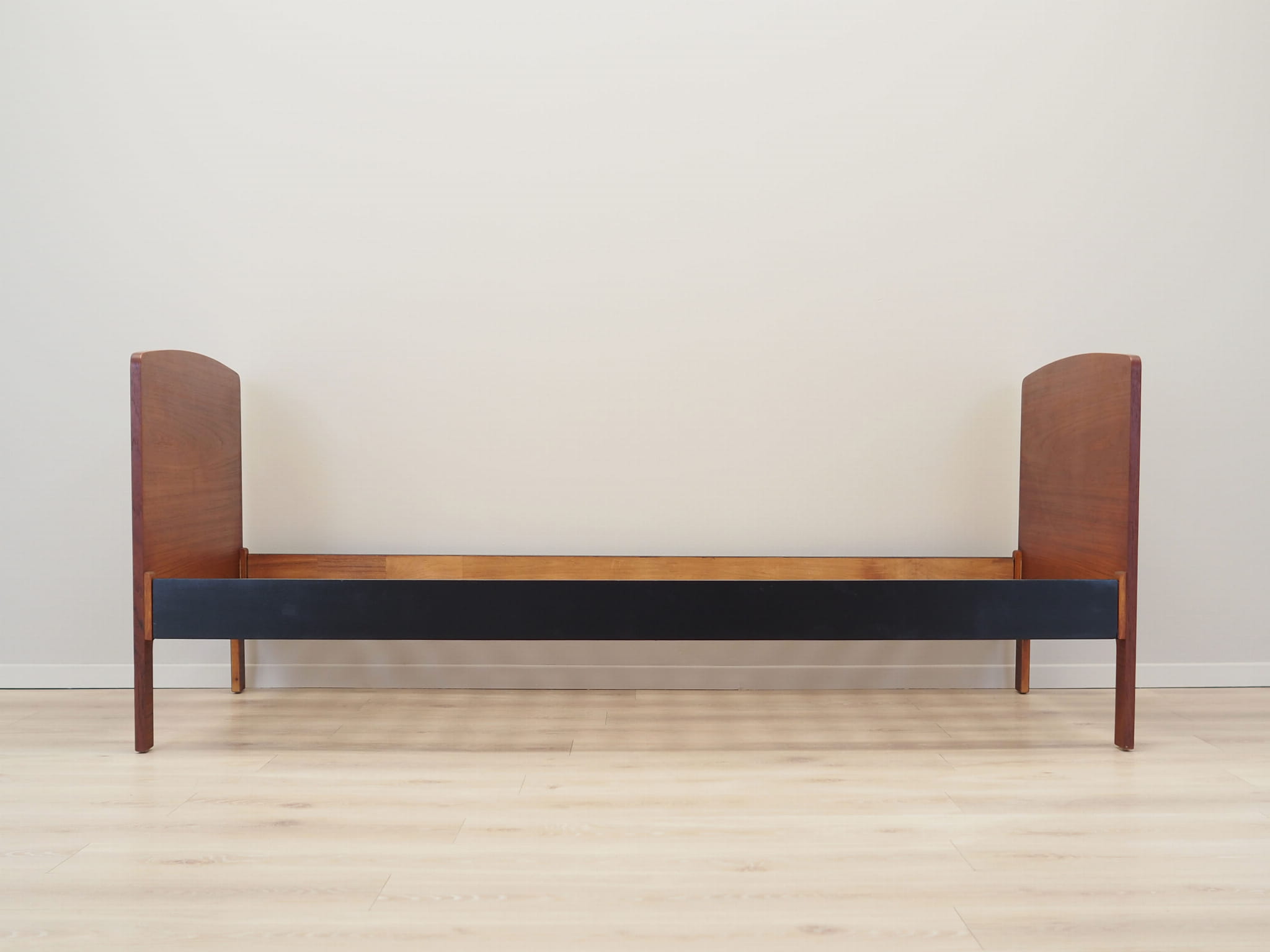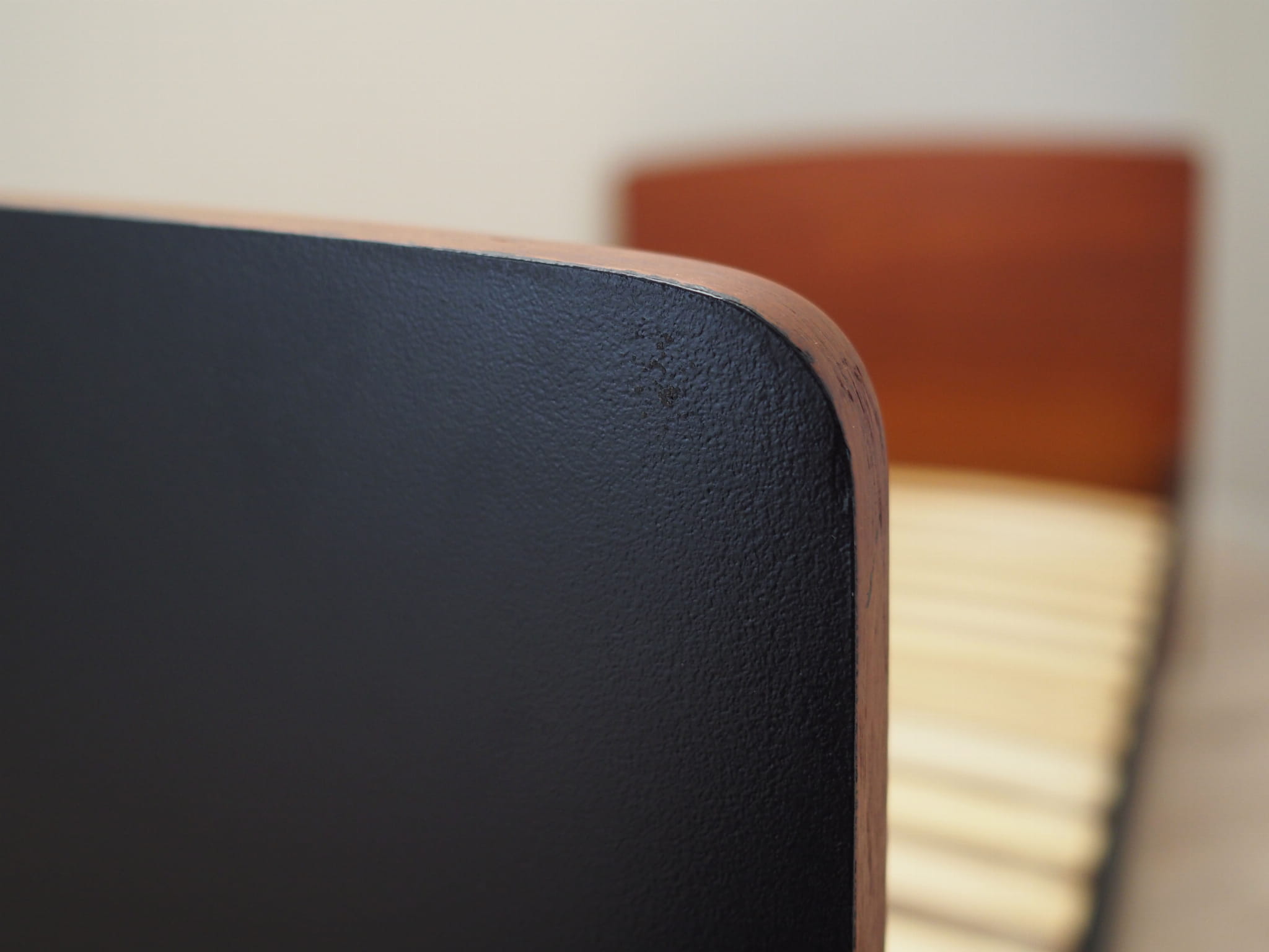The structure is covered with teak veneer. The legs are made of solid wood. The veneered surface has been refreshed. The bed comes with a lattenrost made of beech wood.