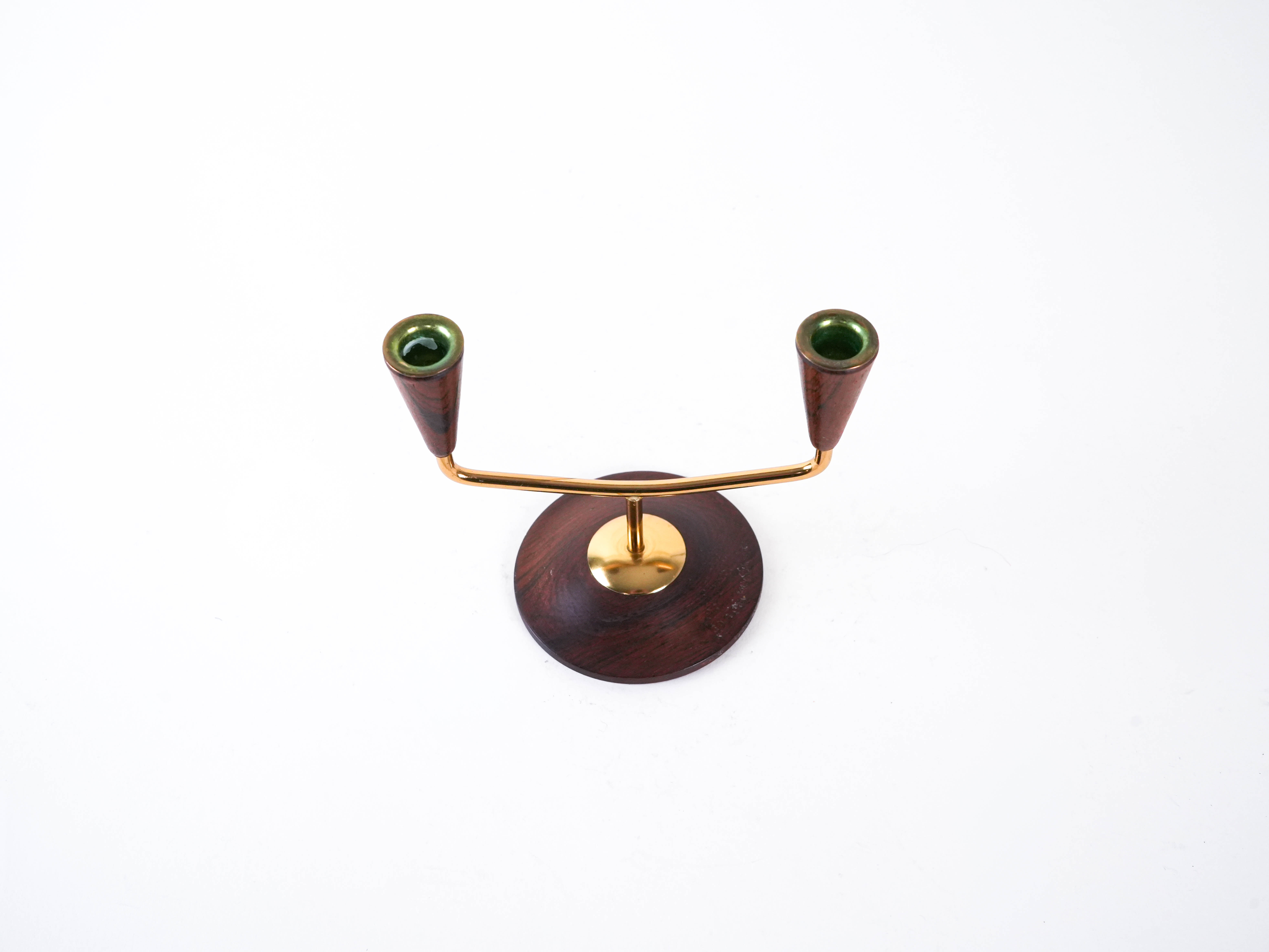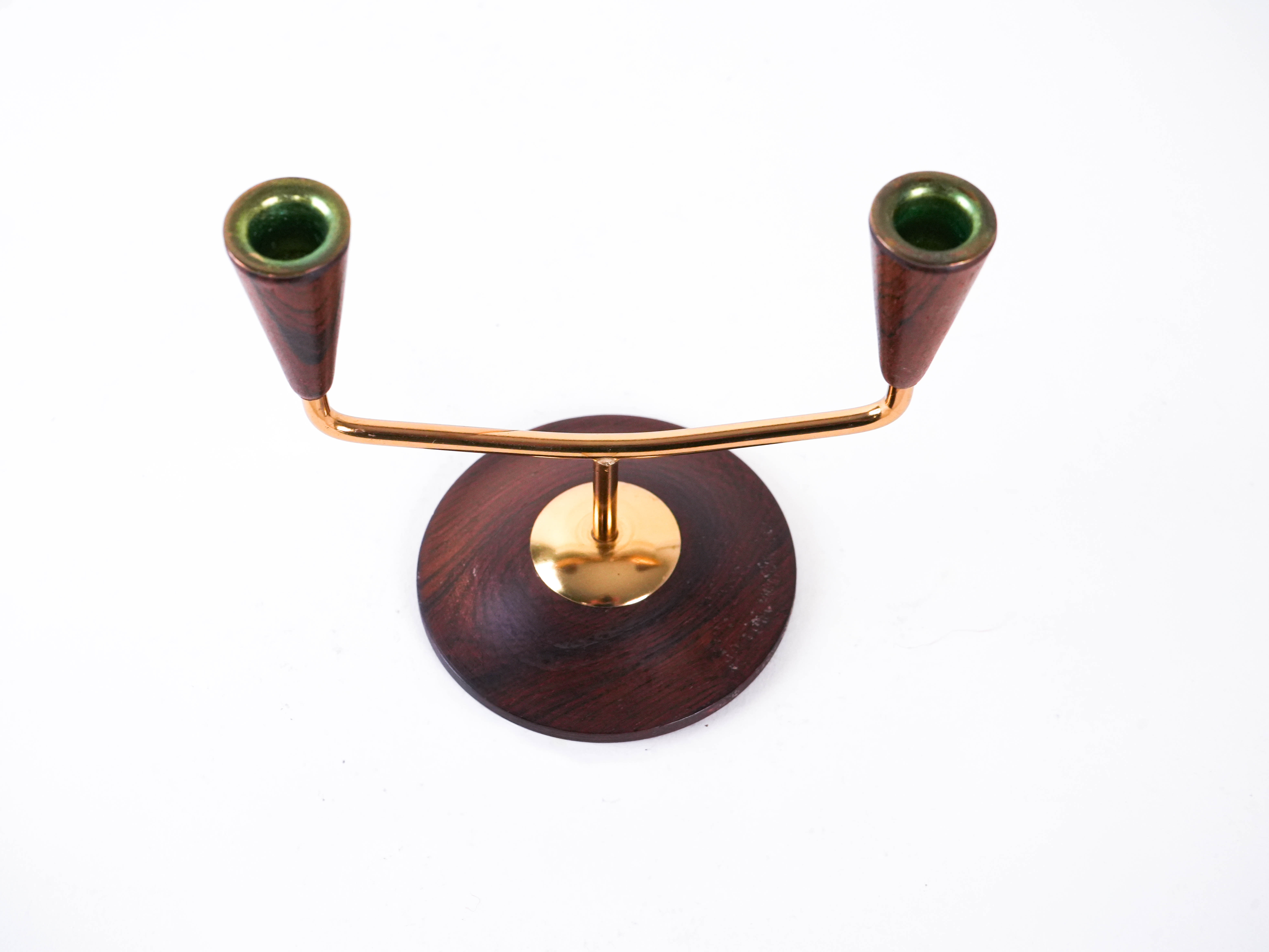 An elegant two-candle holder made of a combination of brass and teak wood. Its minimalist form reflects the Scandinavian modernist style of the 1960s–70s, making it ideal as a table or dresser decoration.