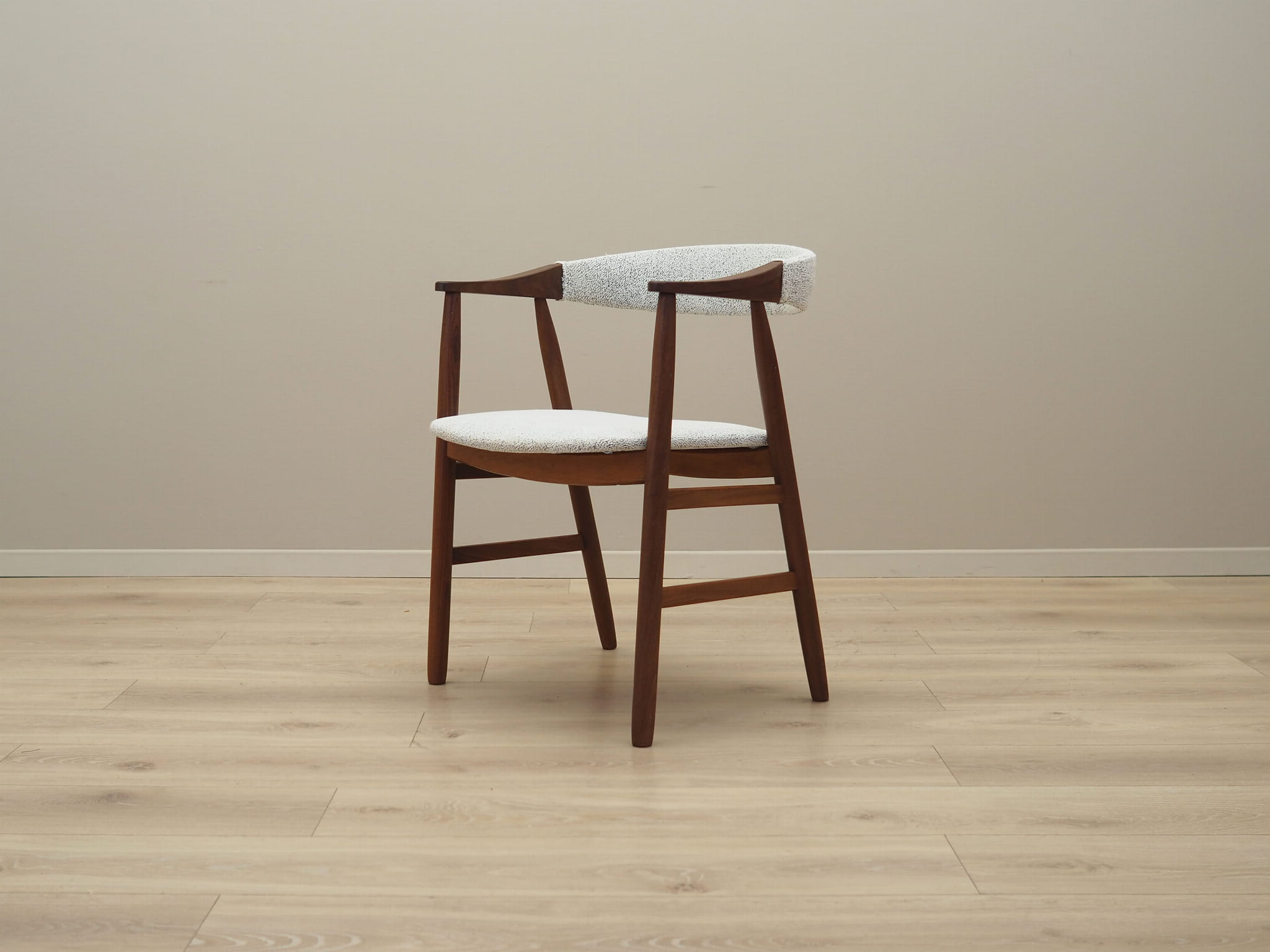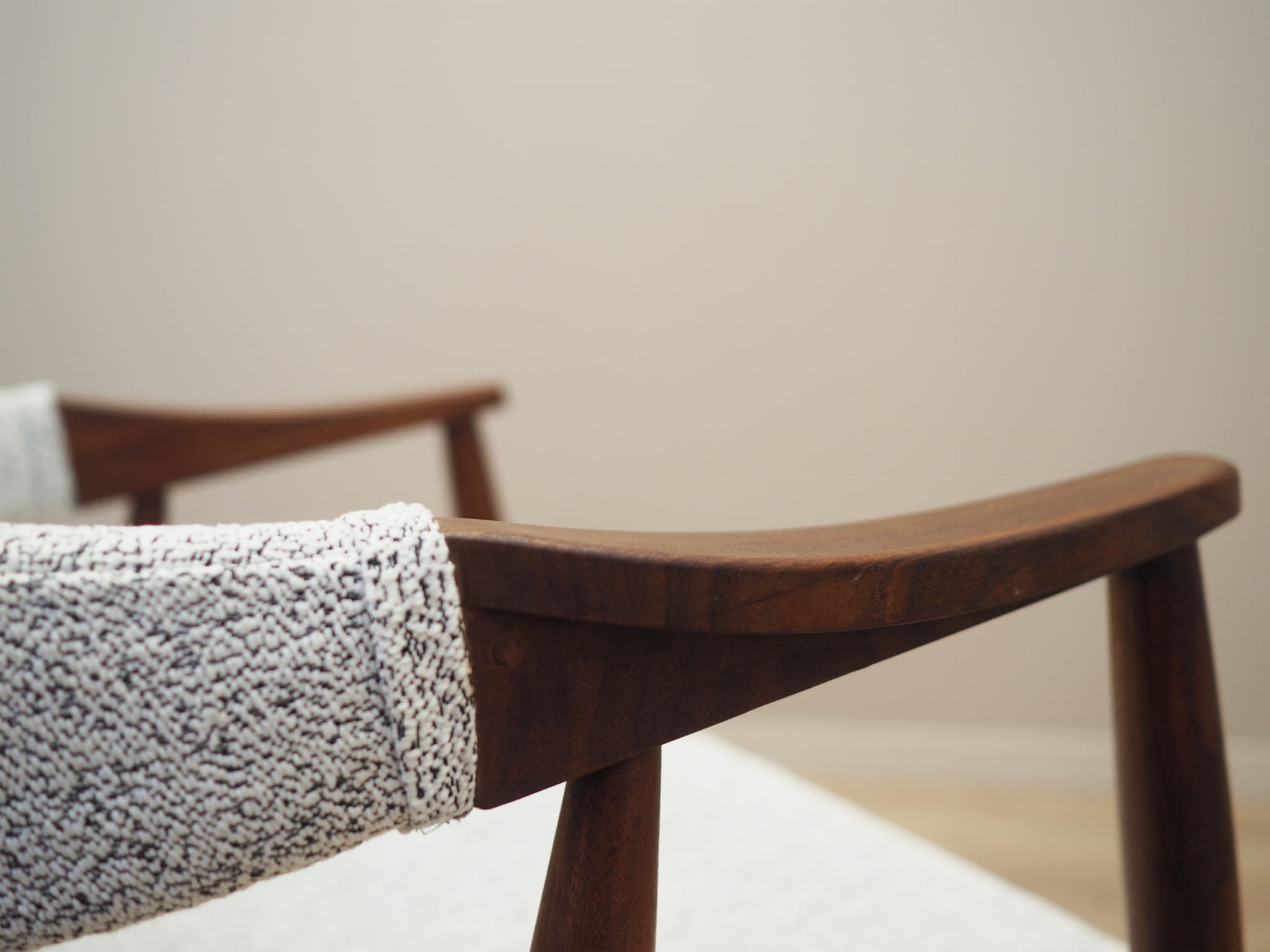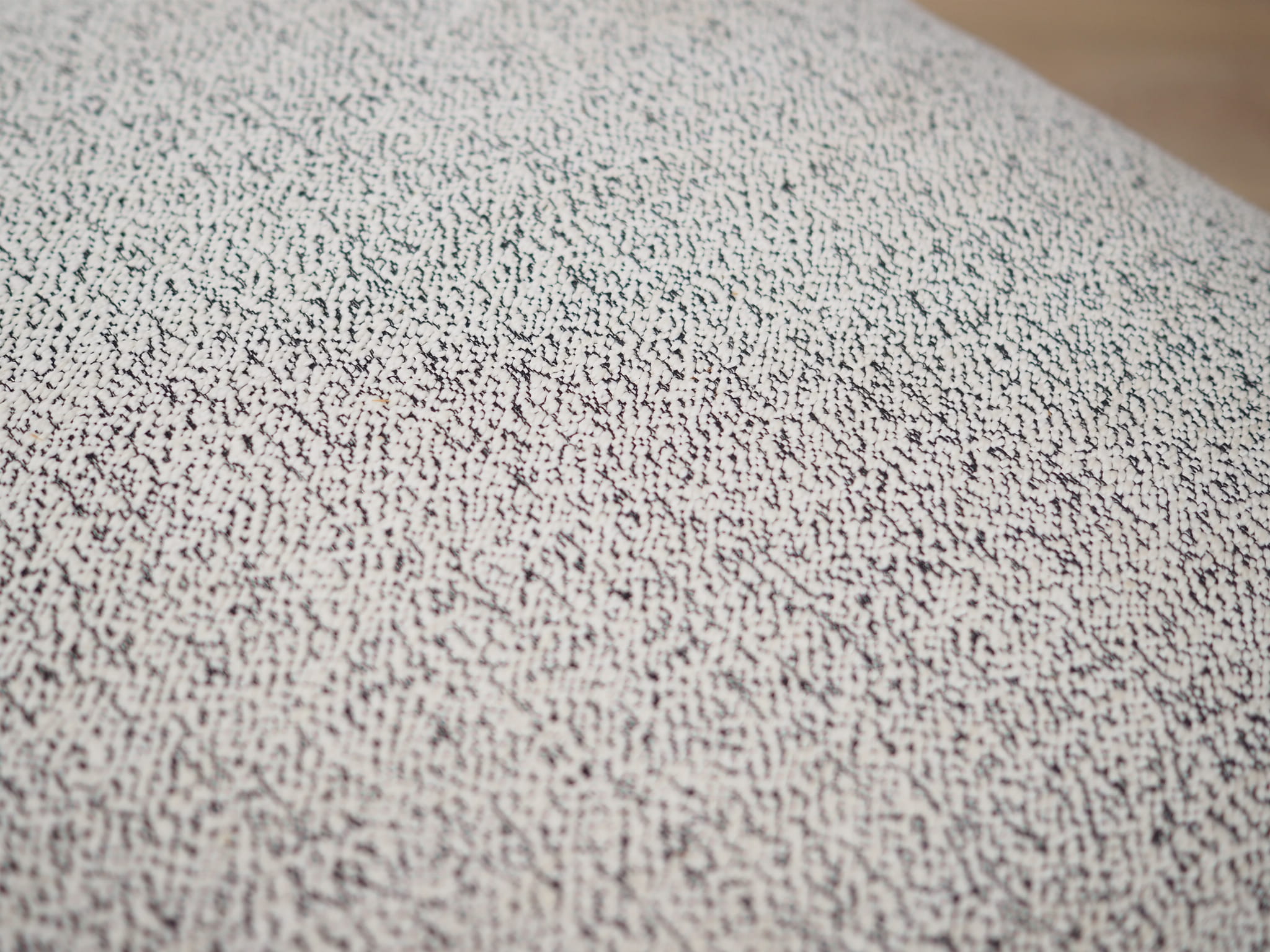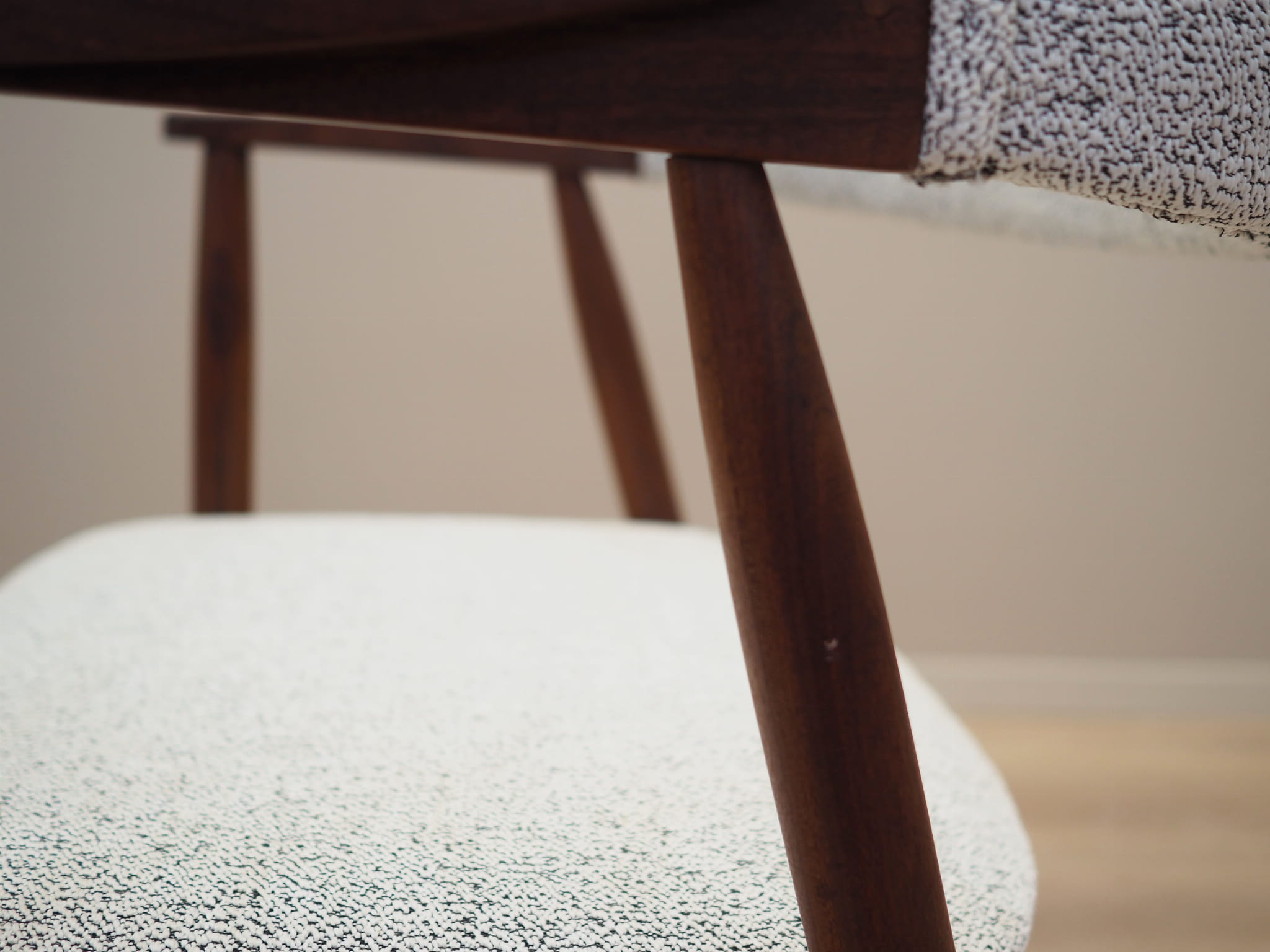 The structure is made of teak wood. The wood has been refreshed. The chair has new upholstery. The upholstery is made in white and black and uses high-quality fabric with an irregular weave.