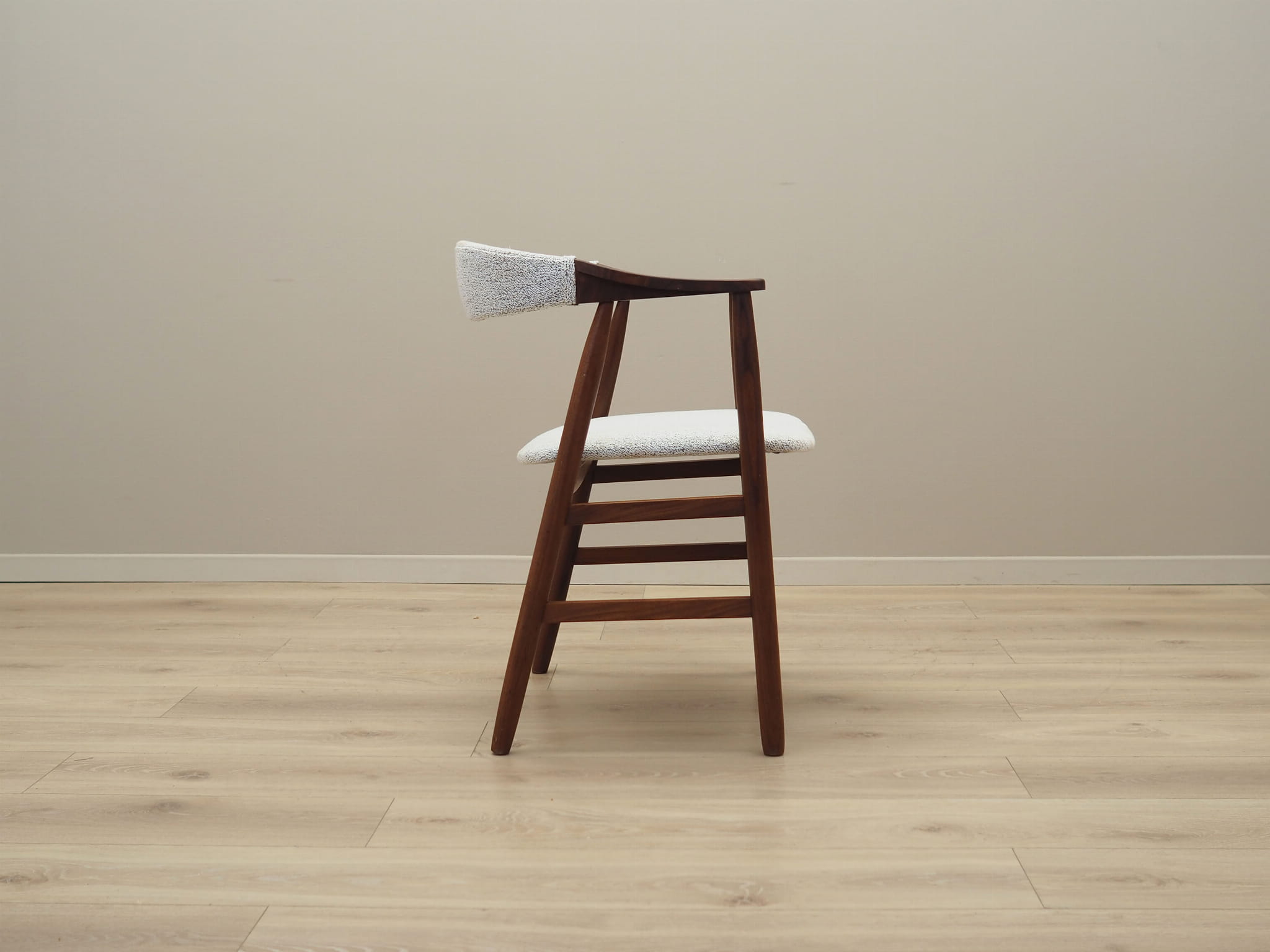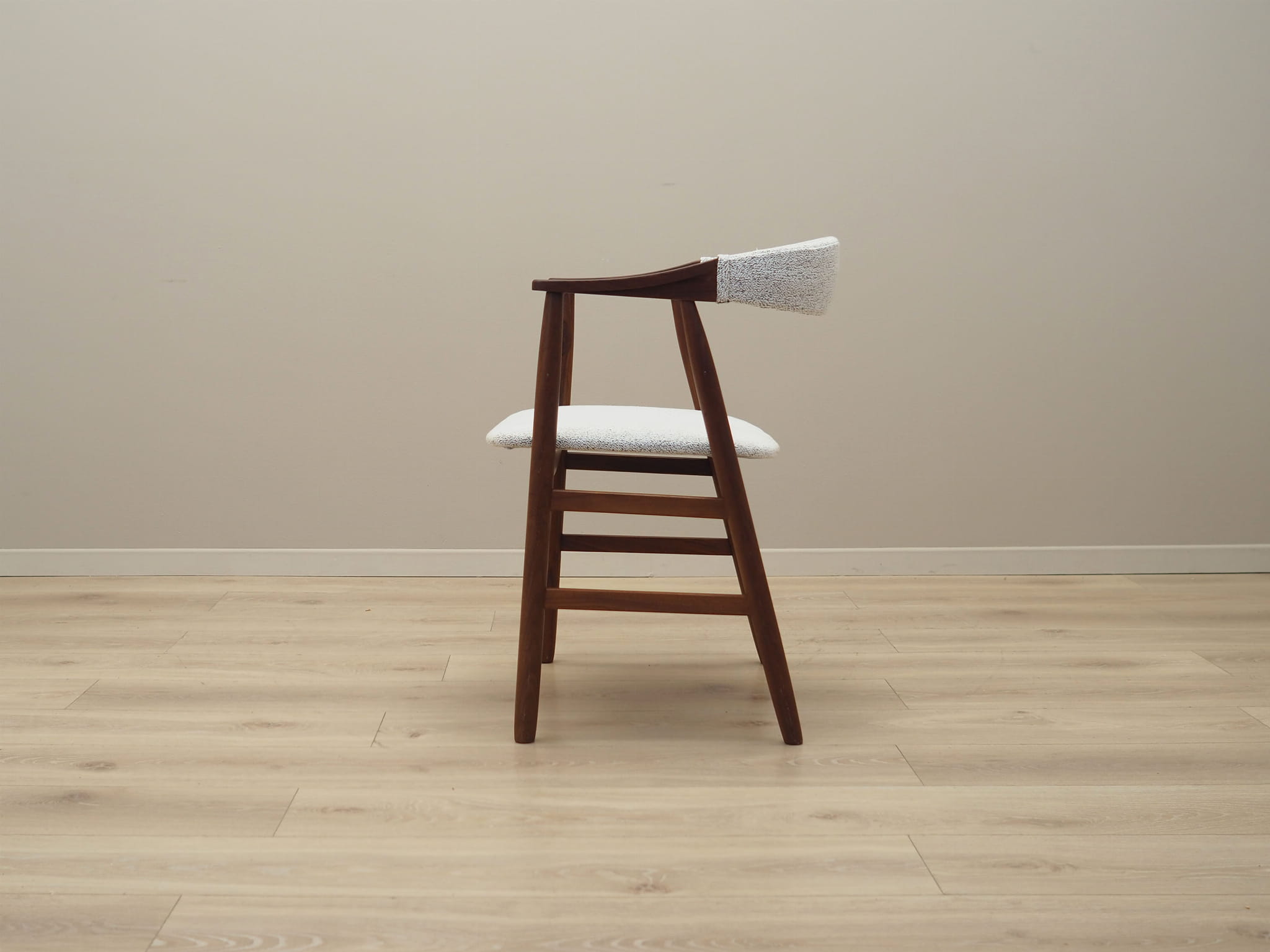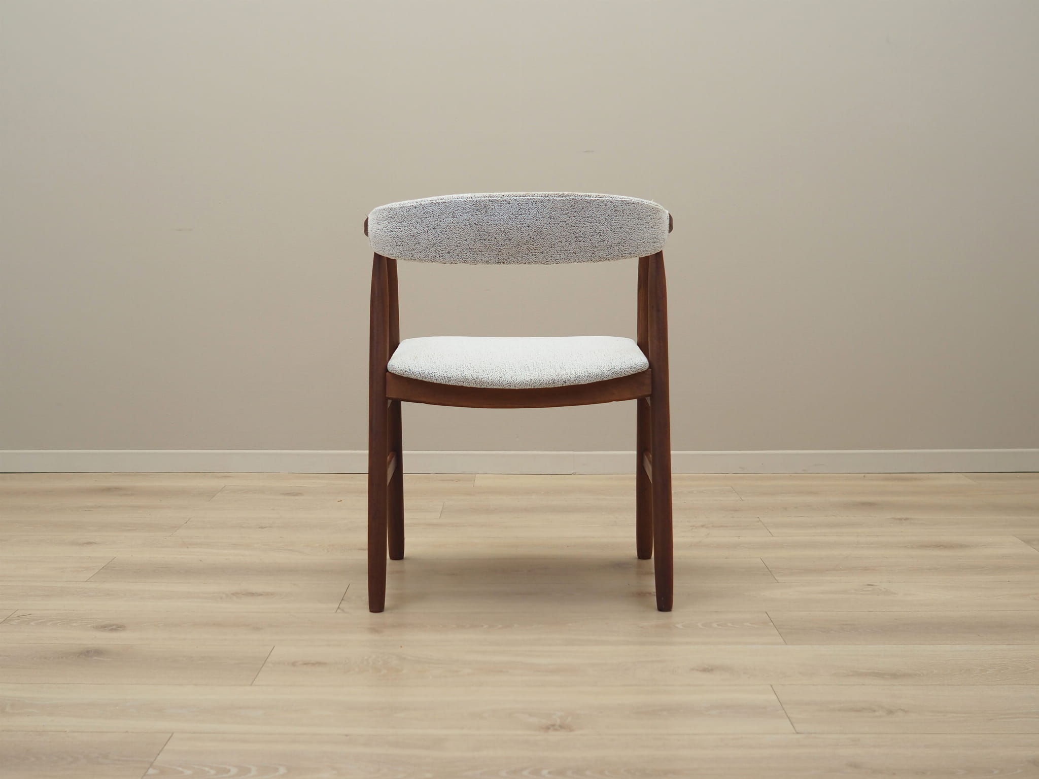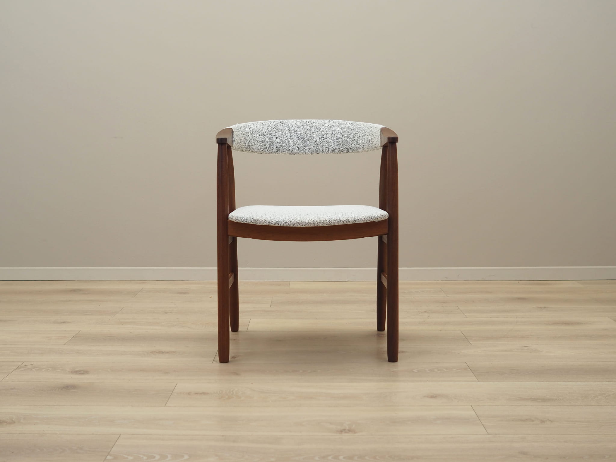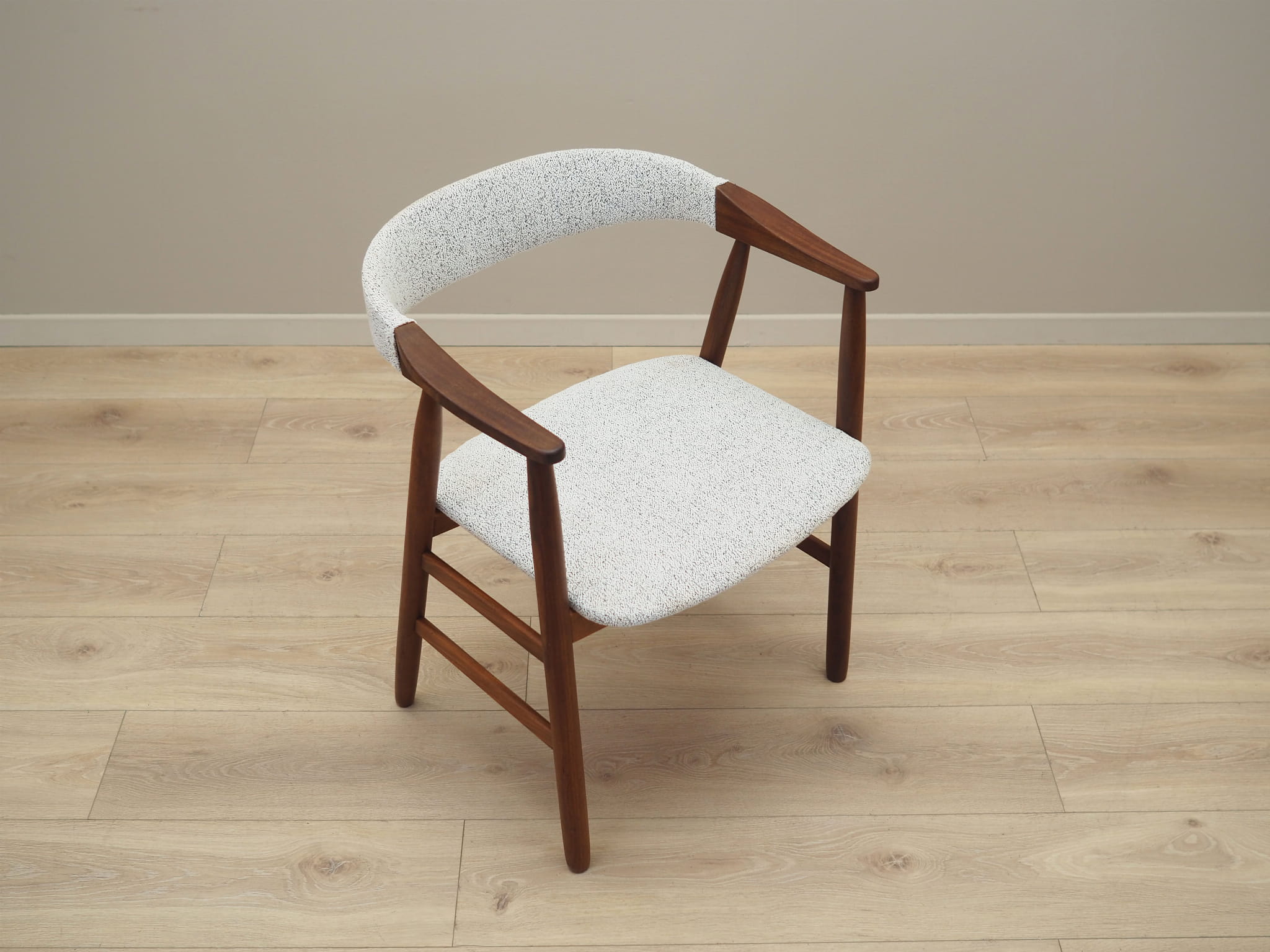The structure is made of teak wood. The wood has been refreshed. The chair has new upholstery. The upholstery is made in white and black and uses high-quality fabric with an irregular weave.