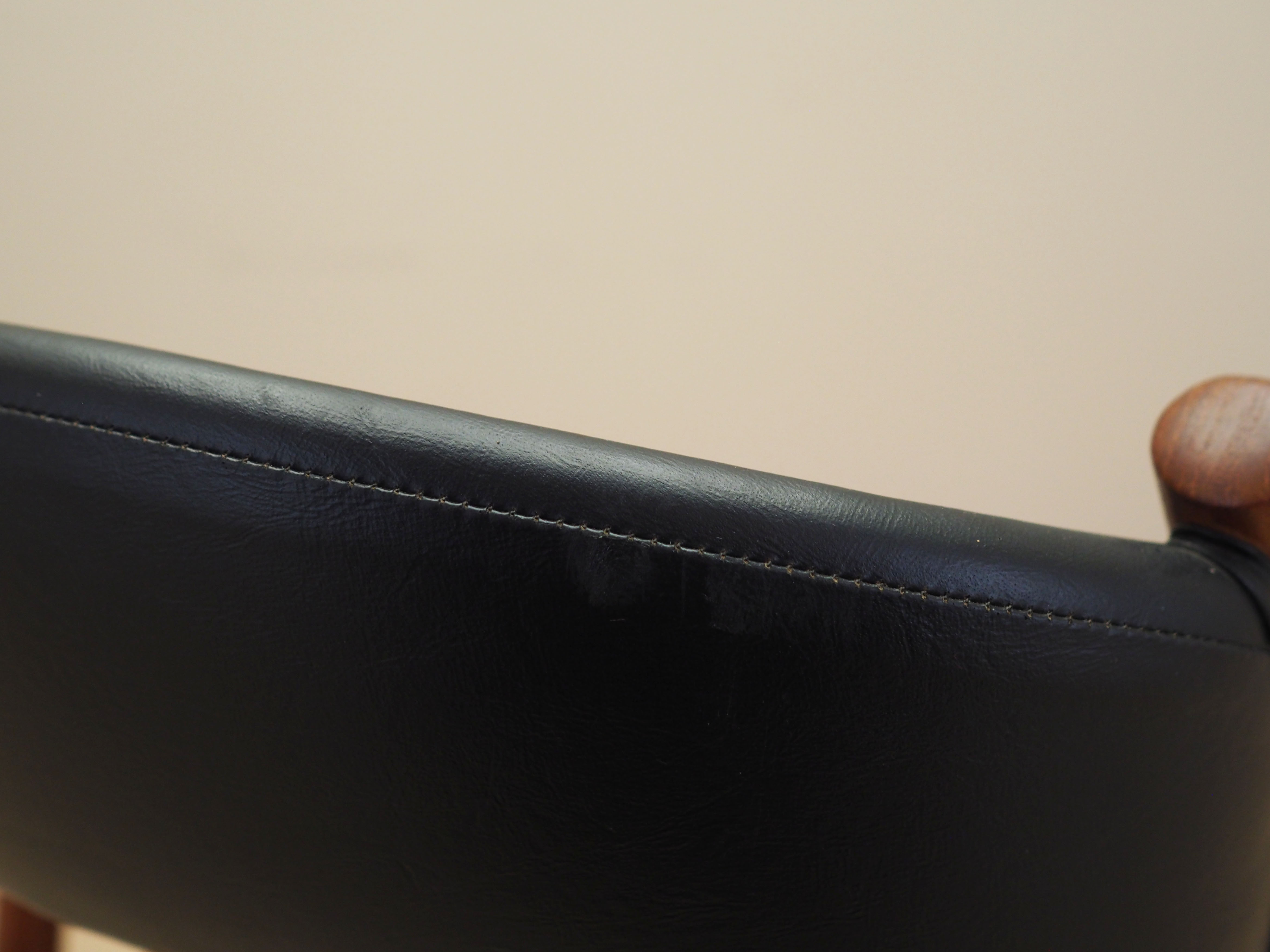 The structure is made of solid teak wood. The wood has been refreshed. The upholstery is made in black, high-quality eco leather has been used.