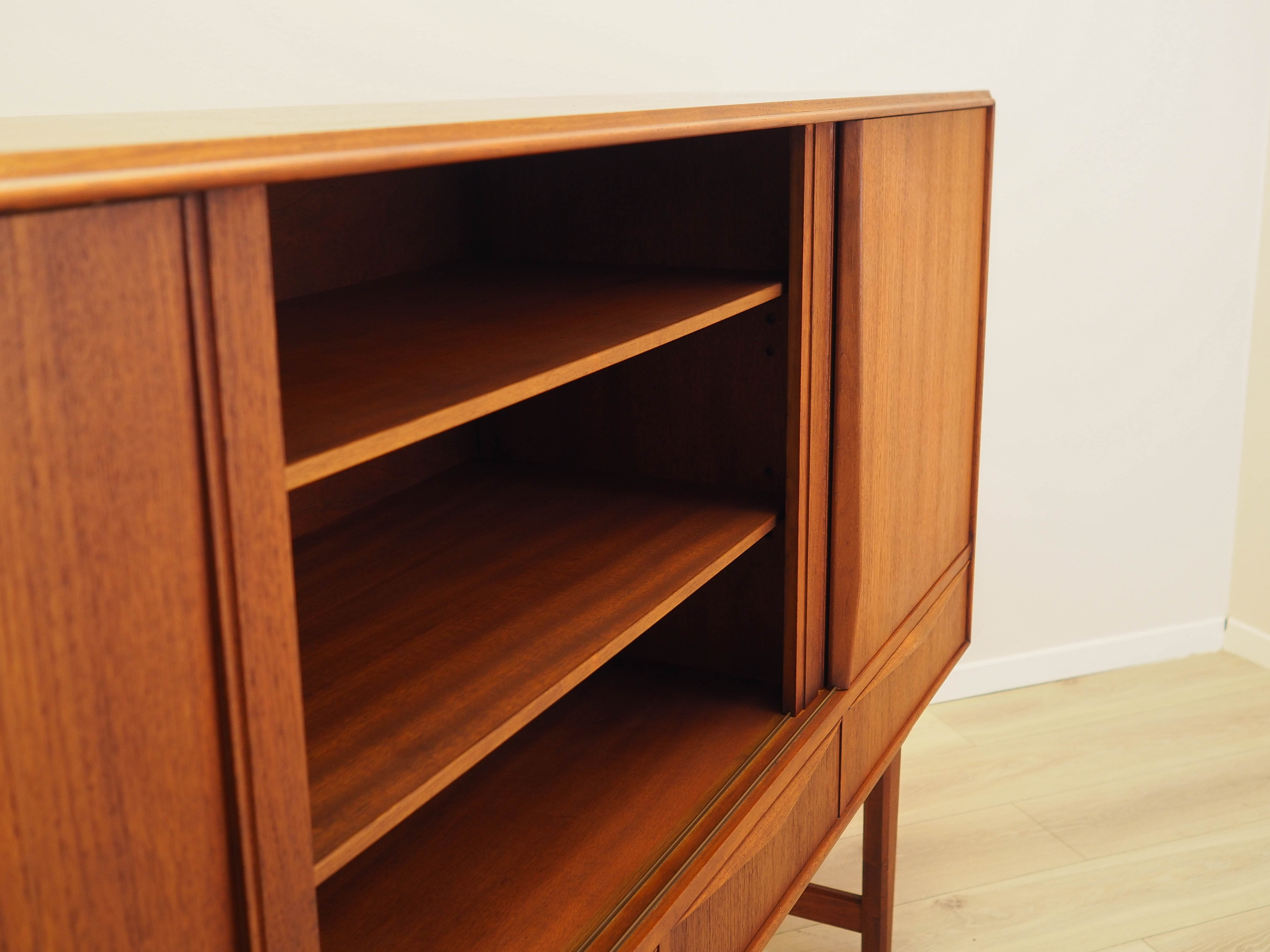 The structure is covered in teak veneer. The legs are made of solid wood. The surface has been refurbished. Inside, the space is fitted with three height-adjustable shelves and four practical drawers. The highboard features a convenient sliding door system, which reduces the need to leave a large amount of free space in front of the unit whilst not restricting access to its interior. An additional feature of the unit is a versatile bar section, which includes a decorative mirror and two additional small drawers.