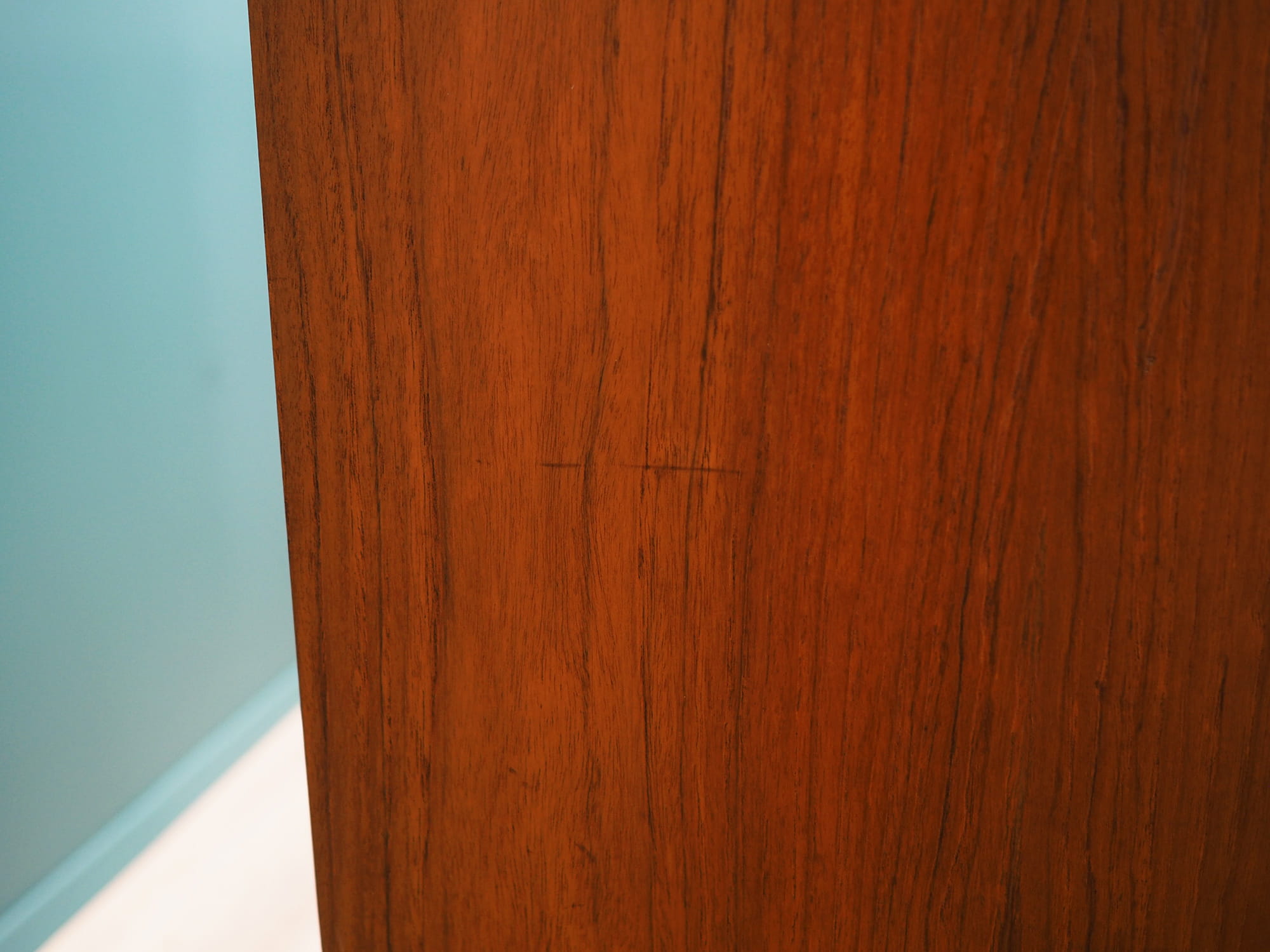 The structure is covered with teak veneer. The legs and handles are made of solid teak. The surface has been refreshed. Inside, the space has been filled with practical shelves and drawers, the shelves can be adjusted in height.The chest of drawers has a practical solution of sliding doors, which reduces the need to leave a large free space in front of the furniture while not restricting access to the inside of the furniture. In addition, the sliding doors are the ideal solution to use the furniture for audio equipment.