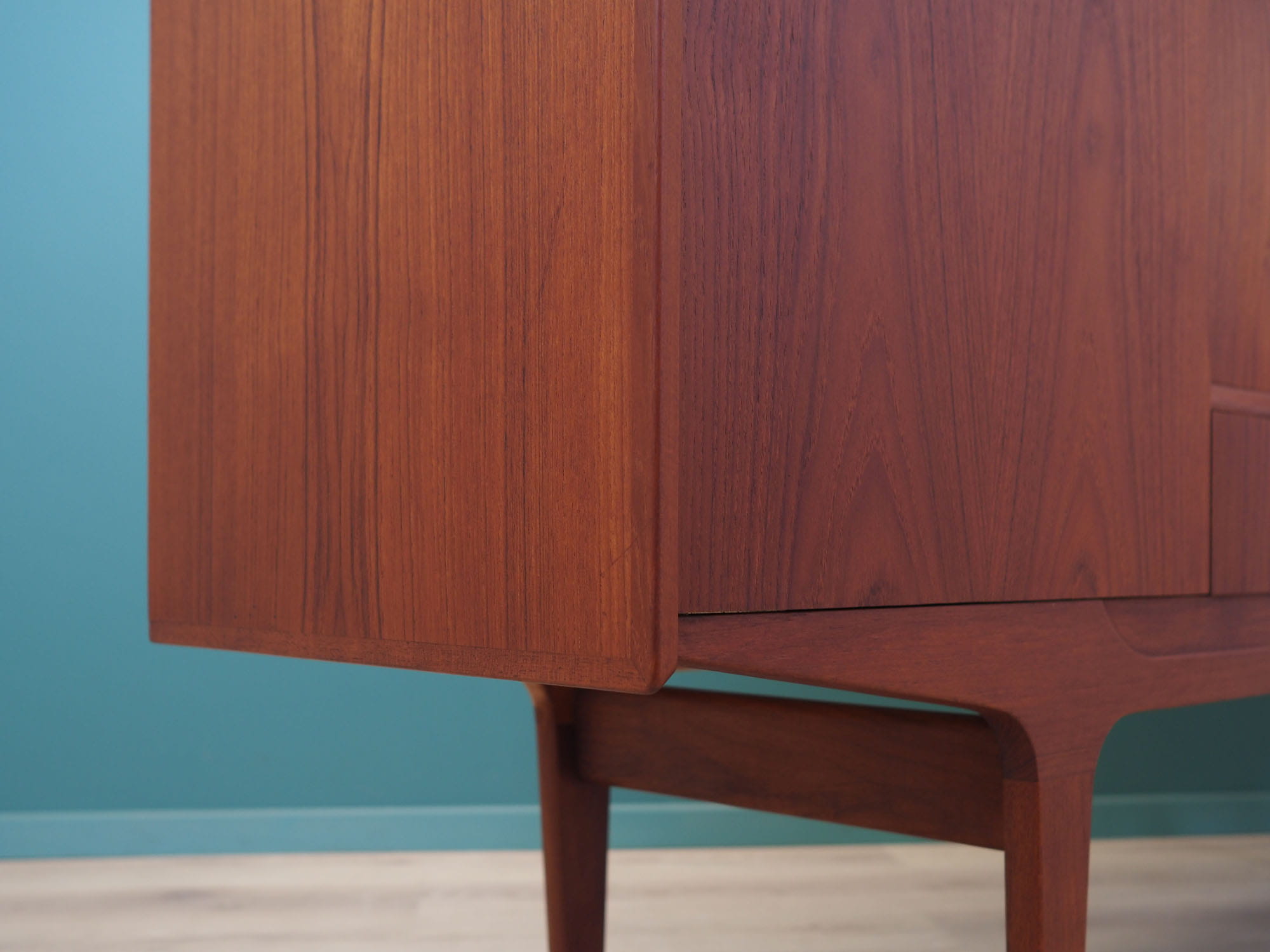 The structure is covered with teak veneer. Legs and handles are made of solid wood. Surface after refreshing. Inside the space has been filled with five practical shelves with height adjustment and six drawers. A practical solution of both sliding and opening doors has been applied. The locks work, keys included.