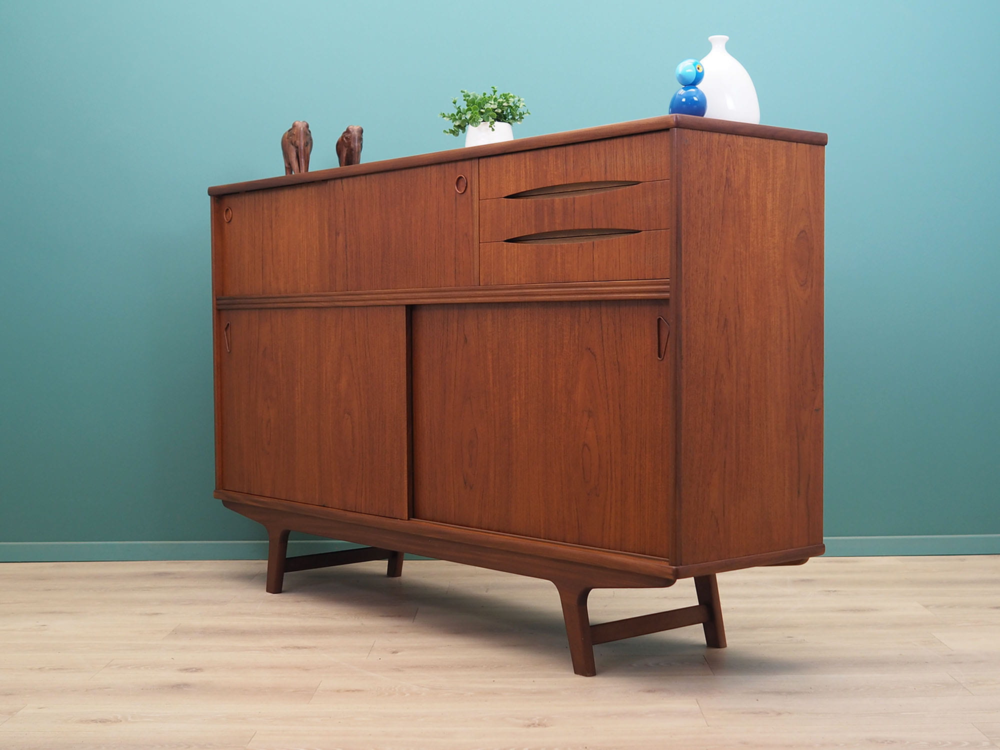 The structure is covered with teak veneer. Legs and handles are made of solid wood. Surface after refreshing. Inside the space has been filled with three practical shelves without height adjustment and six drawers. Highboard has a convenient solution of sliding doors, thanks to which we reduce the need to leave a large free space in front of the furniture, while not restricting access to its interior.