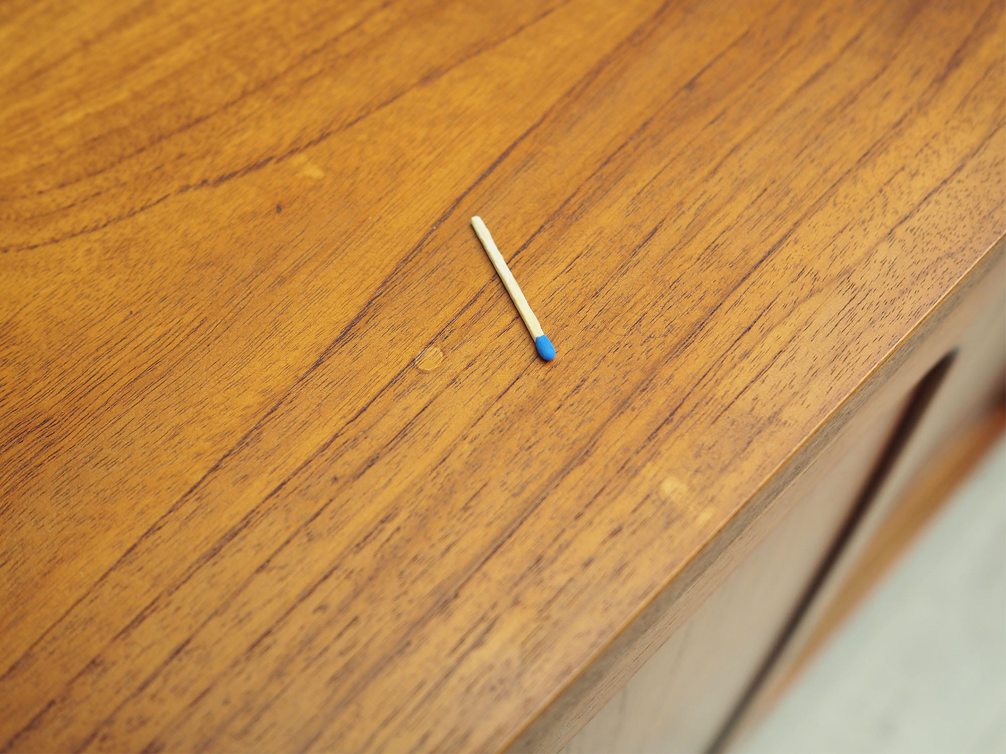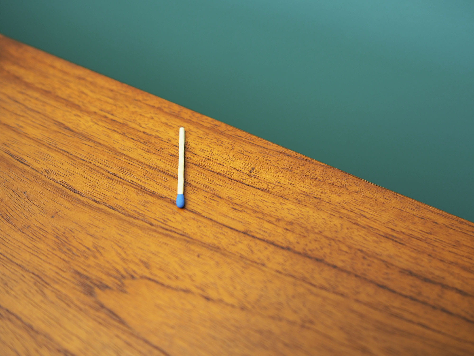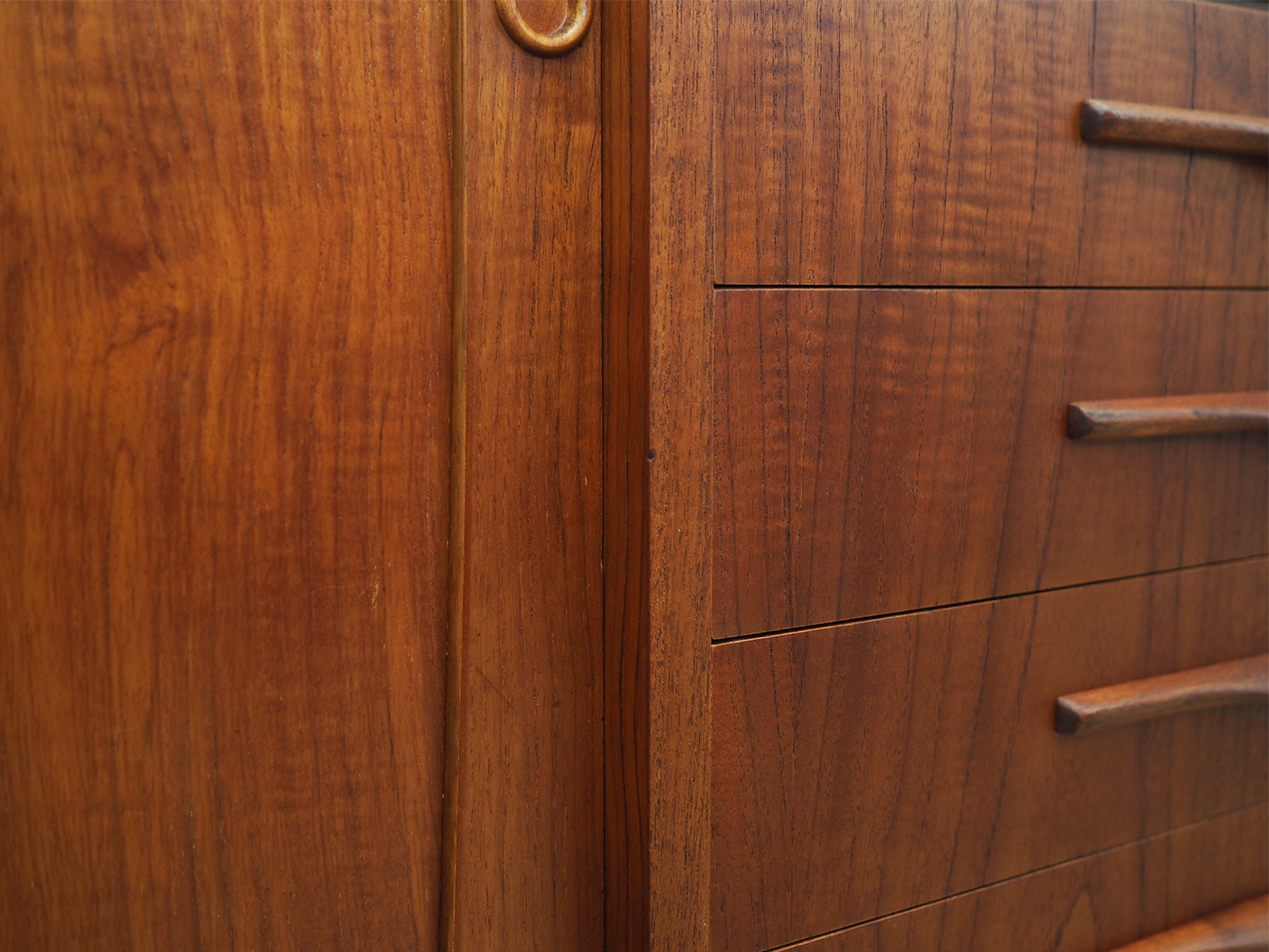 The structure is covered with teak veneer. Legs and handles are made of solid wood. Surface after refreshing. Inside the space has been filled with four practical shelves with height adjustment and four drawers. Highboard has a convenient sliding door solution, which reduces the need to leave a large free space in front of the furniture without restricting access to its interior. The furniture has two openings in the backboard for cables. An additional advantage is the illuminated bar. Key included.