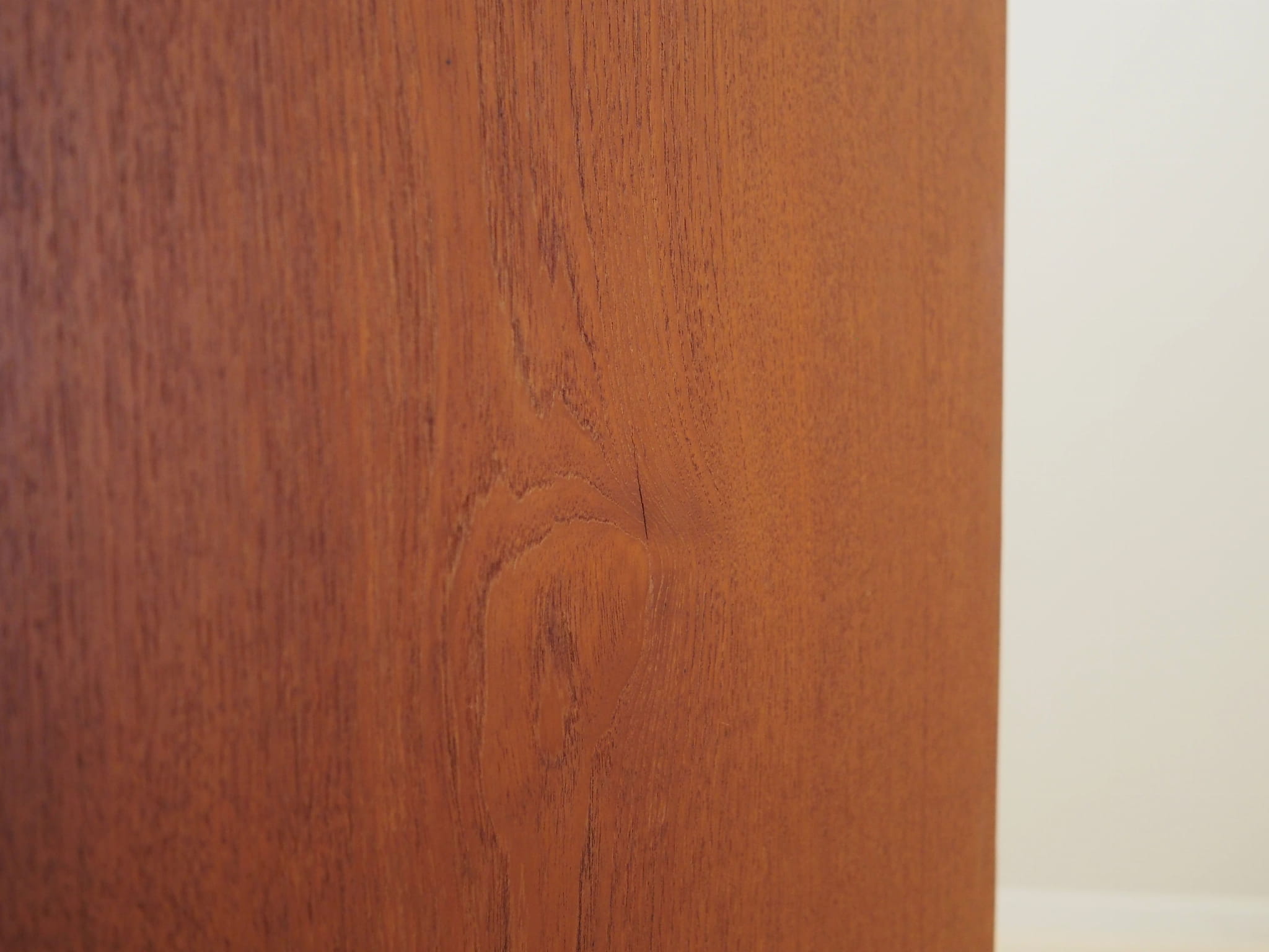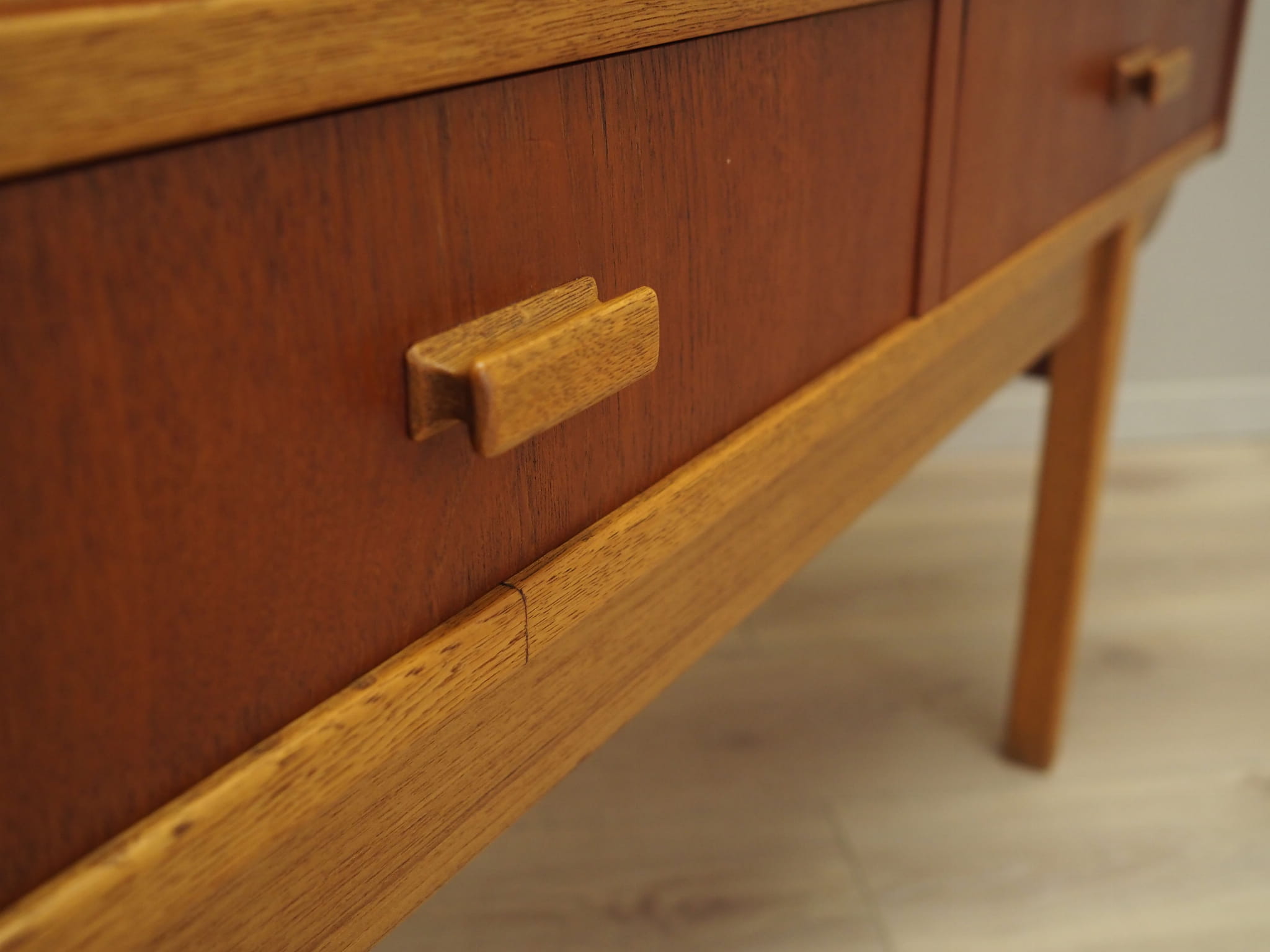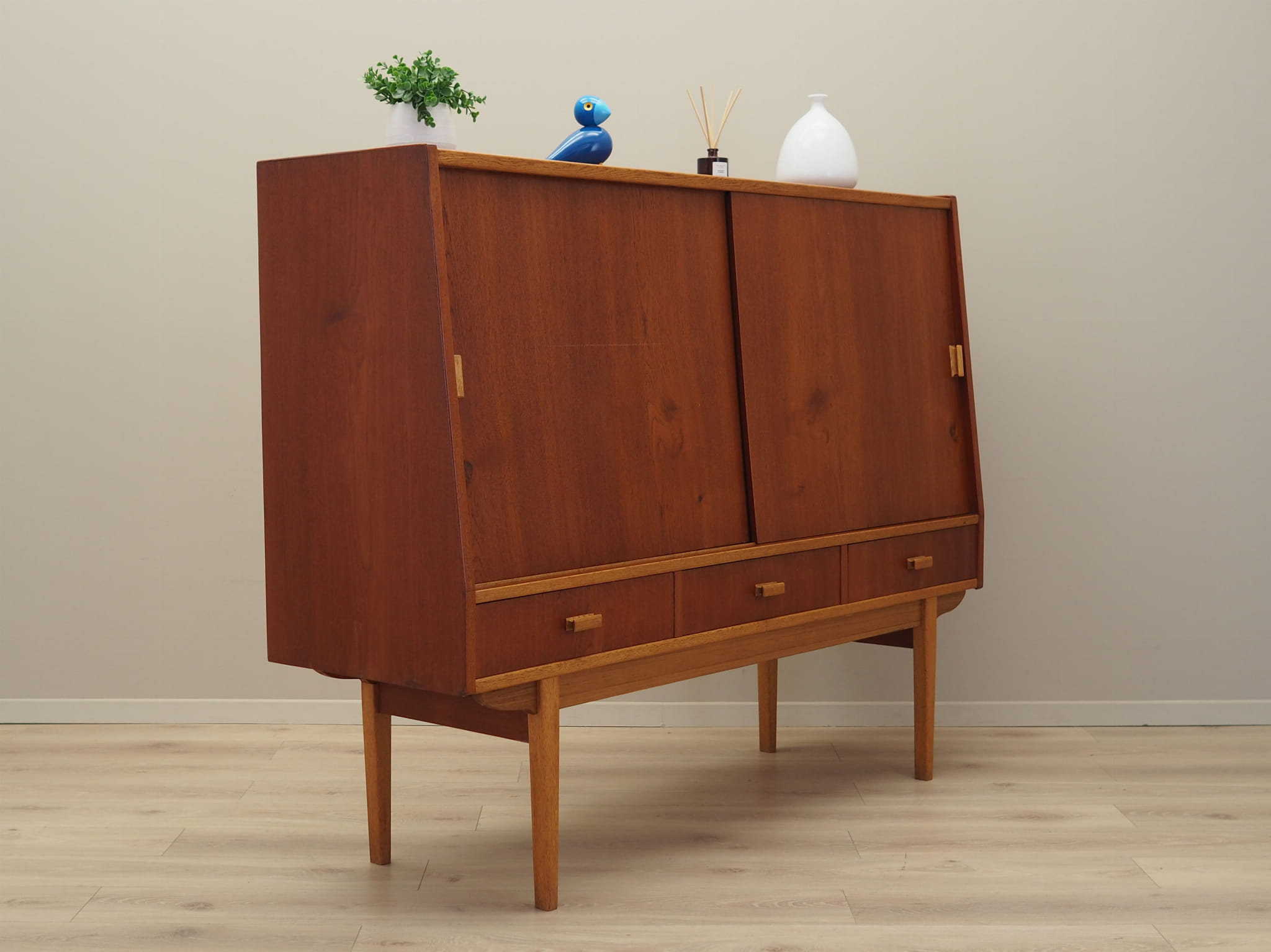 The structure is covered with teak veneer. The legs and handles are made of solid wood. The surface has been refreshed. Inside, the space has been filled with five practical non-adjustable shelves and three drawers. The Highboard has a convenient sliding door solution, which reduces the need to leave a large free space in front of the furniture while not restricting access to the interior. In addition, the sliding doors are the ideal solution for using the furniture under audio equipment.