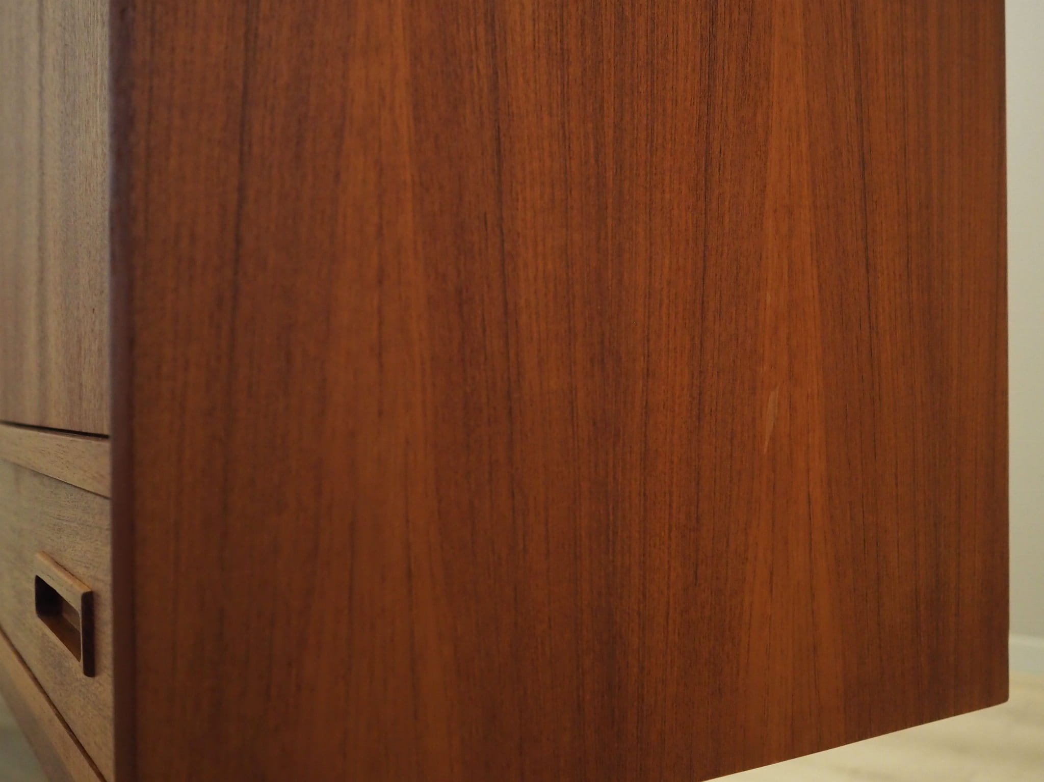 The structure is covered with teak veneer. The legs are made of solid wood. The surface after refreshing. Inside, the space has been filled with two height-adjustable shelves and two practical drawers. The highboard has a convenient sliding door solution, which reduces the need to leave a large free space in front of the furniture, while not restricting access to its interior. An additional advantage is the universal bar, inside of which there is a decorative mirror and a non-adjustable shelf.