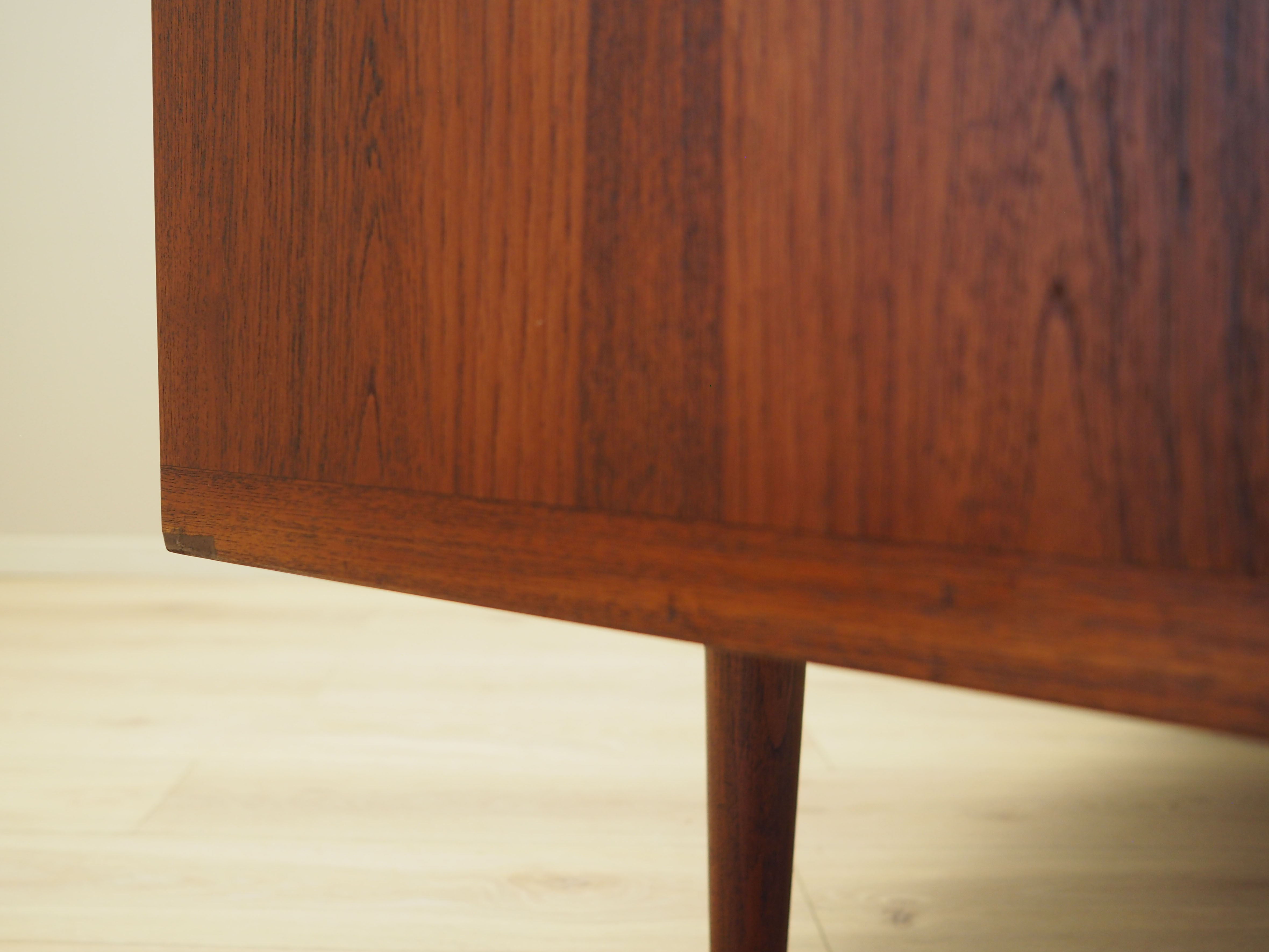 The structure is covered with teak veneer. The legs are made of solid wood. Surface after refreshing. Inside, the space has been filled with four capacious drawers and five practical height-adjustable shelves. The furniture has a practical sliding door solution, which reduces the need to leave a large free space in front of the furniture, while not restricting access to the interior.