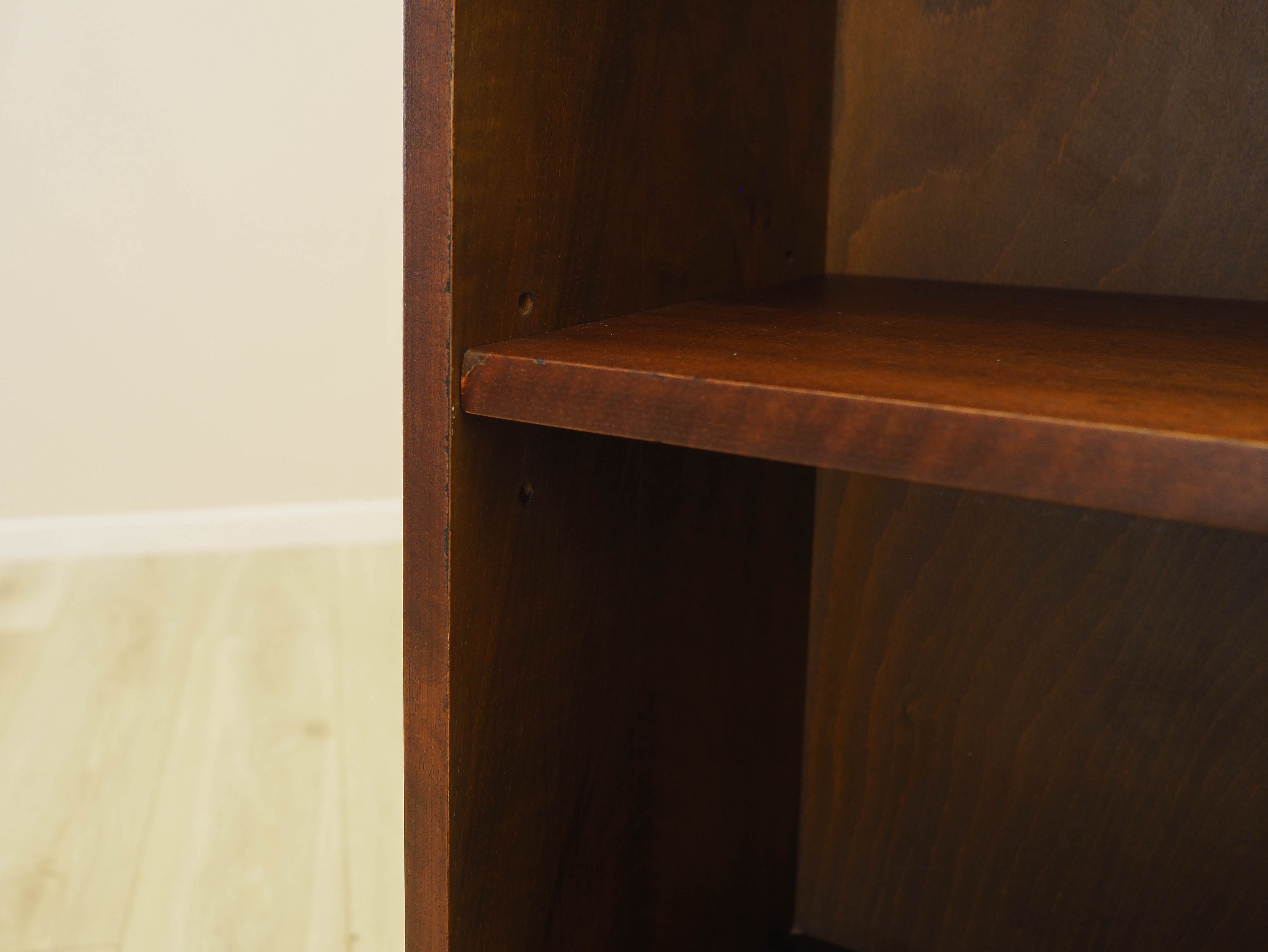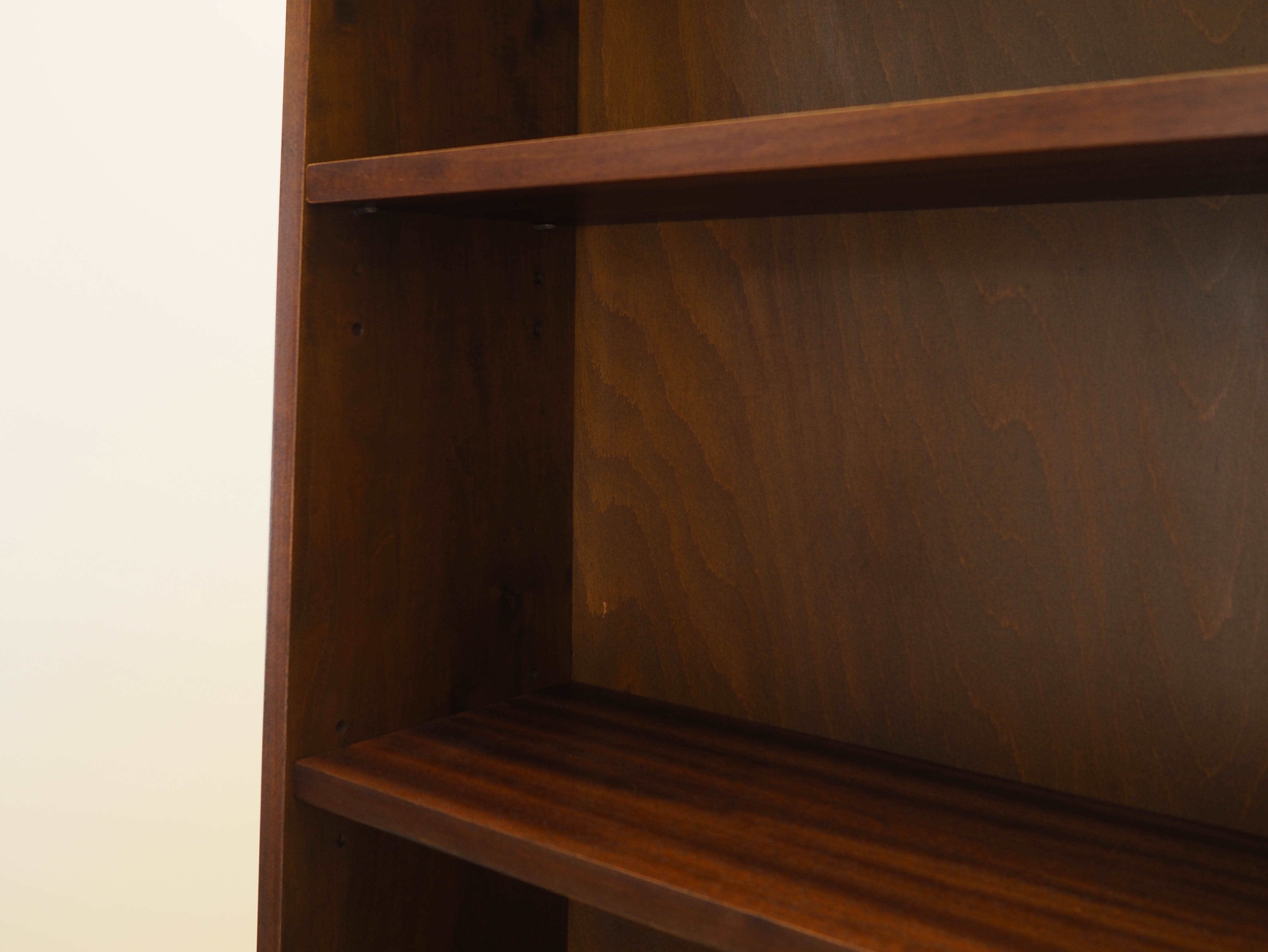 The structure is covered in walnut veneer. The legs are made of solid wood. Inside, the space is fitted with four practical shelves. The second shelf from the bottom is not height-adjustable. The bookcase is the ideal solution for a large book collection in a small living space.
