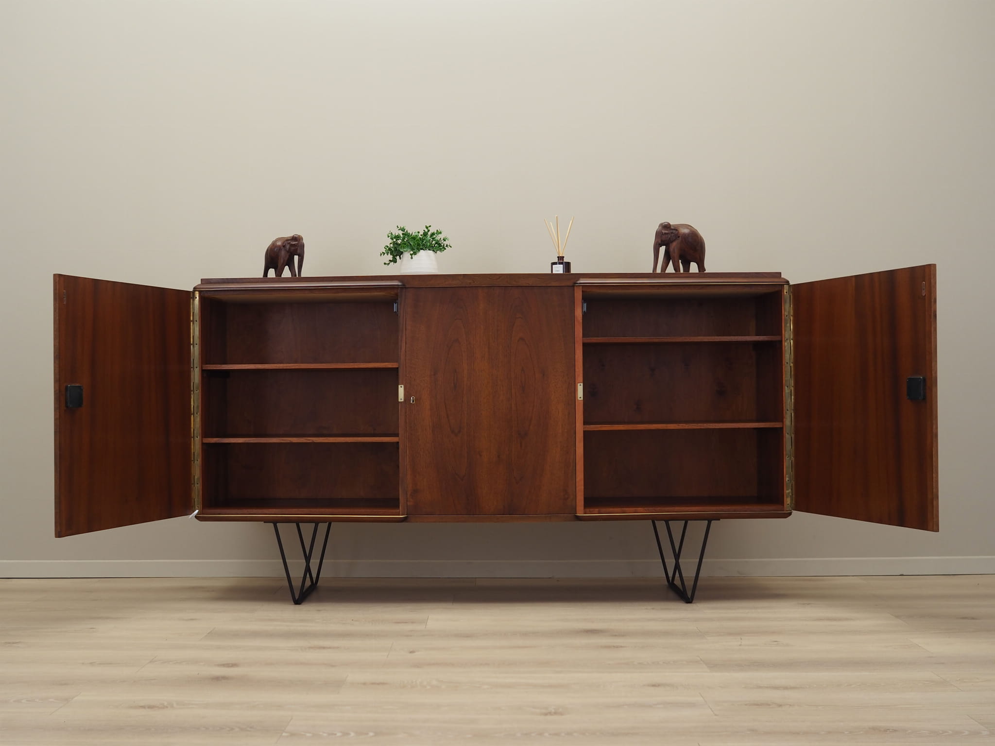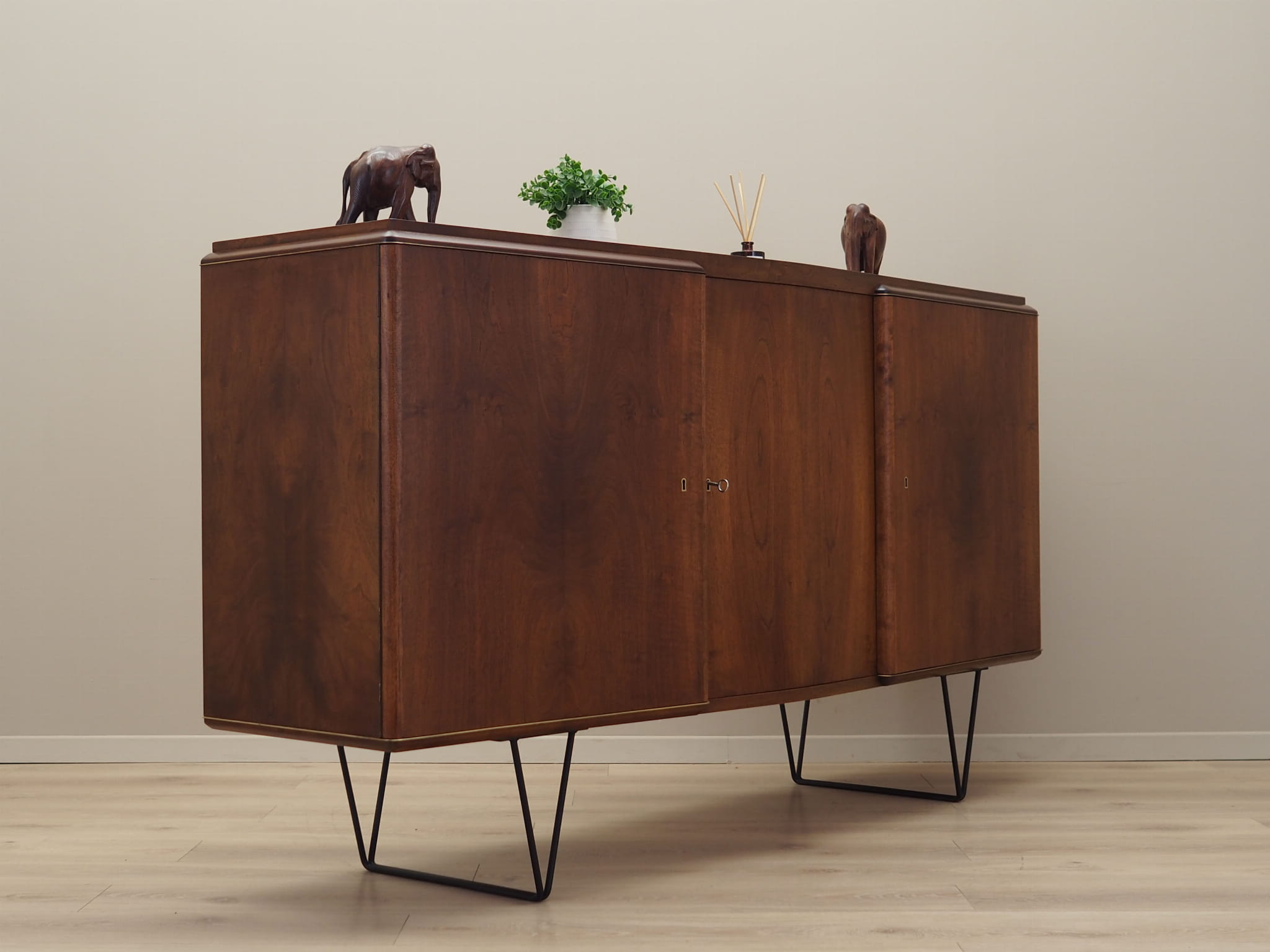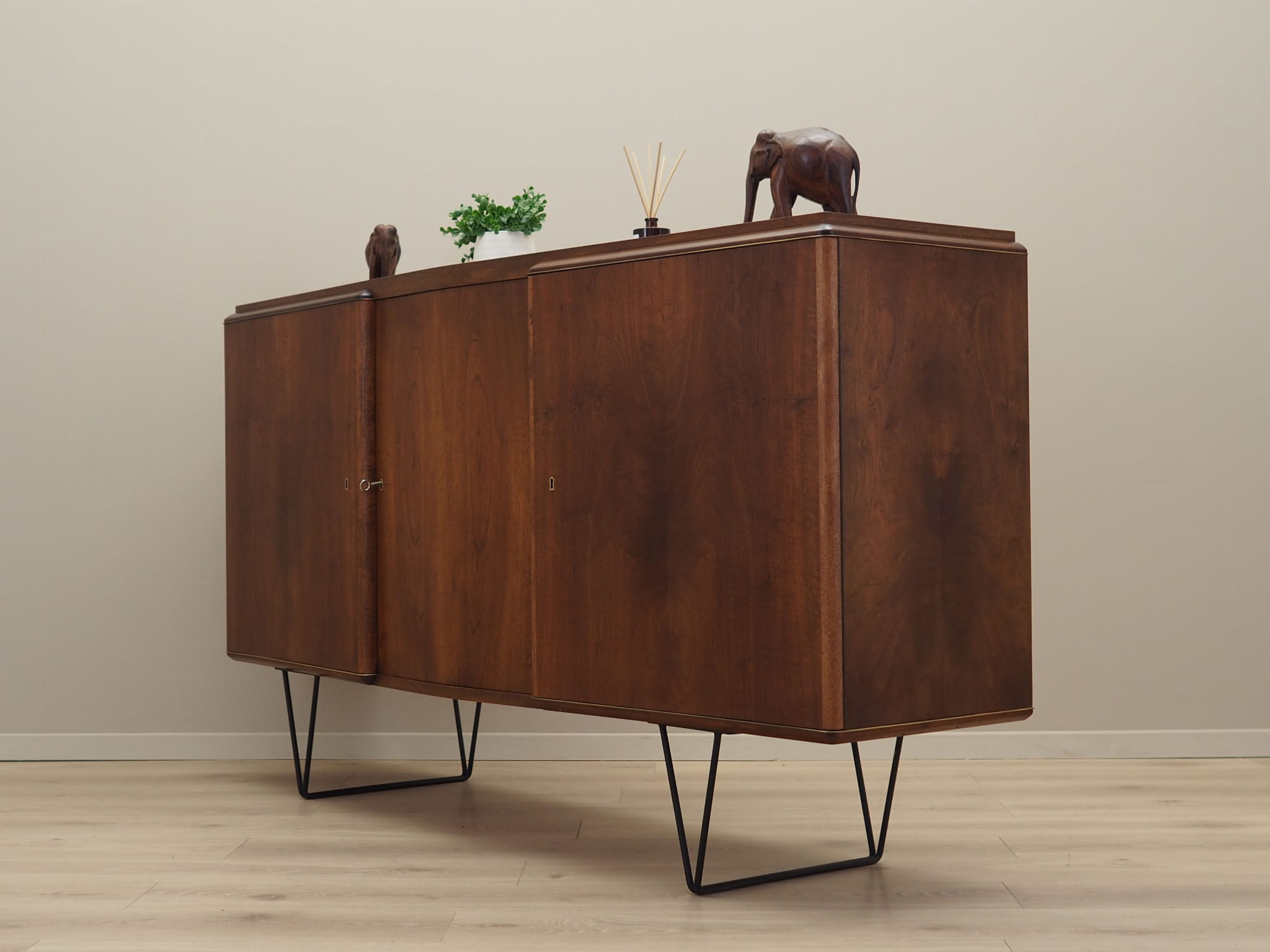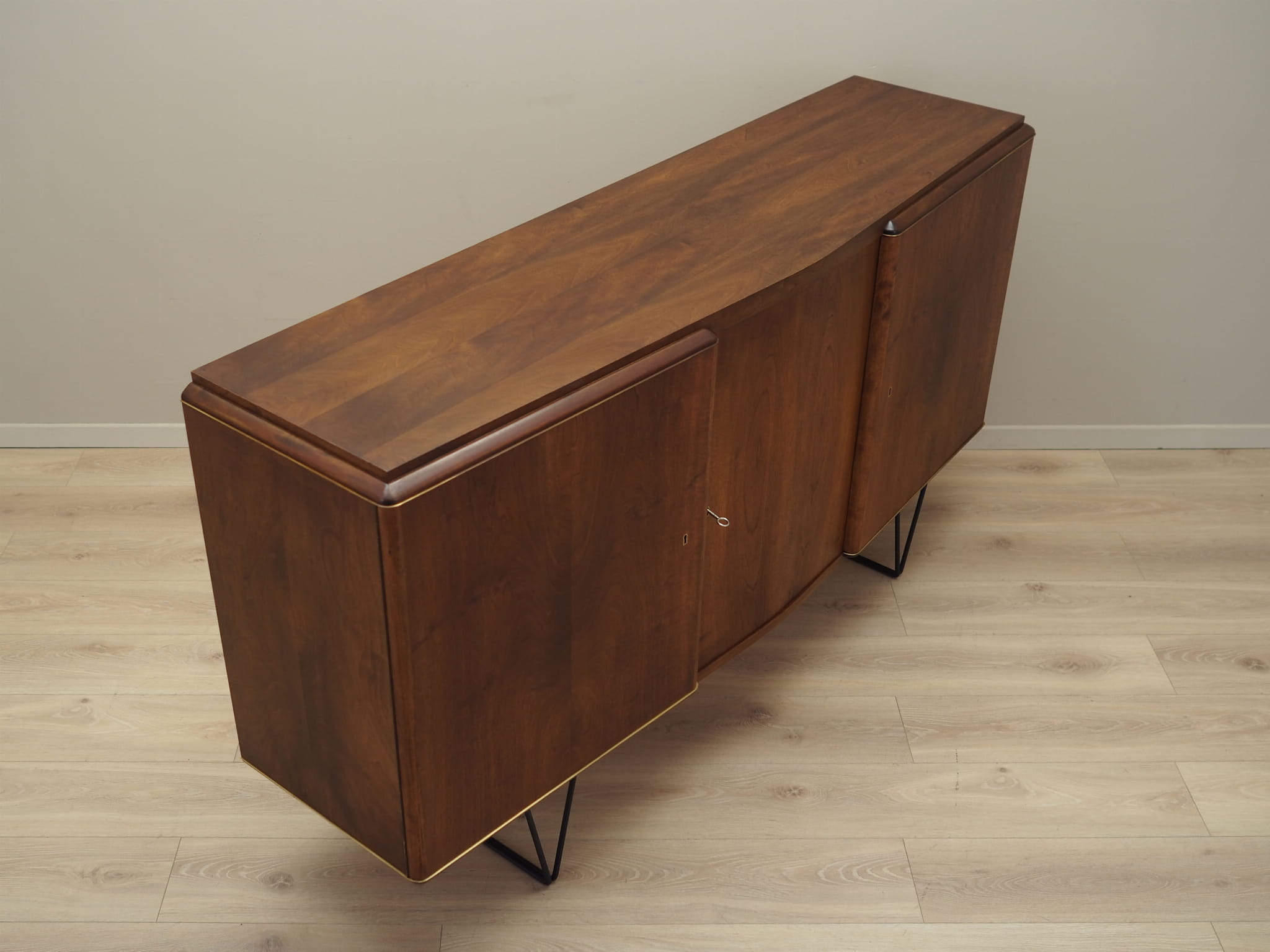 The structure is covered with walnut veneer. Legs made of metal stained black. Surface after refreshing. Inside, the space has been filled with four non-adjustable shelves and six practical drawers. Furniture with a classic solution of opening doors, thanks to which we have convenient access to the entire interior of the furniture. Functional lock in the middle door. Key included.