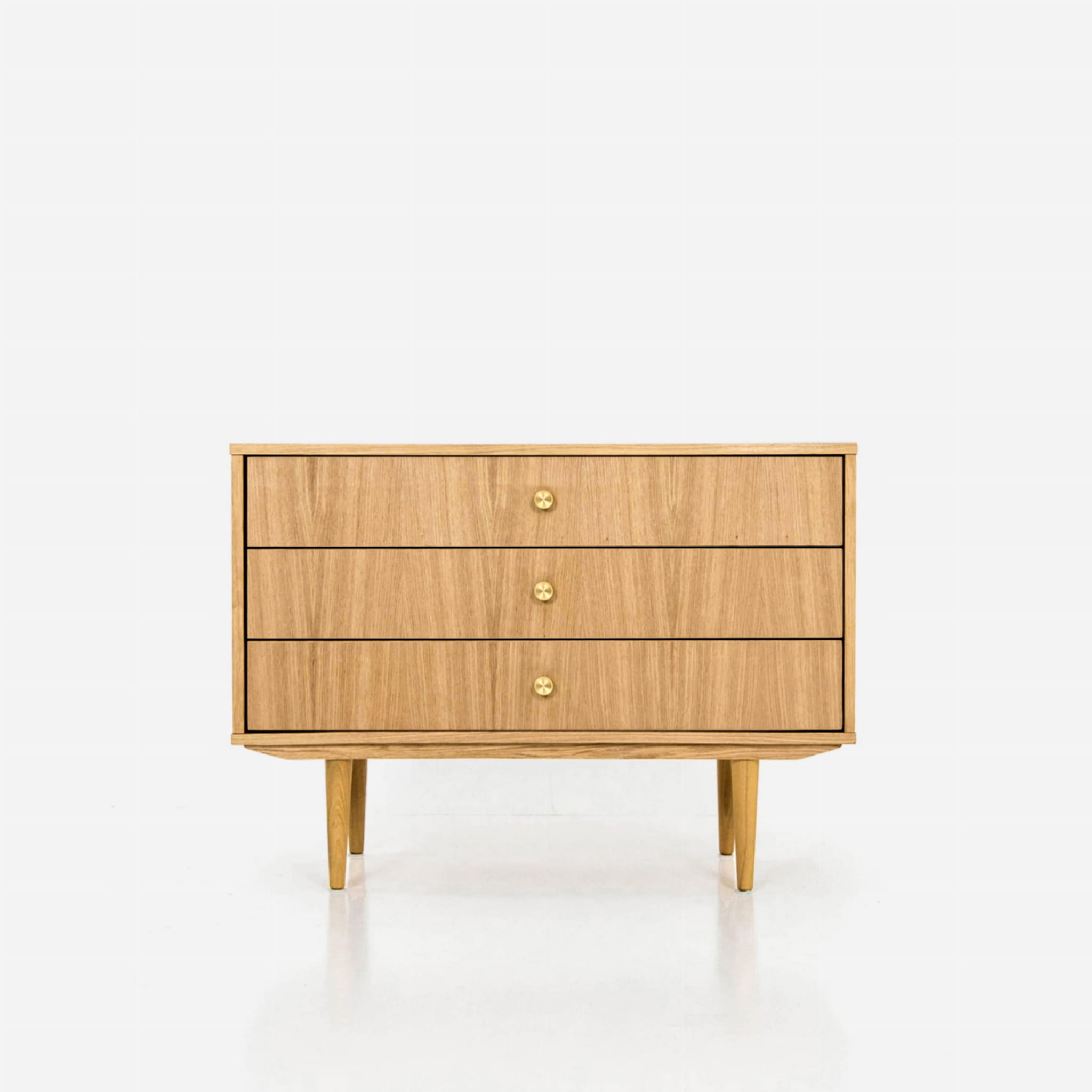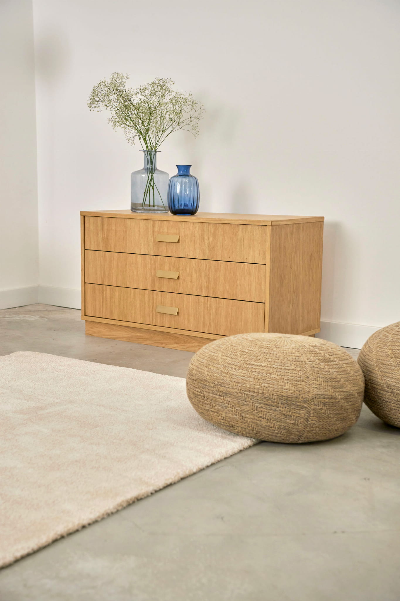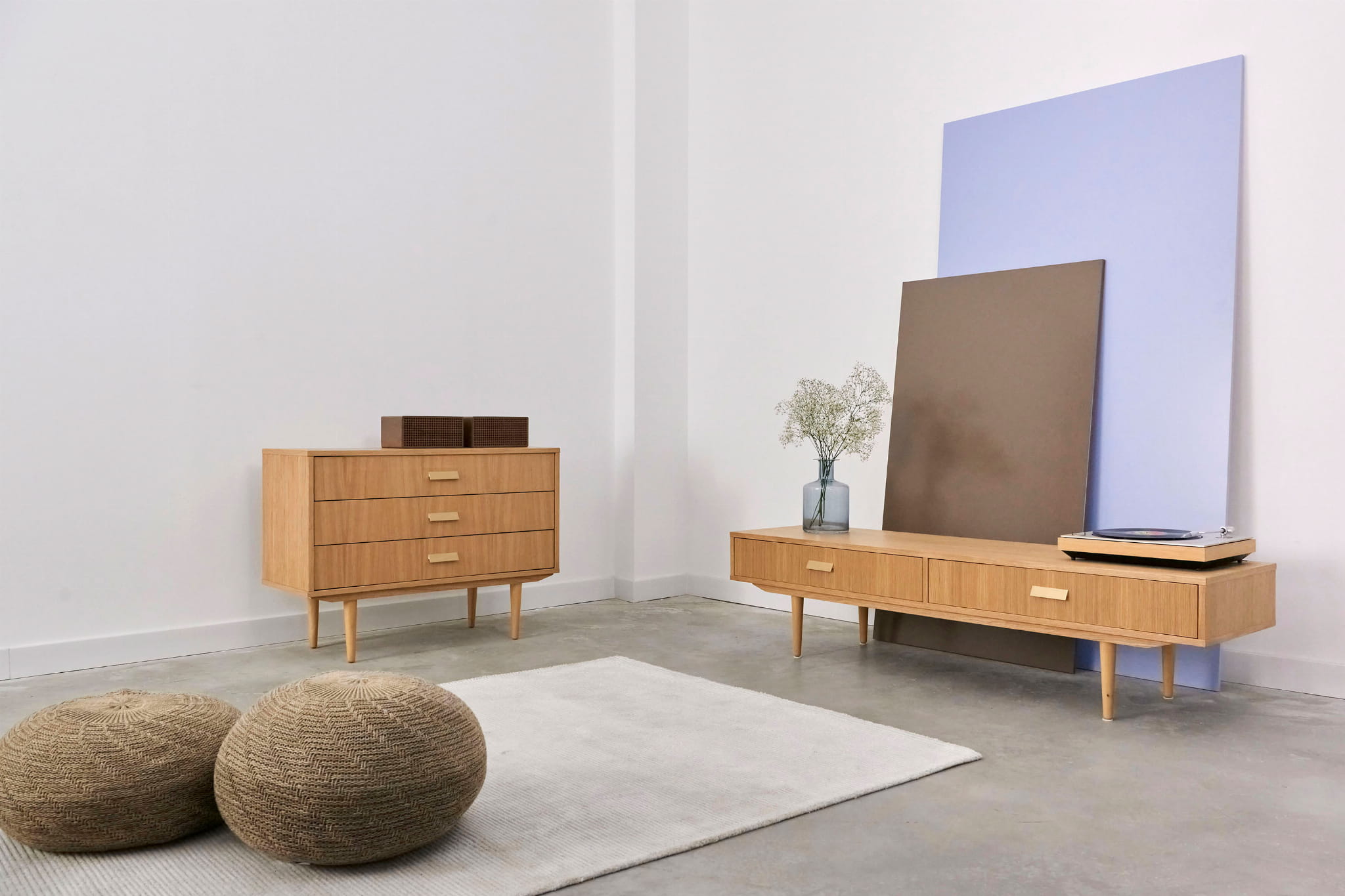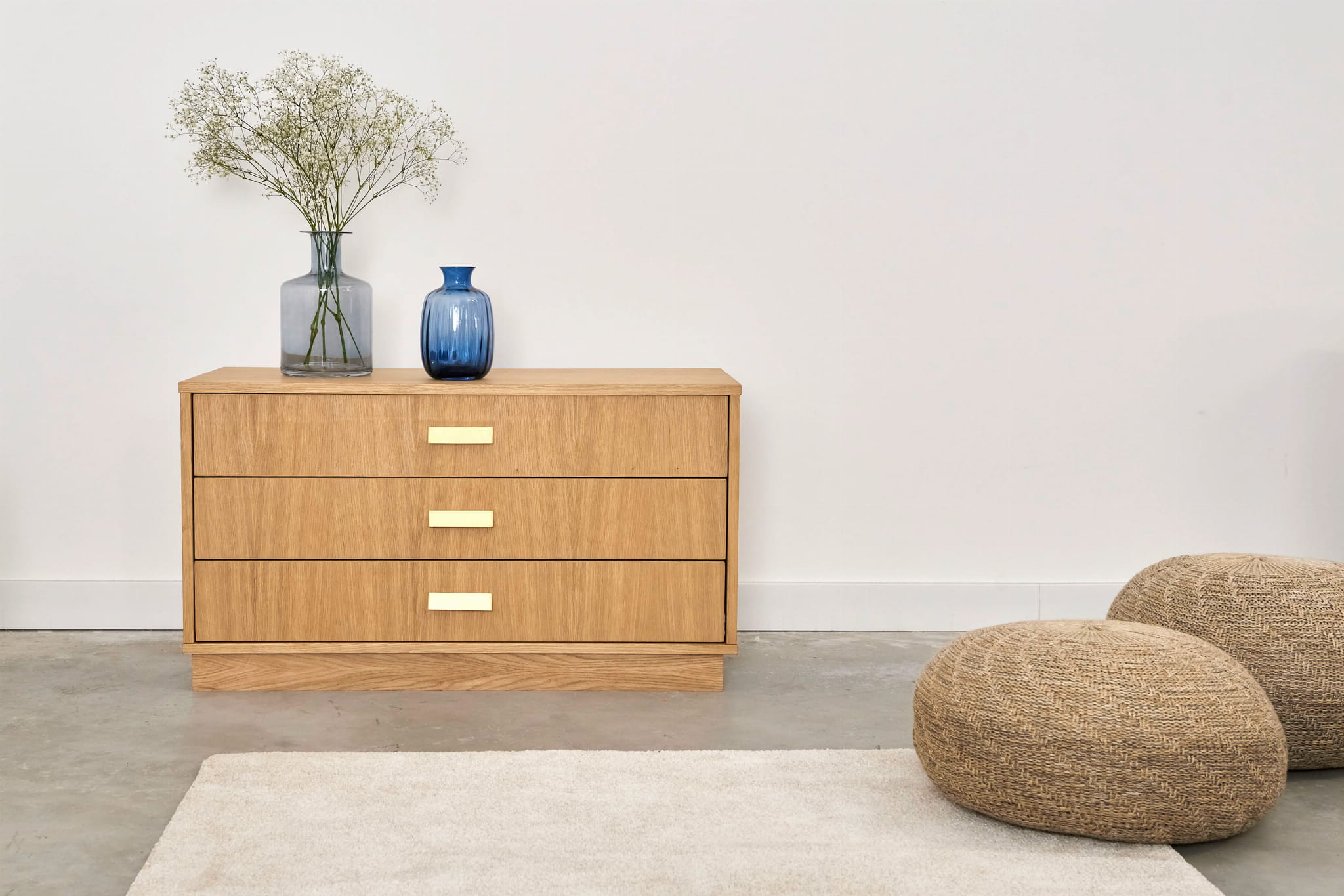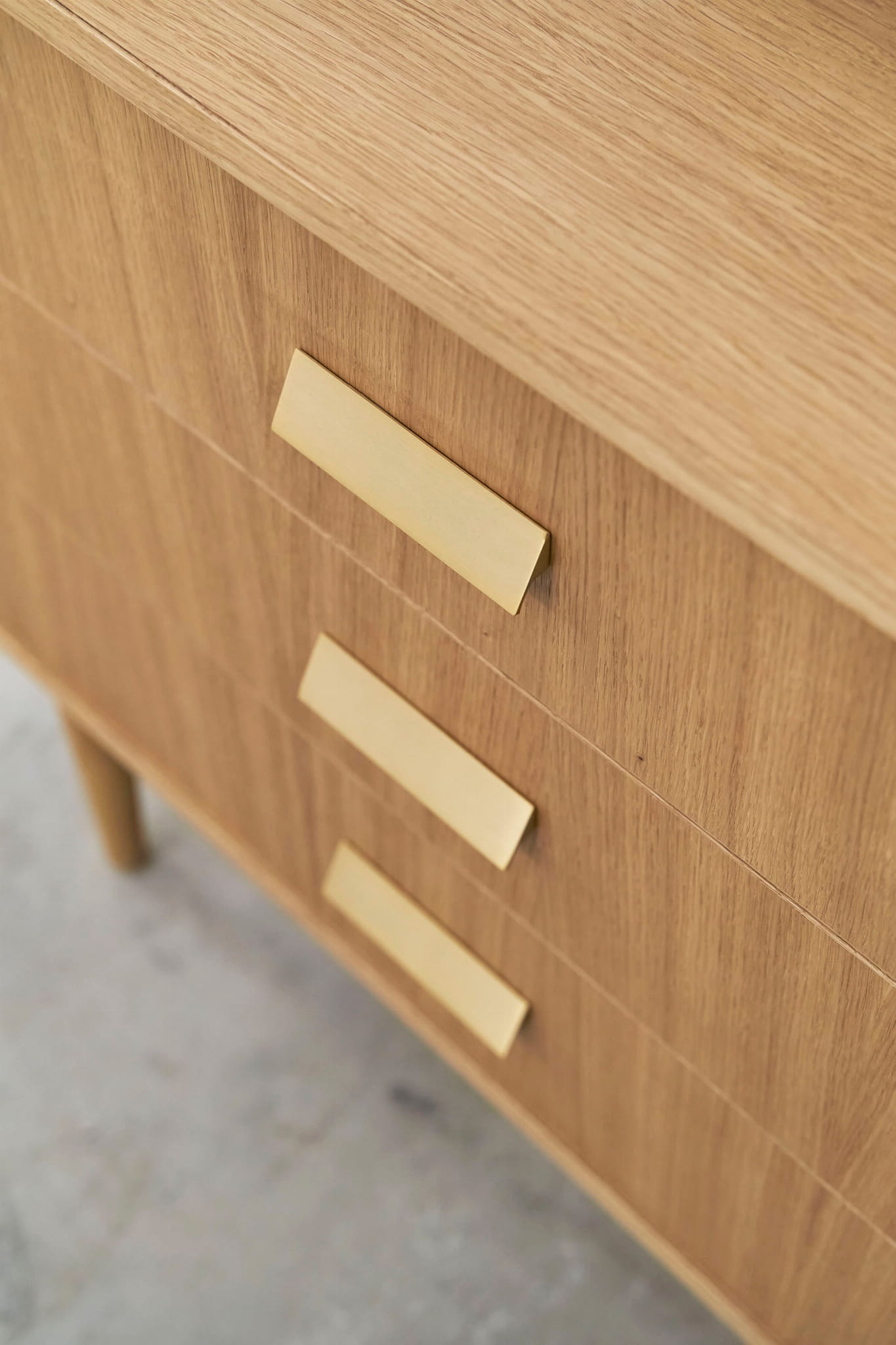 This exceptionally shapely cabinet can adorn stylish living rooms, but will find its way into virtually any interior. We have equipped our cabinet with three drawers on Blum concealed runners with the Blumotion system. Thanks to this system, opening and closing of drawers is a very light and extremely quiet process.