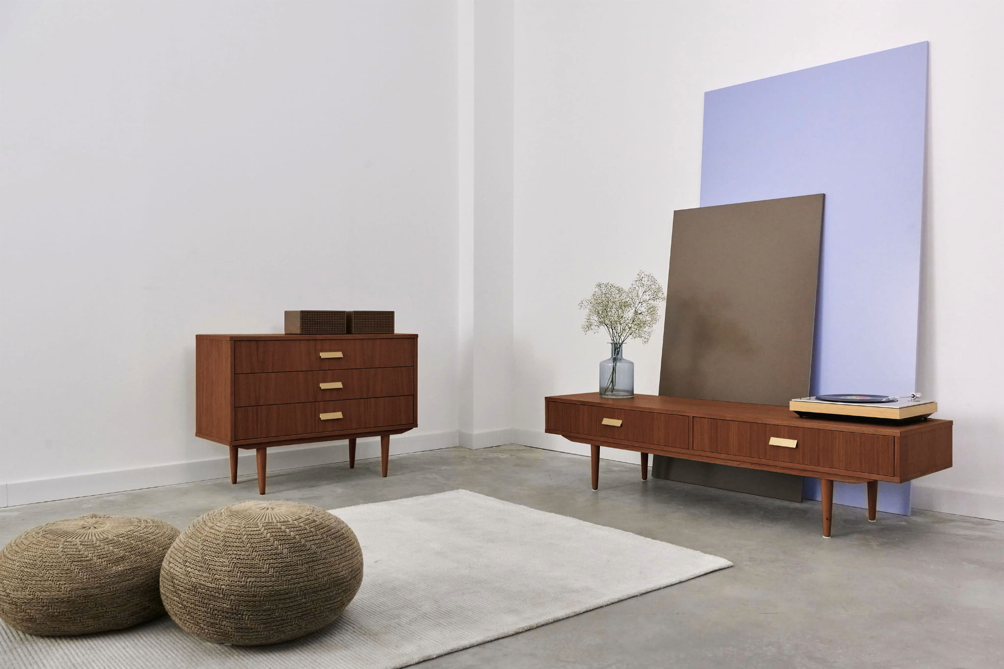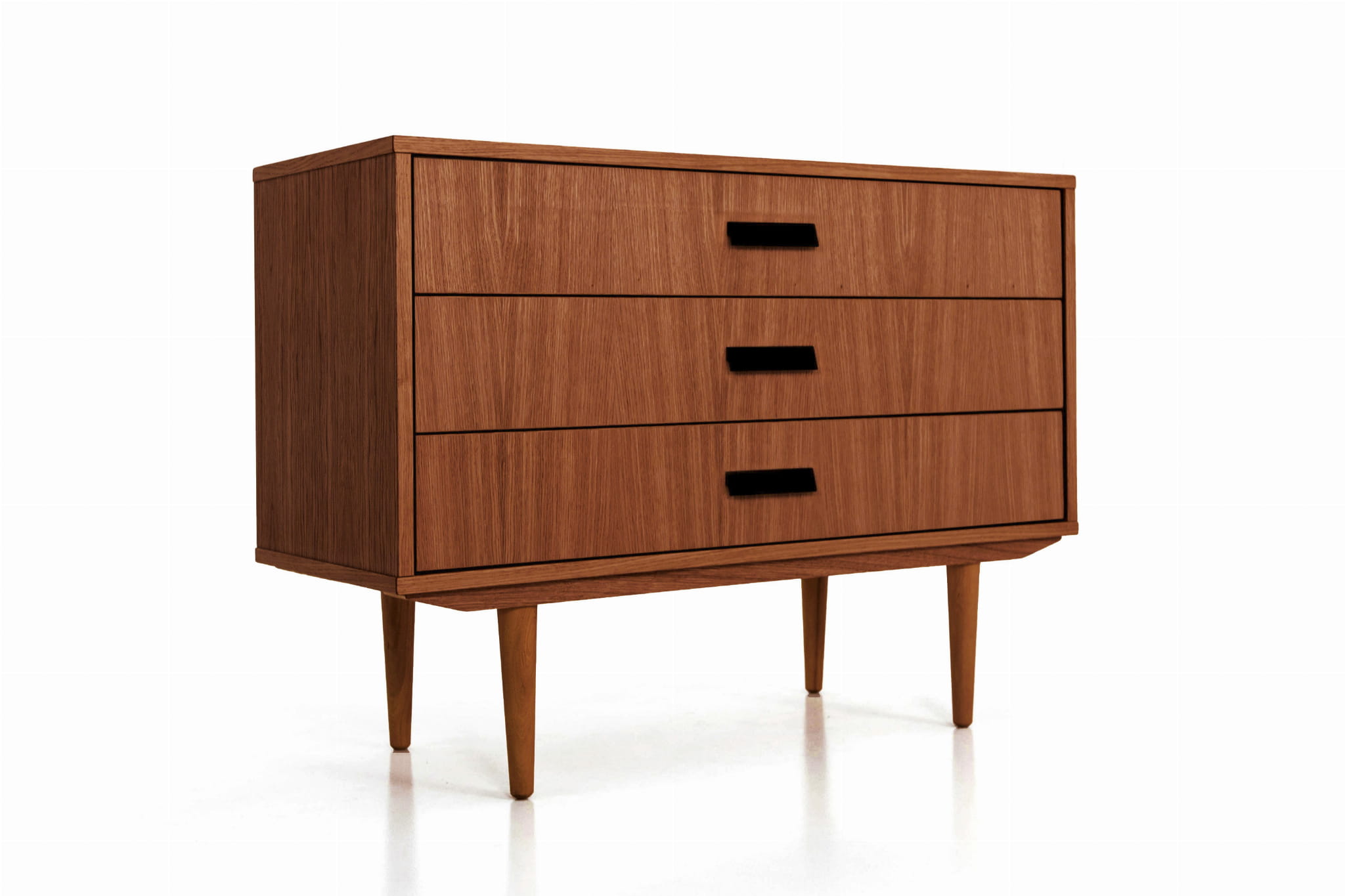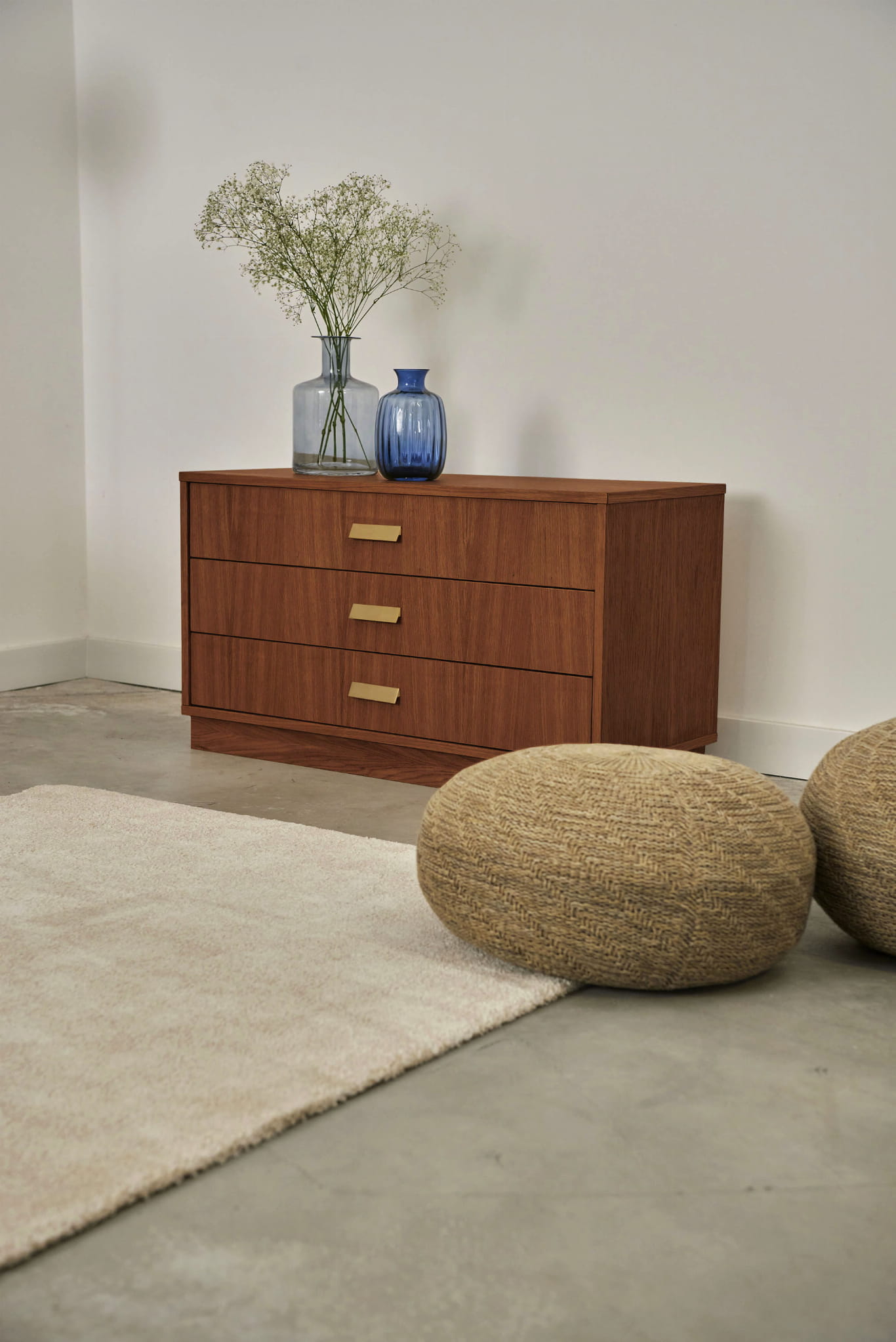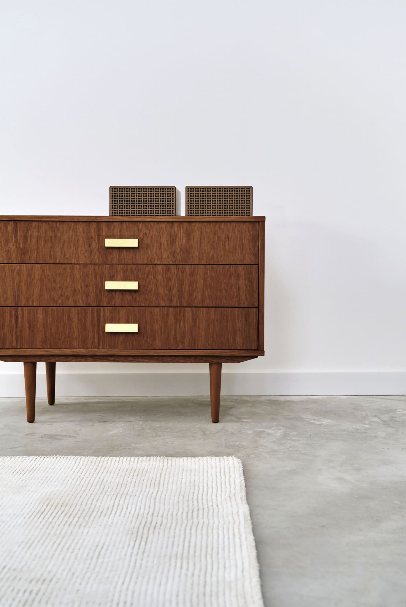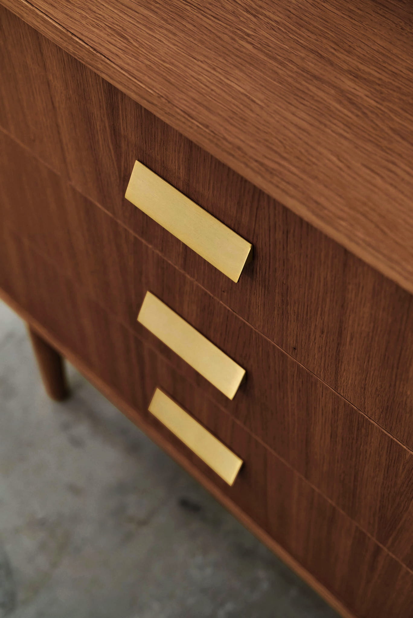 This exceptionally shapely cabinet can adorn stylish living rooms, but will find its way into virtually any interior. We have equipped our cabinet with three drawers on Blum concealed runners with the Blumotion system. Thanks to this system, opening and closing of drawers is a very light and extremely quiet process.
