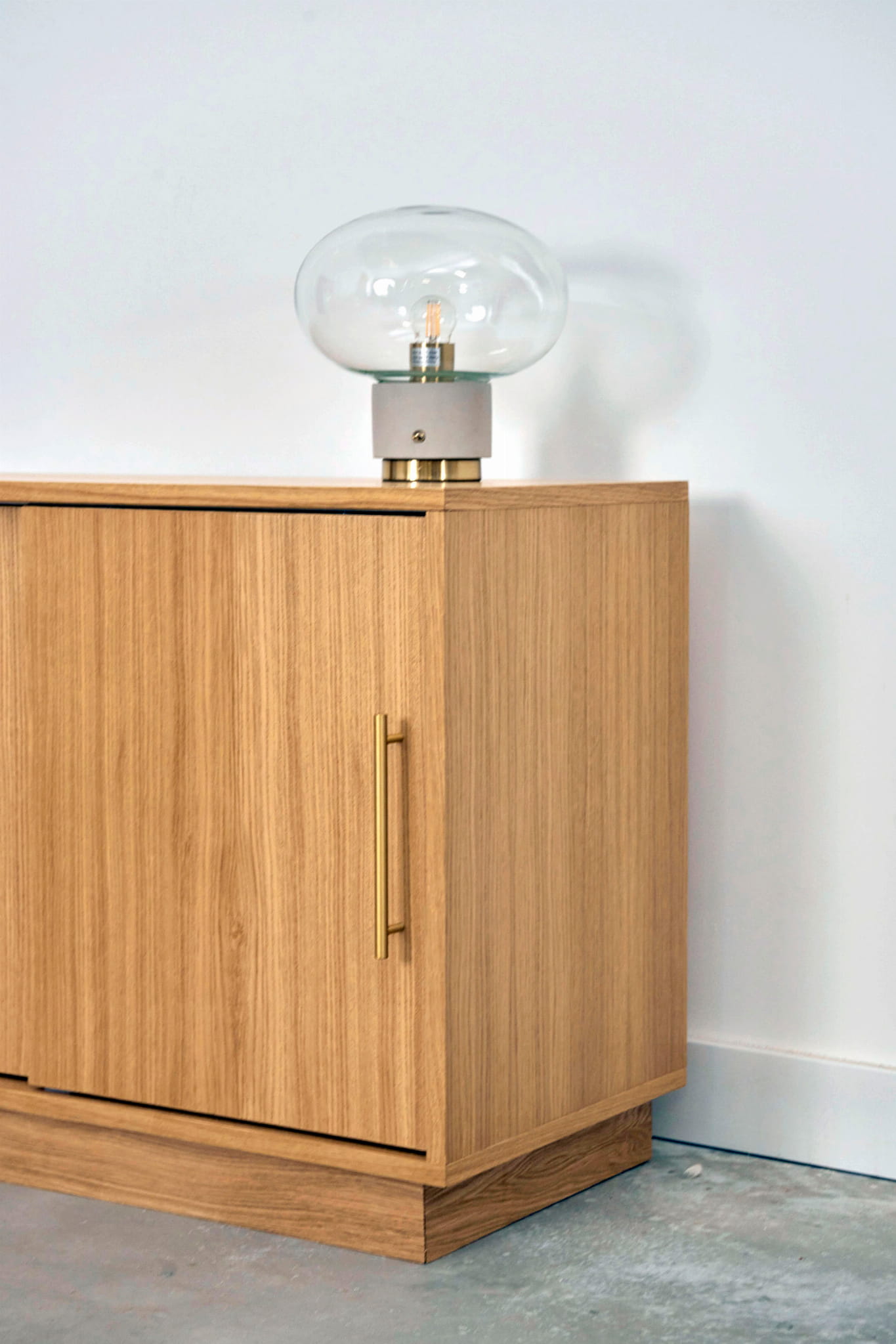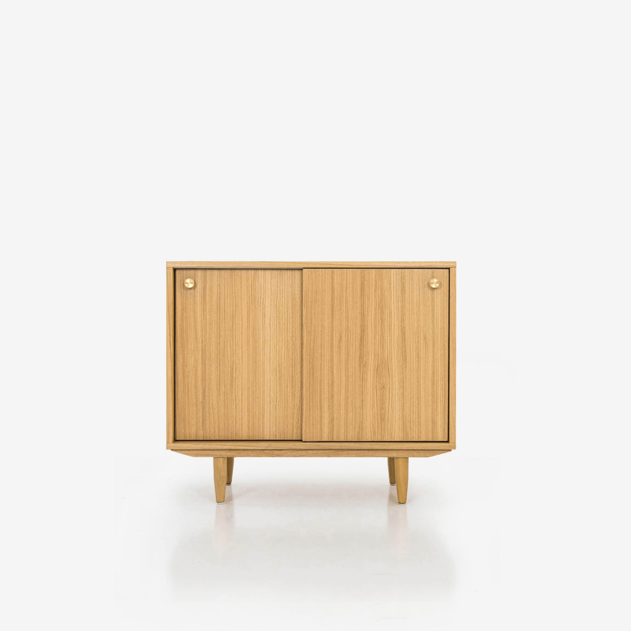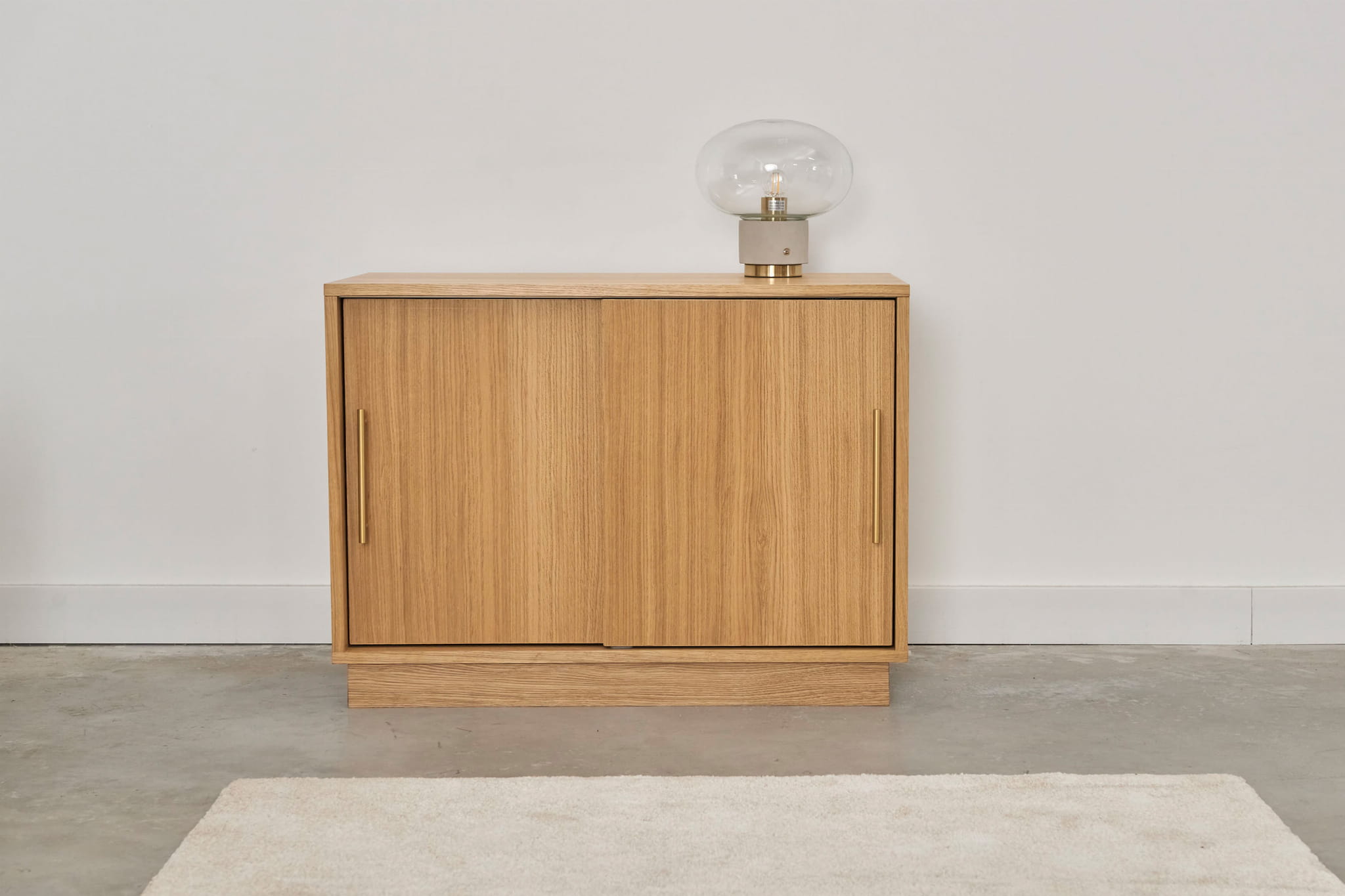This is a compact cabinet that impresses with its beautiful, symmetrical form. Its fronts are formed by two pairs of sliding doors, which close exceptionally smoothly and quietly. The interior of the cabinet conceals a large space divided by a shelf, the position of which can be adjusted as required. For safety, the shelf is mounted on spoon supports that prevent it from being accidentally pulled out.