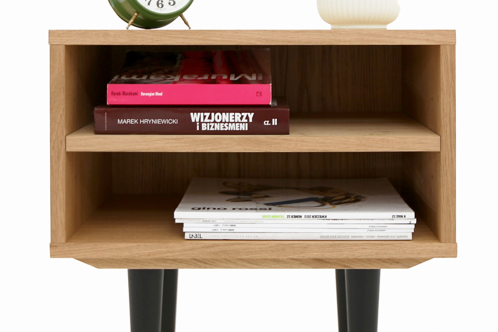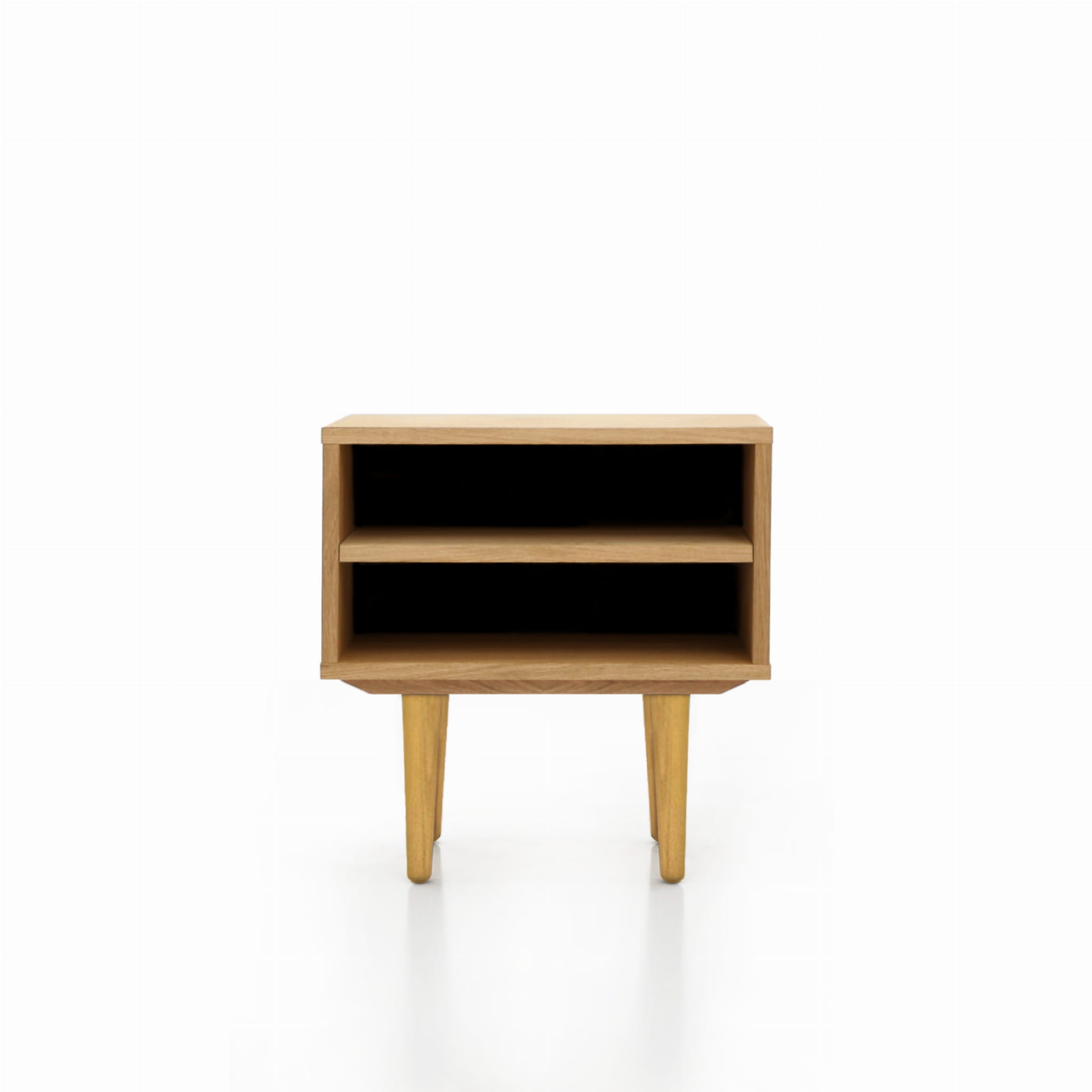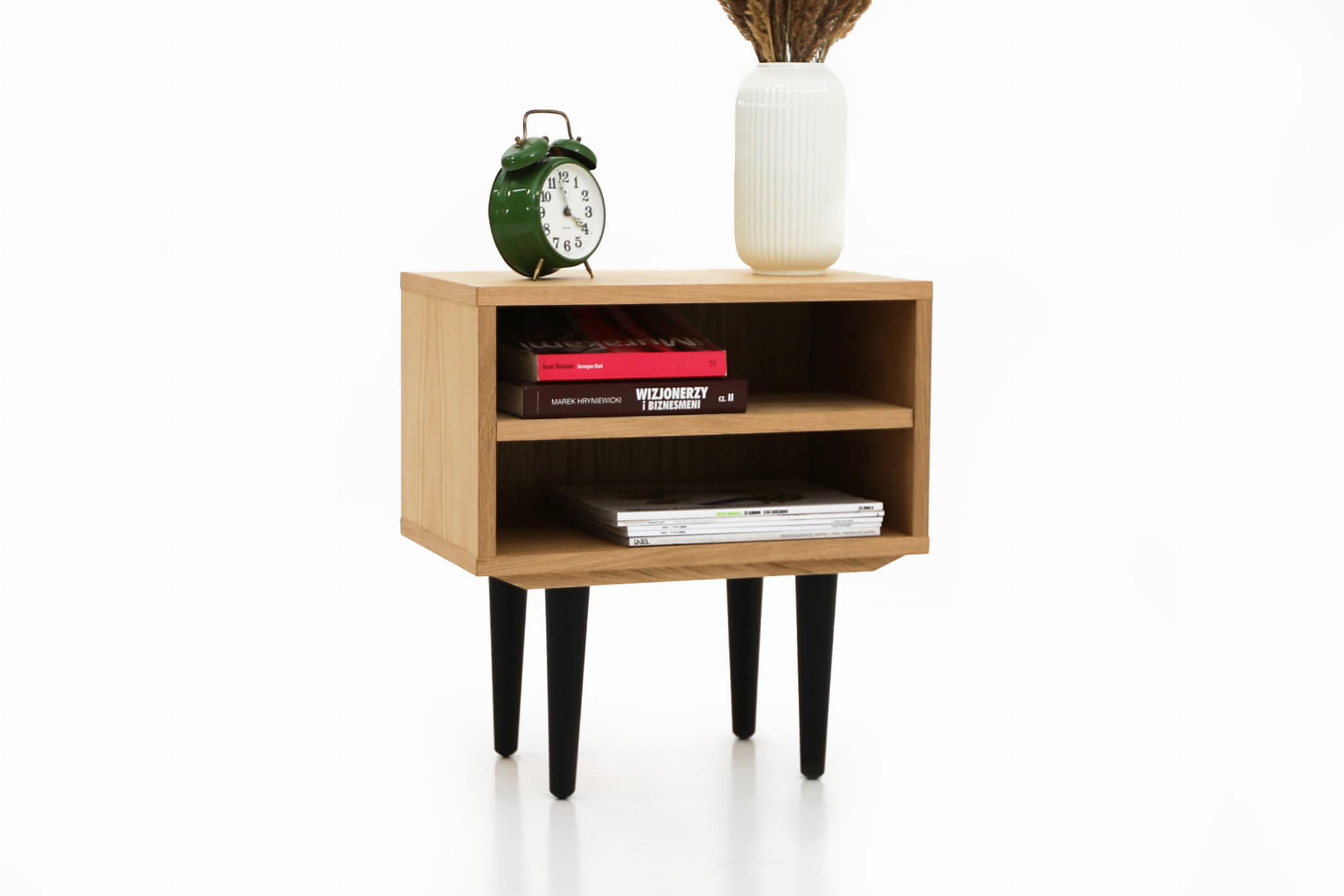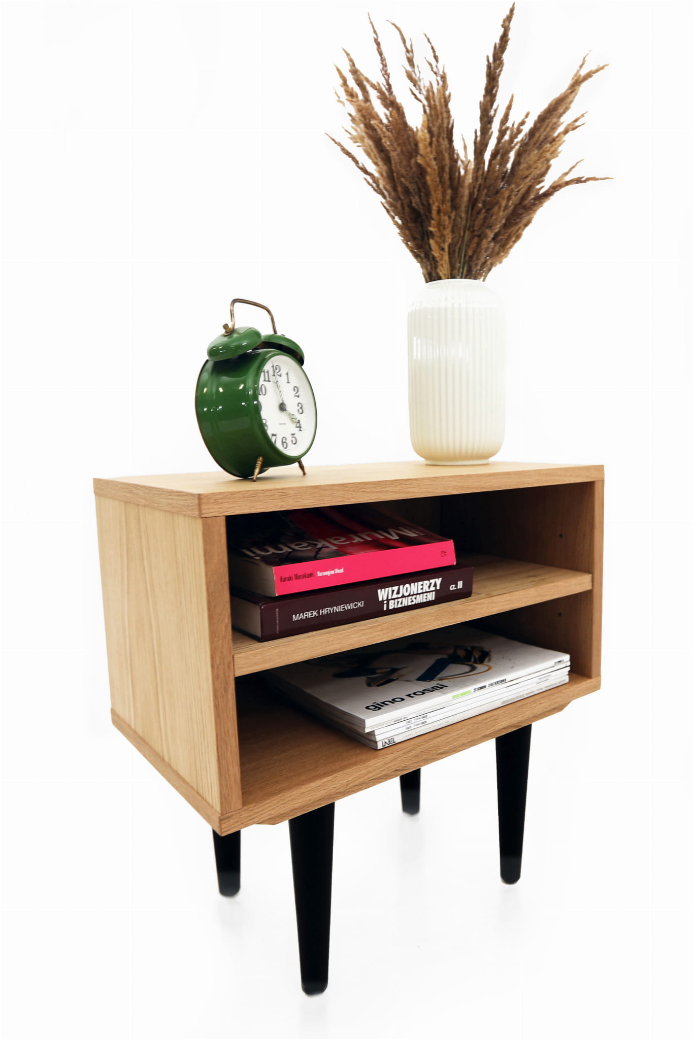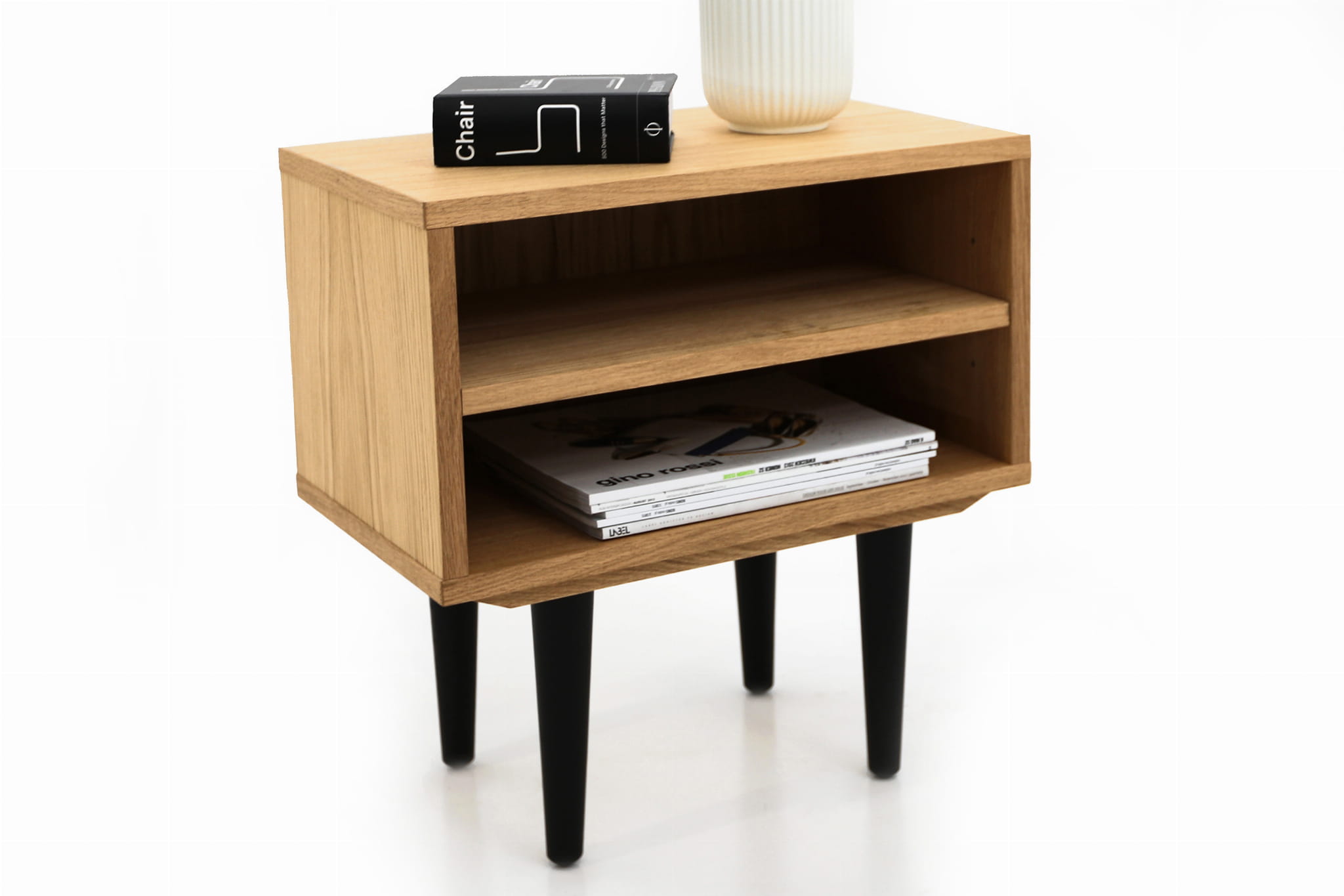 This model, delightful in form, performs well as a bedside table. It has a practical open space with a shelf where you can comfortably store your phone or a whole tower of evening reading to be done.