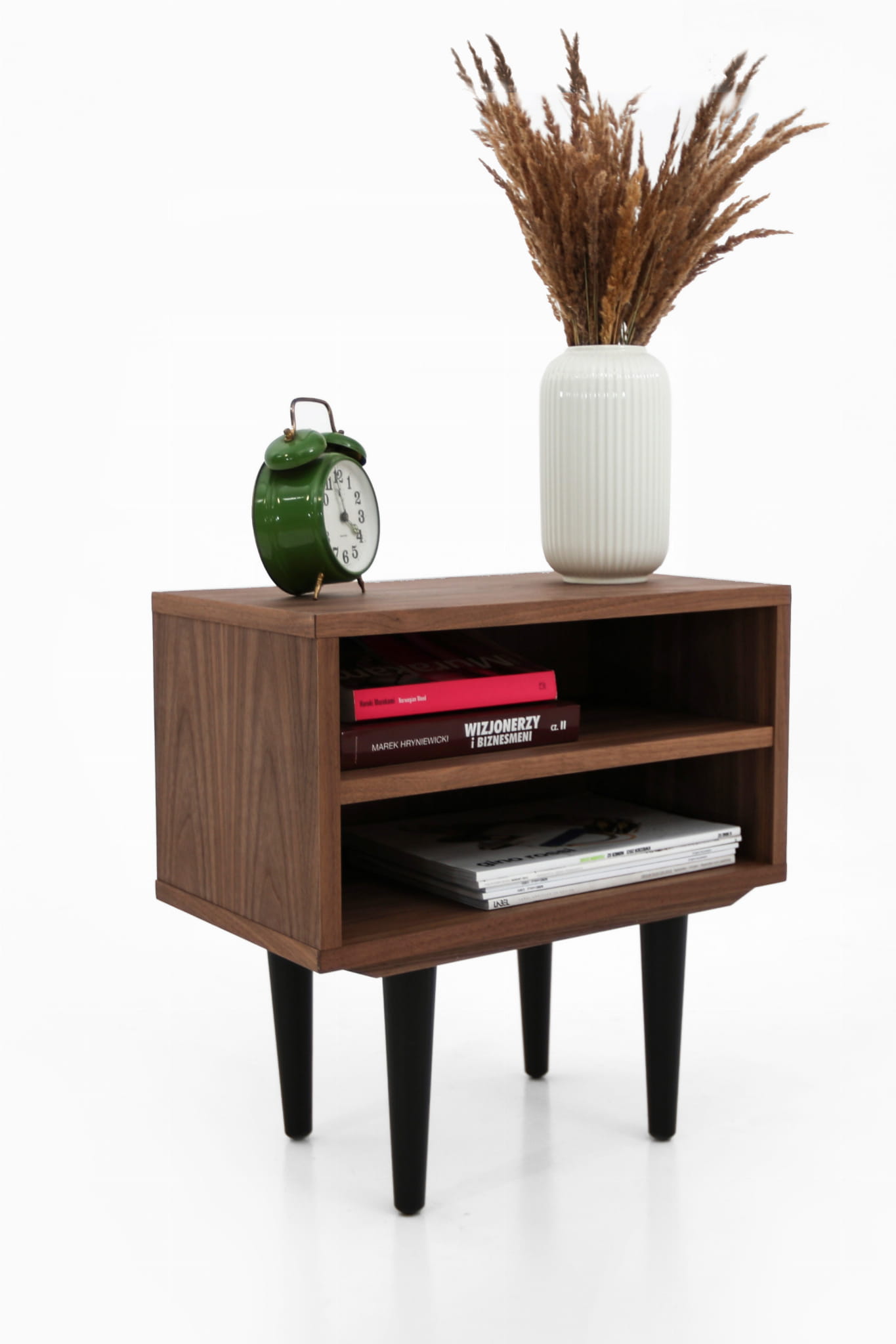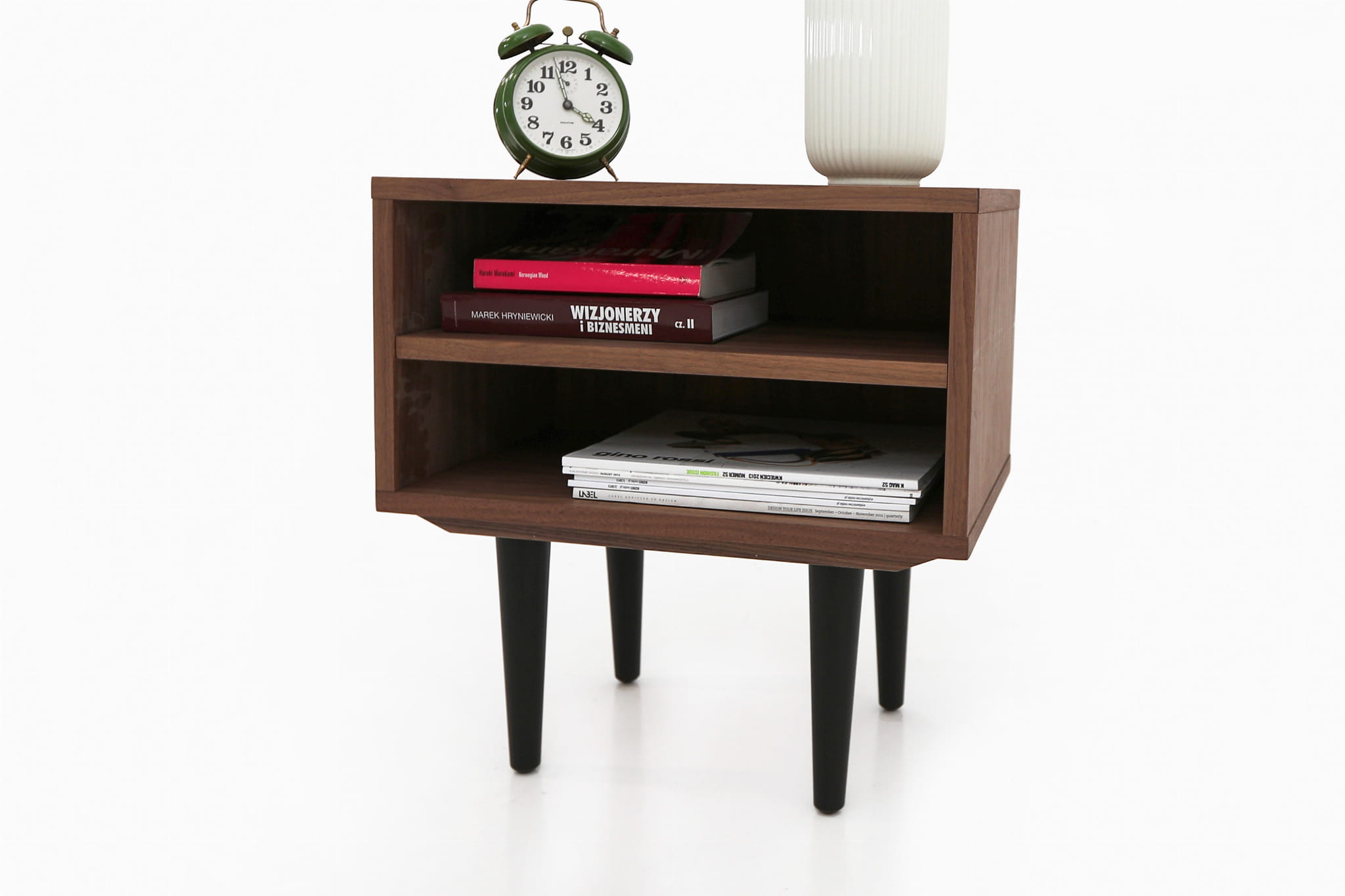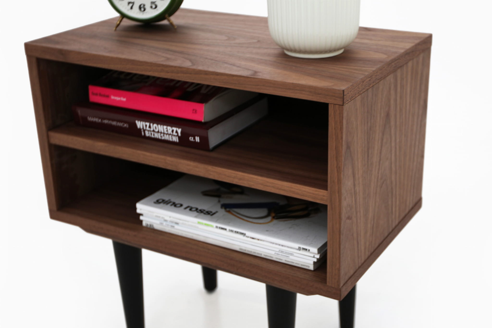 This model, delightful in form, performs well as a bedside table. It has a practical open space with a shelf where you can comfortably store your phone or a whole tower of evening reading to be done.