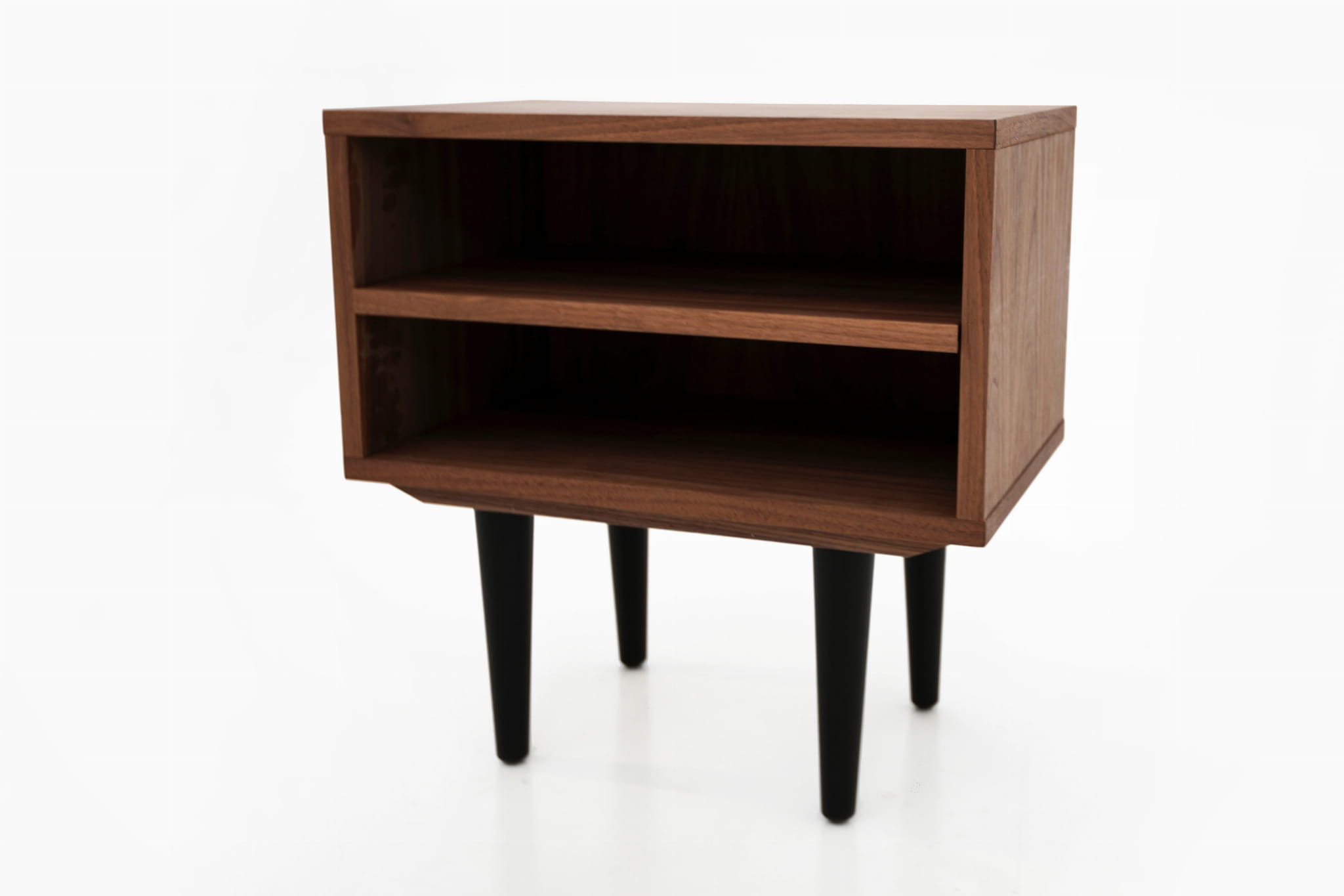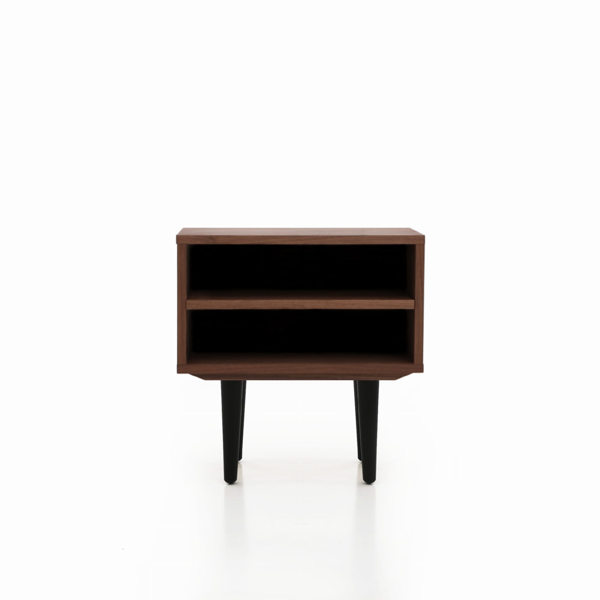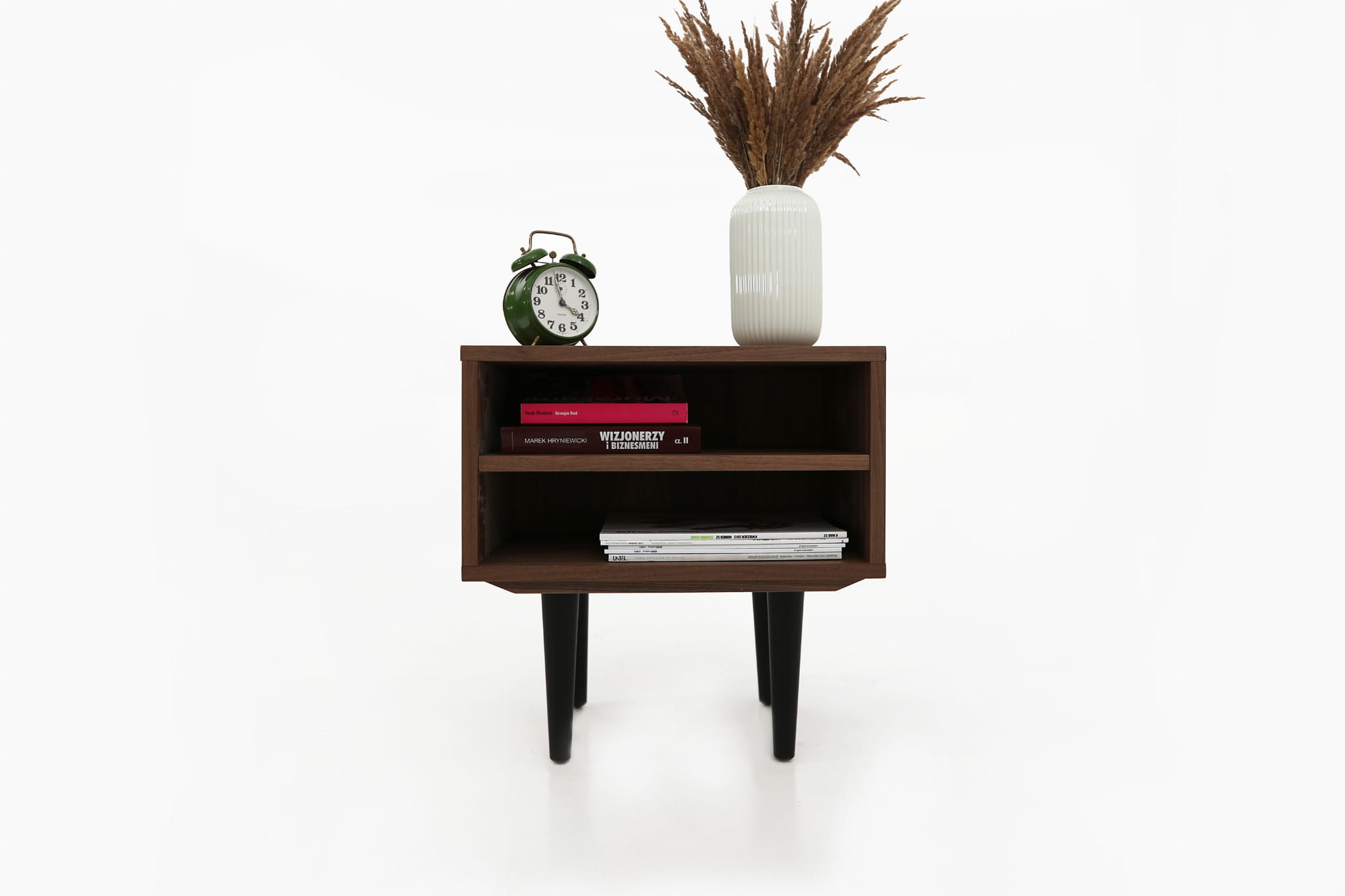 This model, delightful in form, performs well as a bedside table. It has a practical open space with a shelf where you can comfortably store your phone or a whole tower of evening reading to be done.