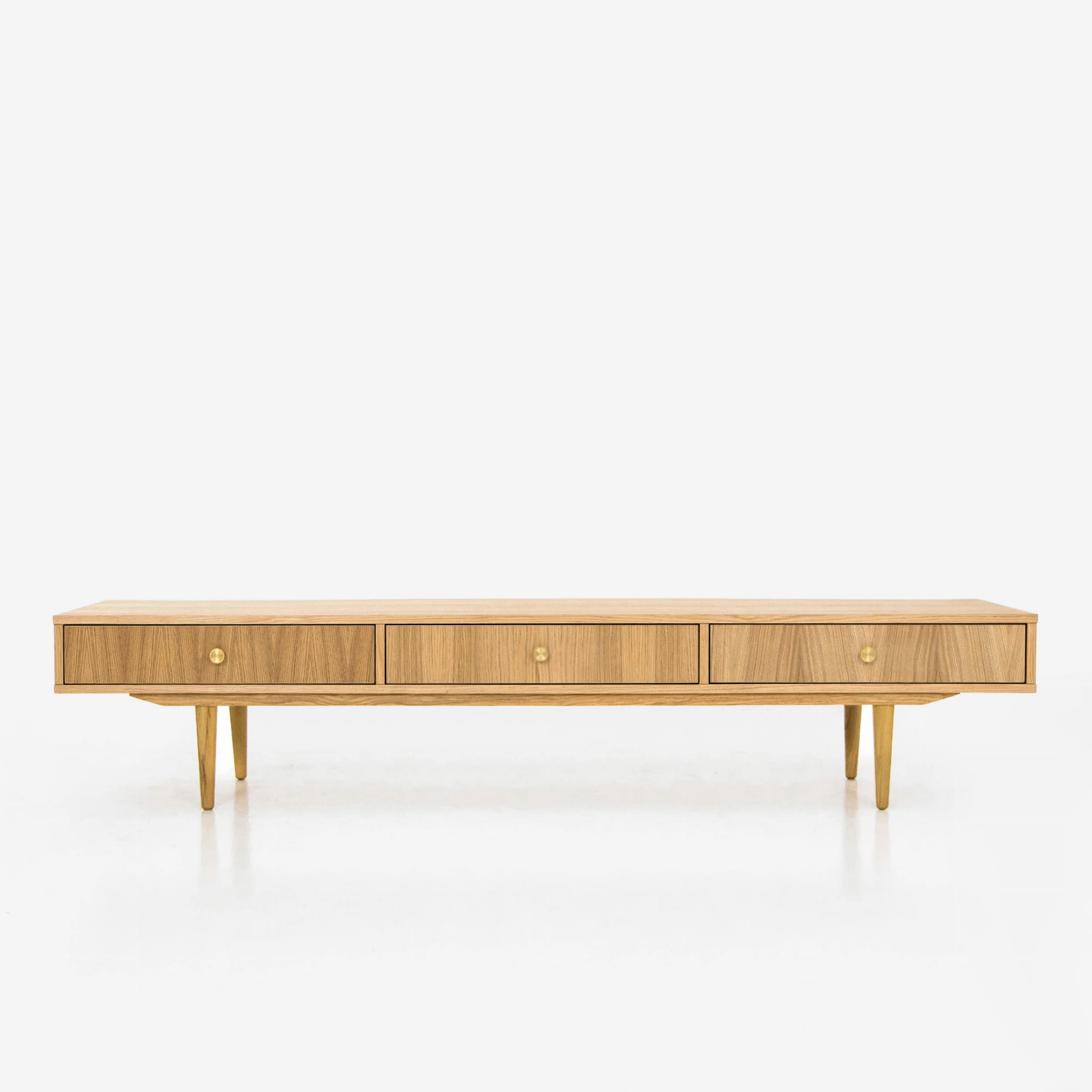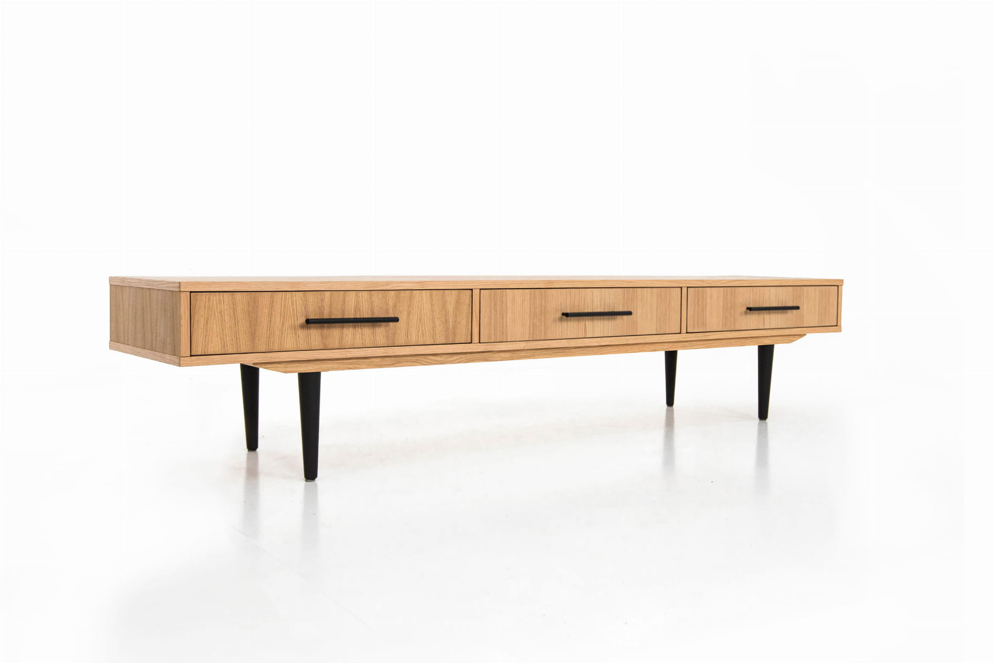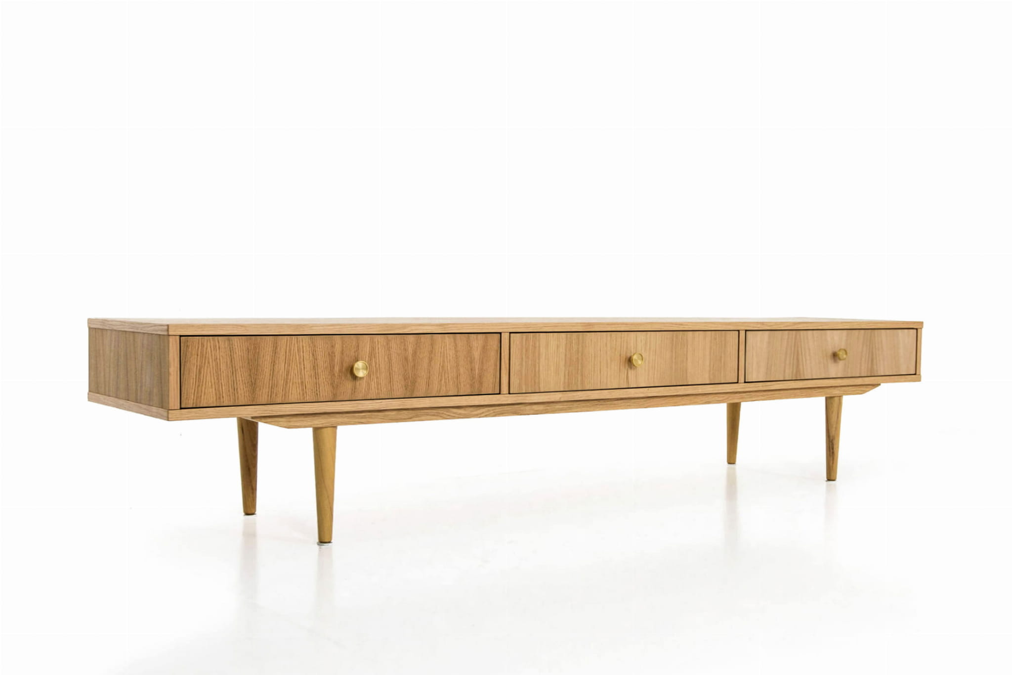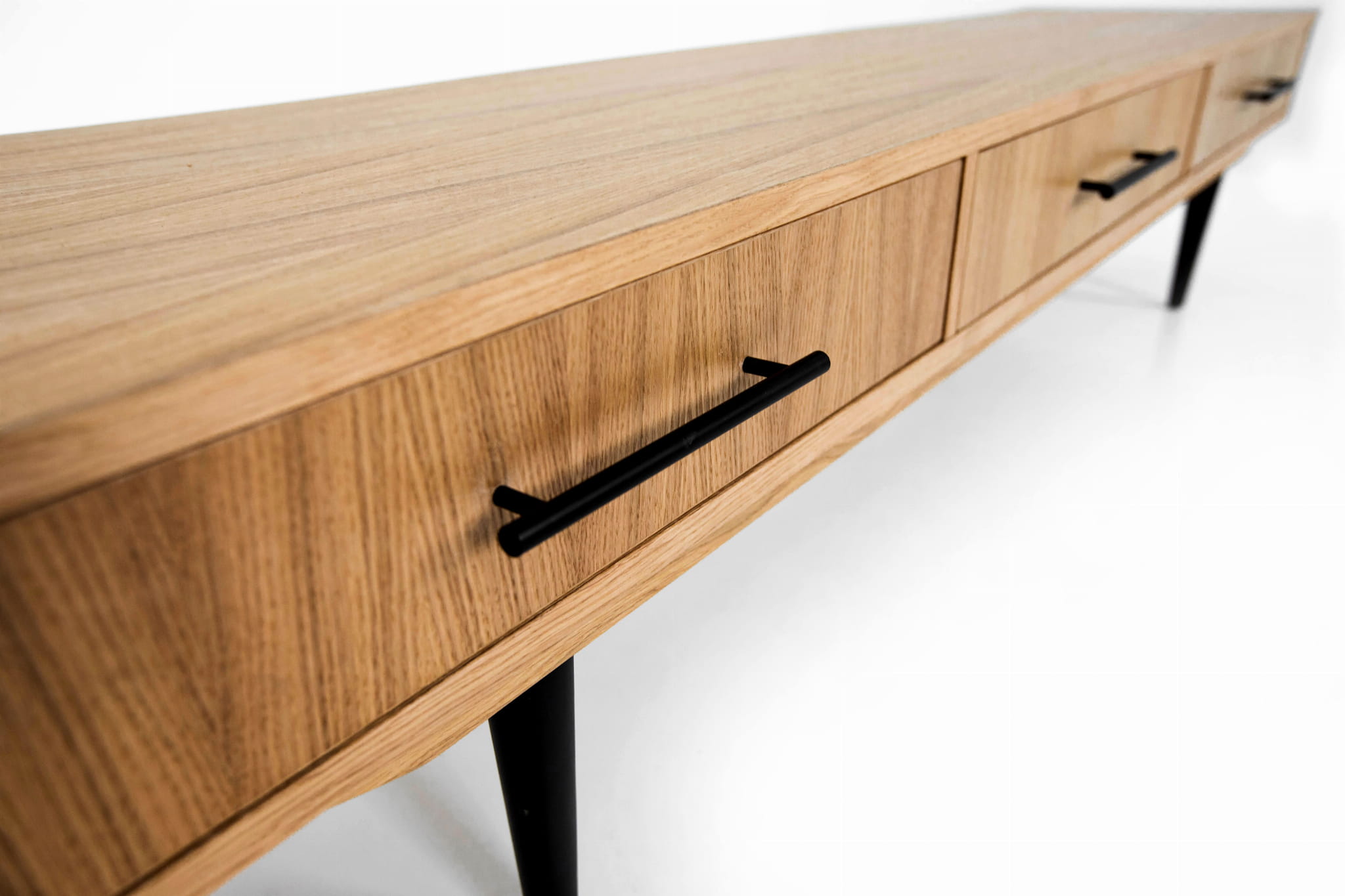 This stylish lowboard will go well in a home living room, in a study for work, but also in a stylish office. Our piece of furniture is equipped with three drawers, which we mounted on Blum concealed runners. Thanks to it, opening and closing the drawers is a very light and extremely quiet process.