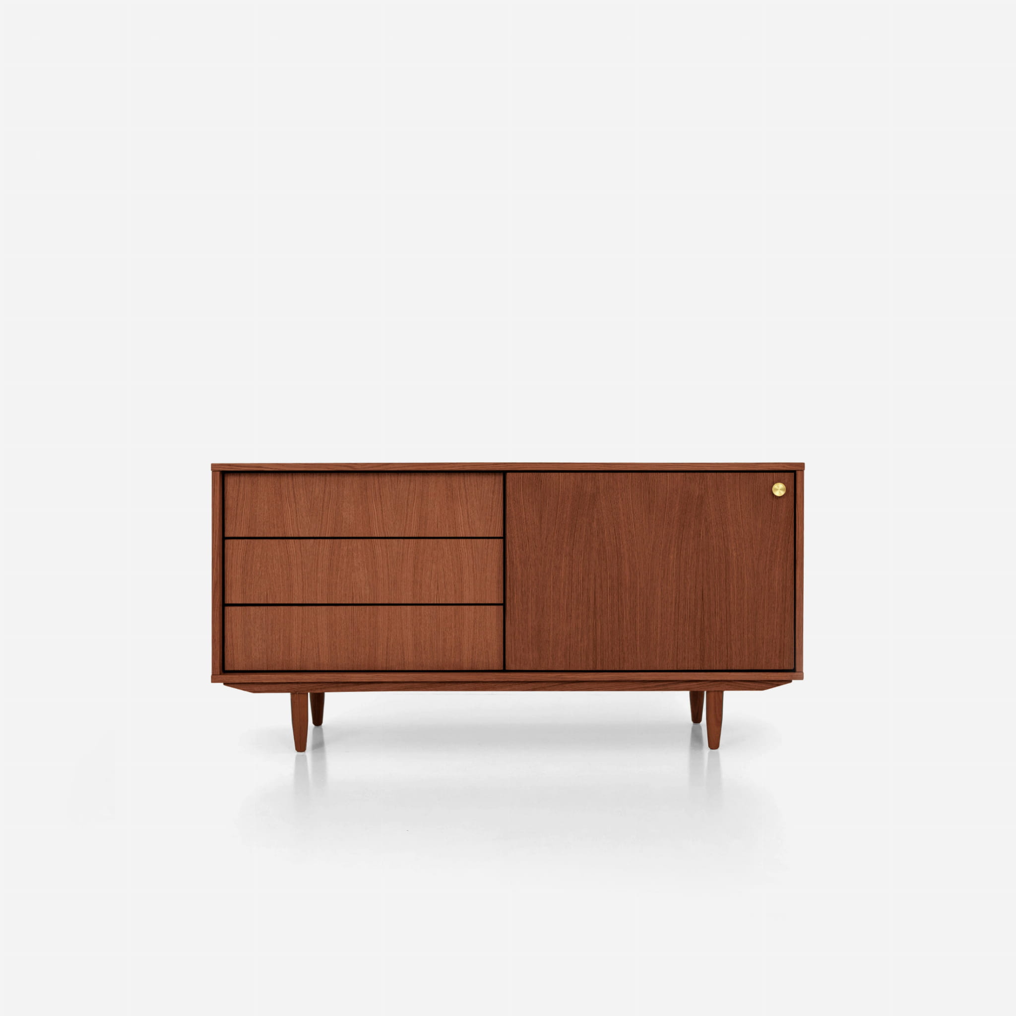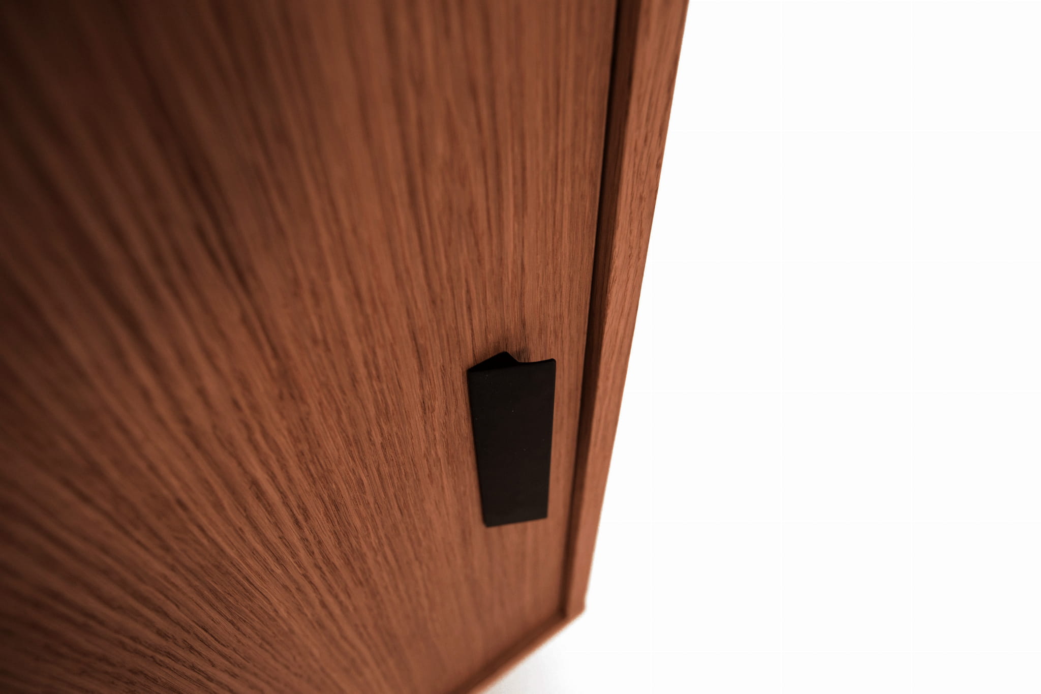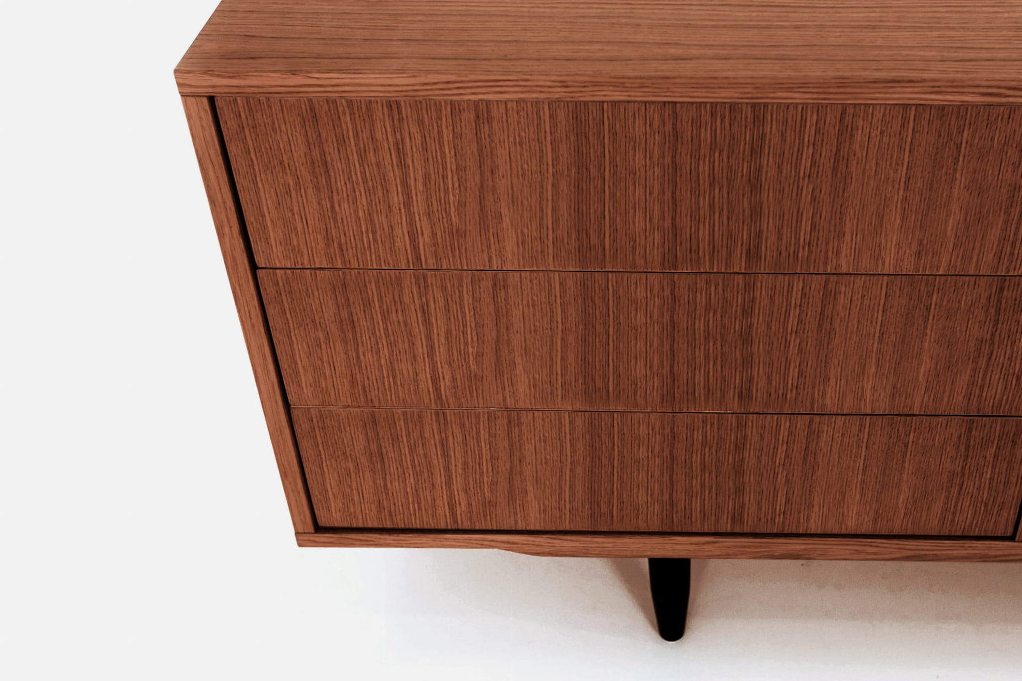 This compact chest of drawers offers three elegant drawers and a stylish recess with a sliding front. We mounted the drawers on Blum concealed runners and dispensed with handles in favour of the TIP-ON Blumotion system. This gives the drawers a quiet and smooth closing action with a brake function.