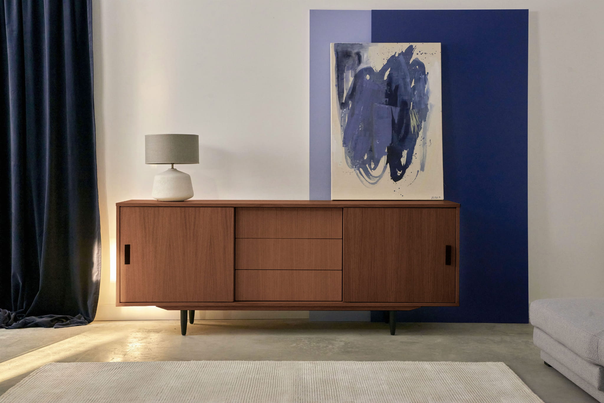 We have equipped our piece of furniture with two pairs of sliding doors, enriching them with a quiet closing system. Behind each of the fronts, there is one shelf, the position of which can be freely adjusted to suit your needs. In the central part there are three drawers mounted on Blum concealed slides with the Blumotion system, which ensures light and quiet closing.
