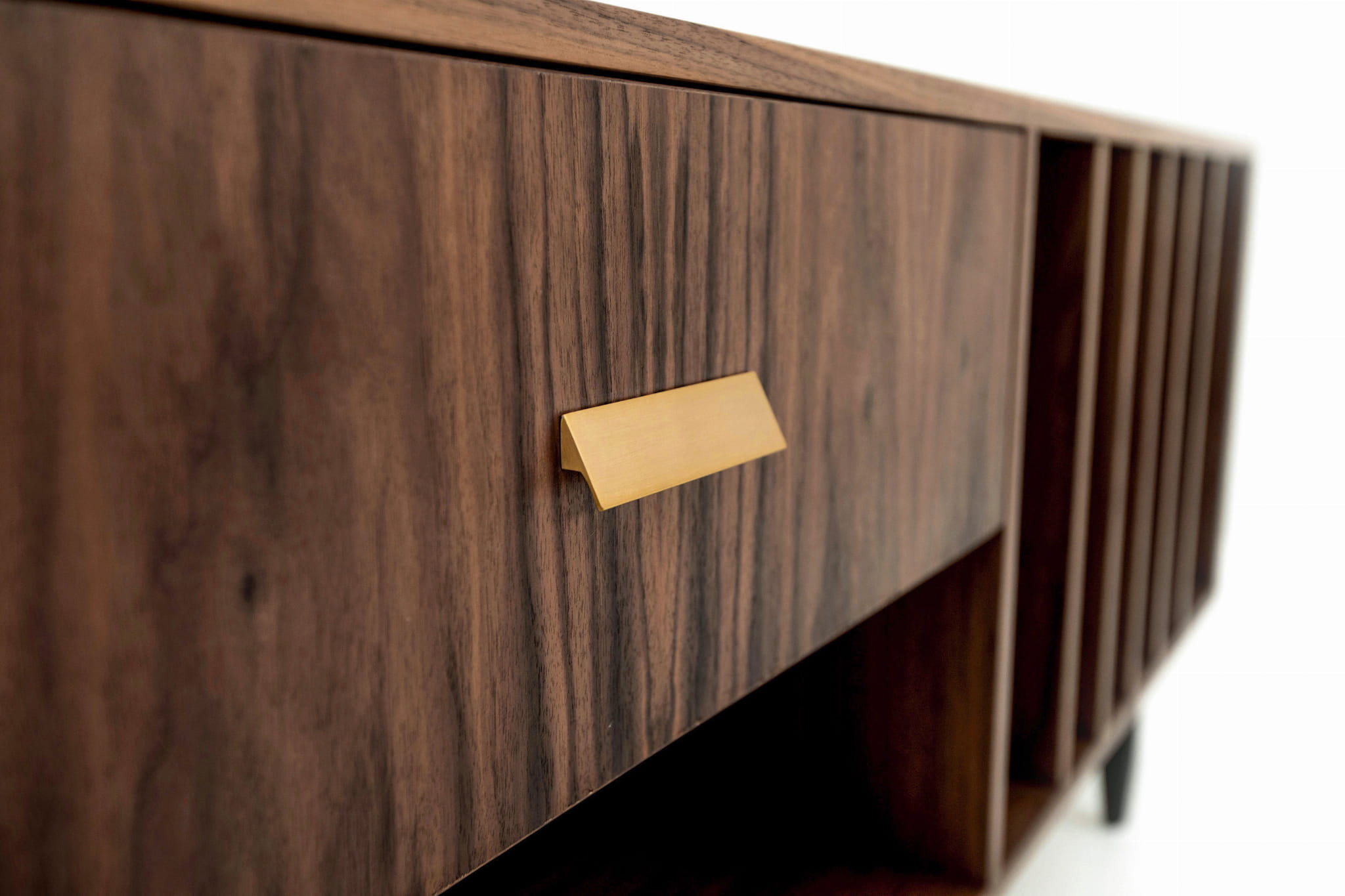 Beautiful form is combined with durability and usability in our model. On the right side of the piece of furniture, there is a large drawer and a shelf below it. The drawer is mounted on concealed Blum runners with the Blumotion system, ensuring light and quiet closing.