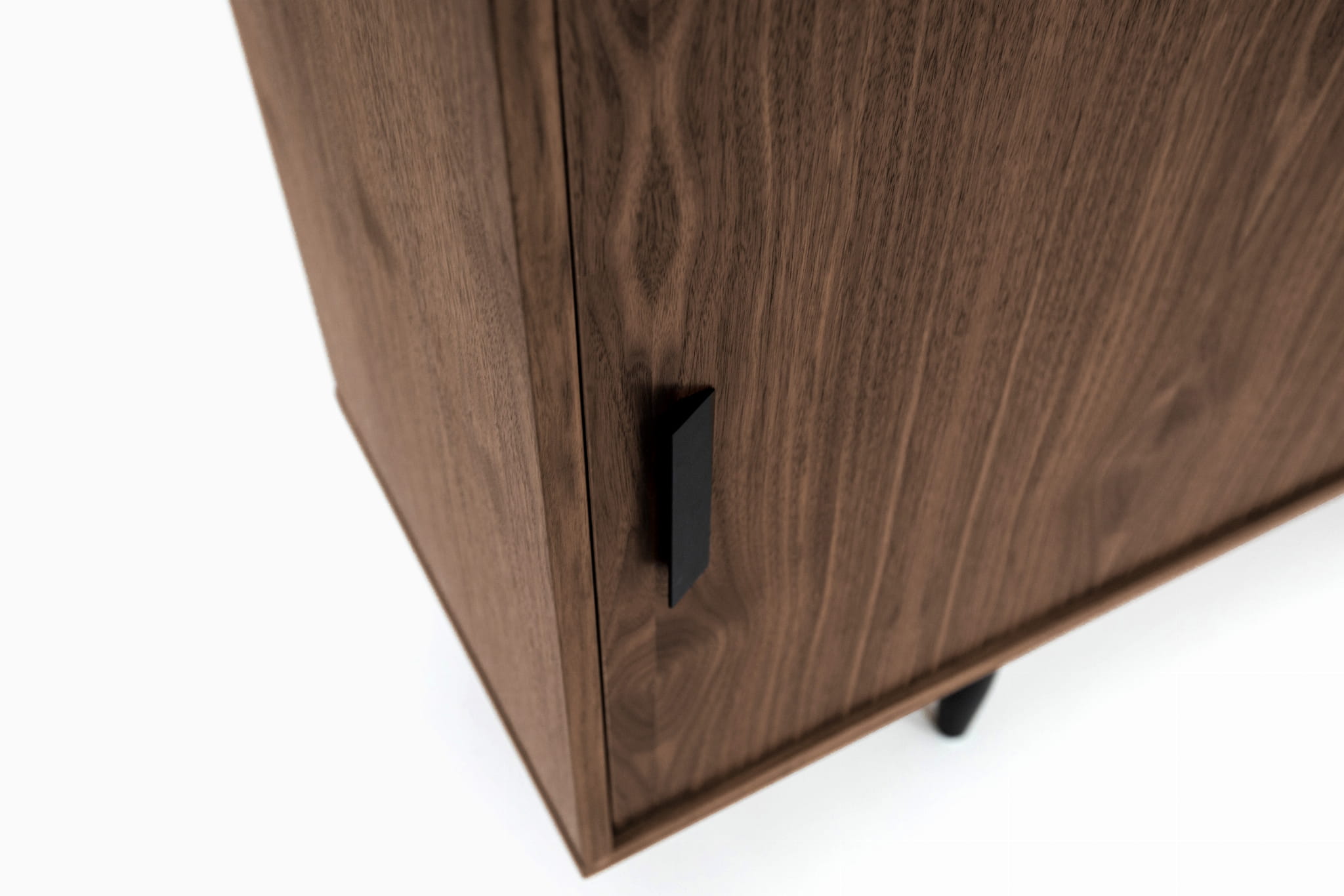 In the central part of the chest of drawers we installed three drawers with Blum runners. We dispensed with handles in this model in favour of the TIP-ON Blumotion system, which allows the drawers to be opened and closed with a single press. Behind each front is a shelf, the position of which can be adjusted as required.