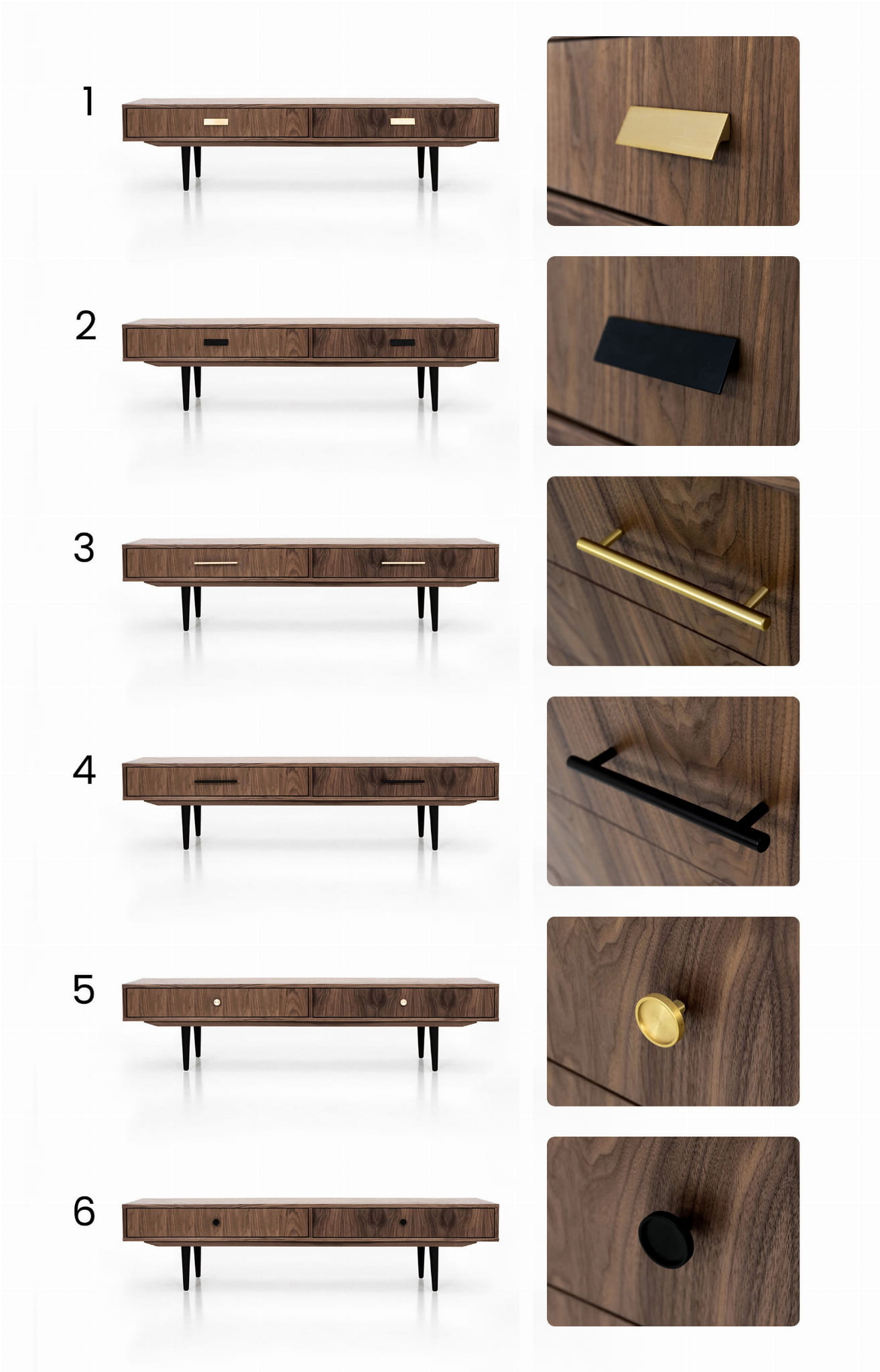 - legs: your choice (wooden, steel or veneer base) handles: brass
