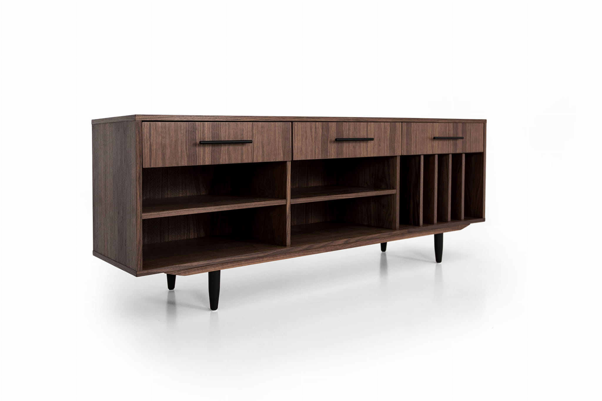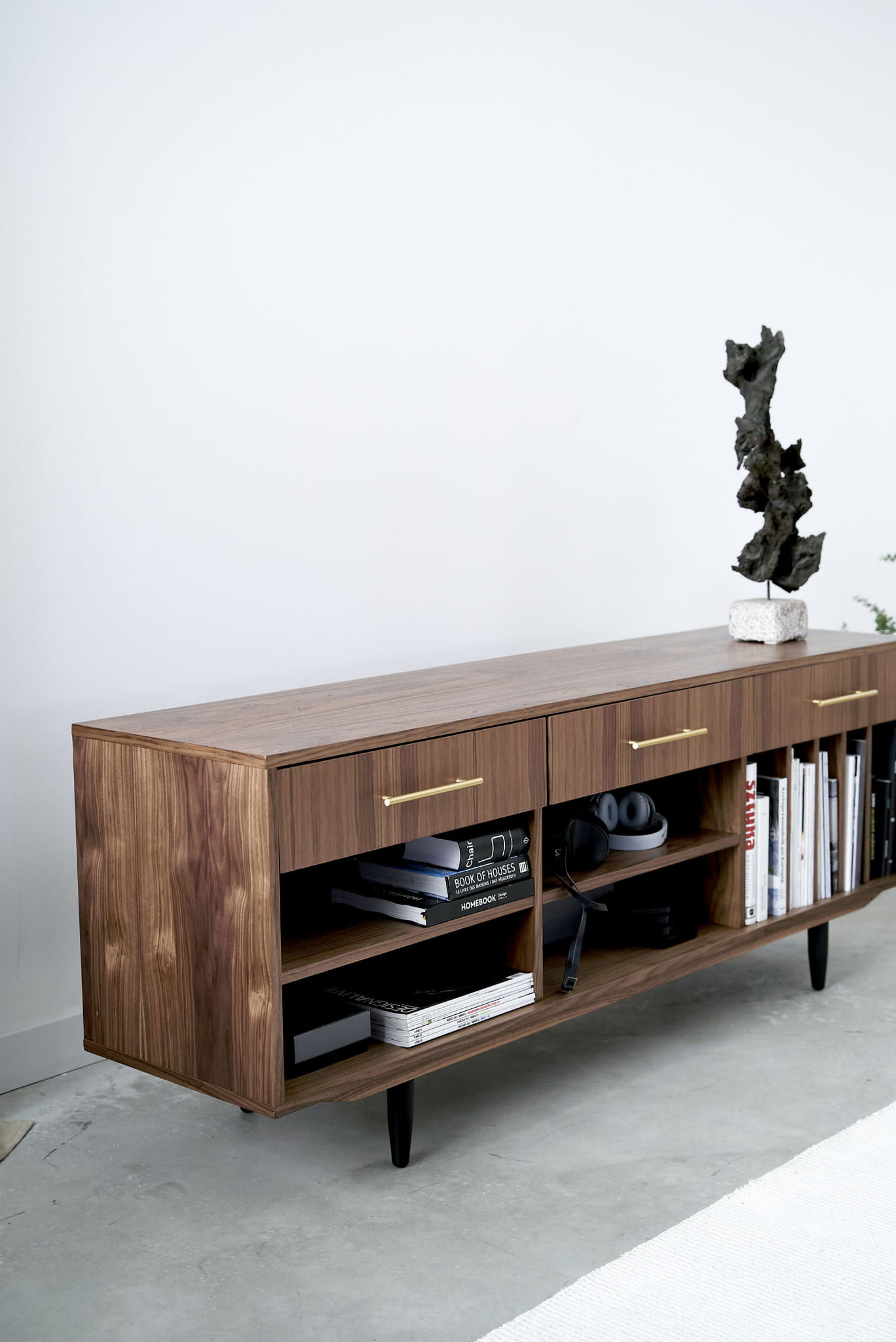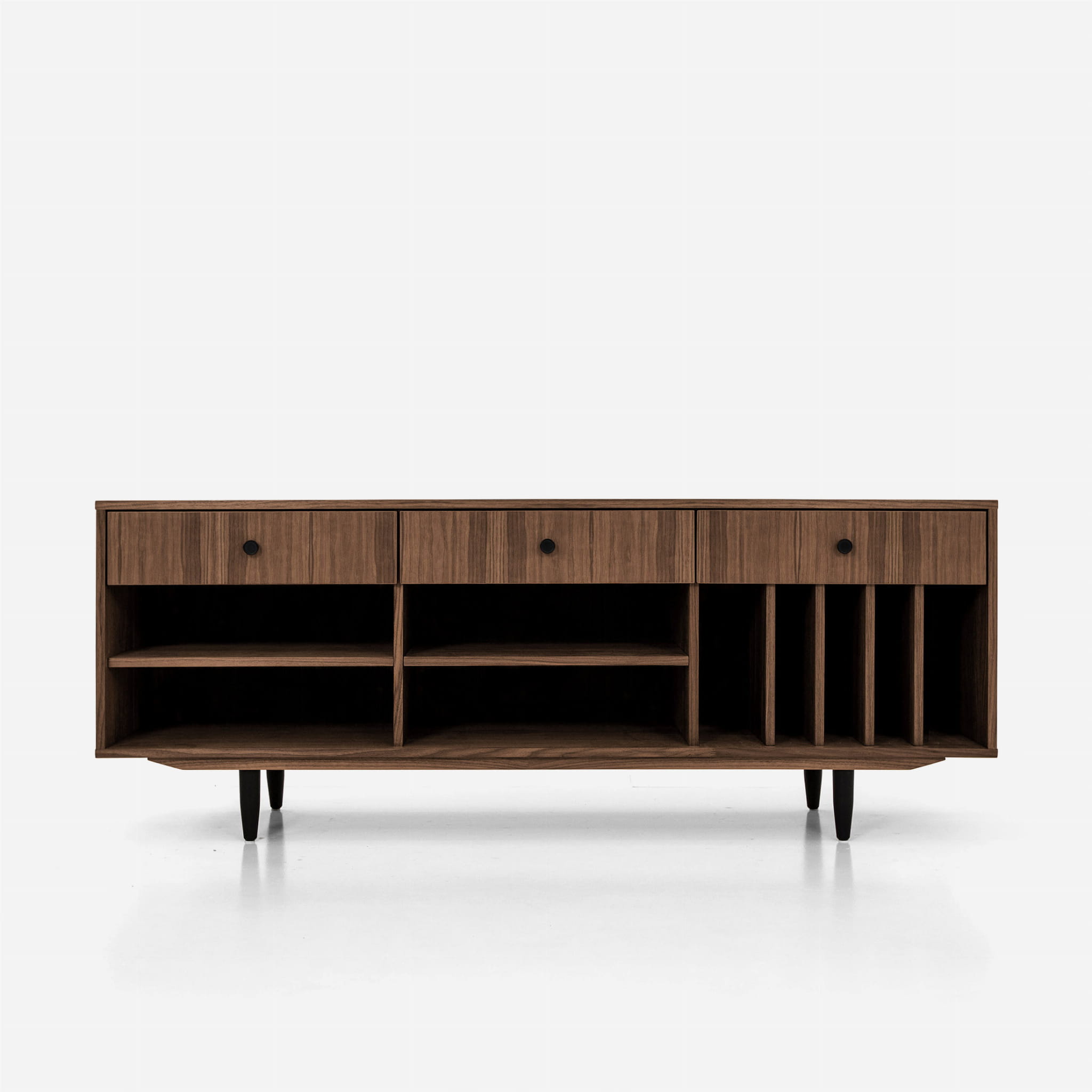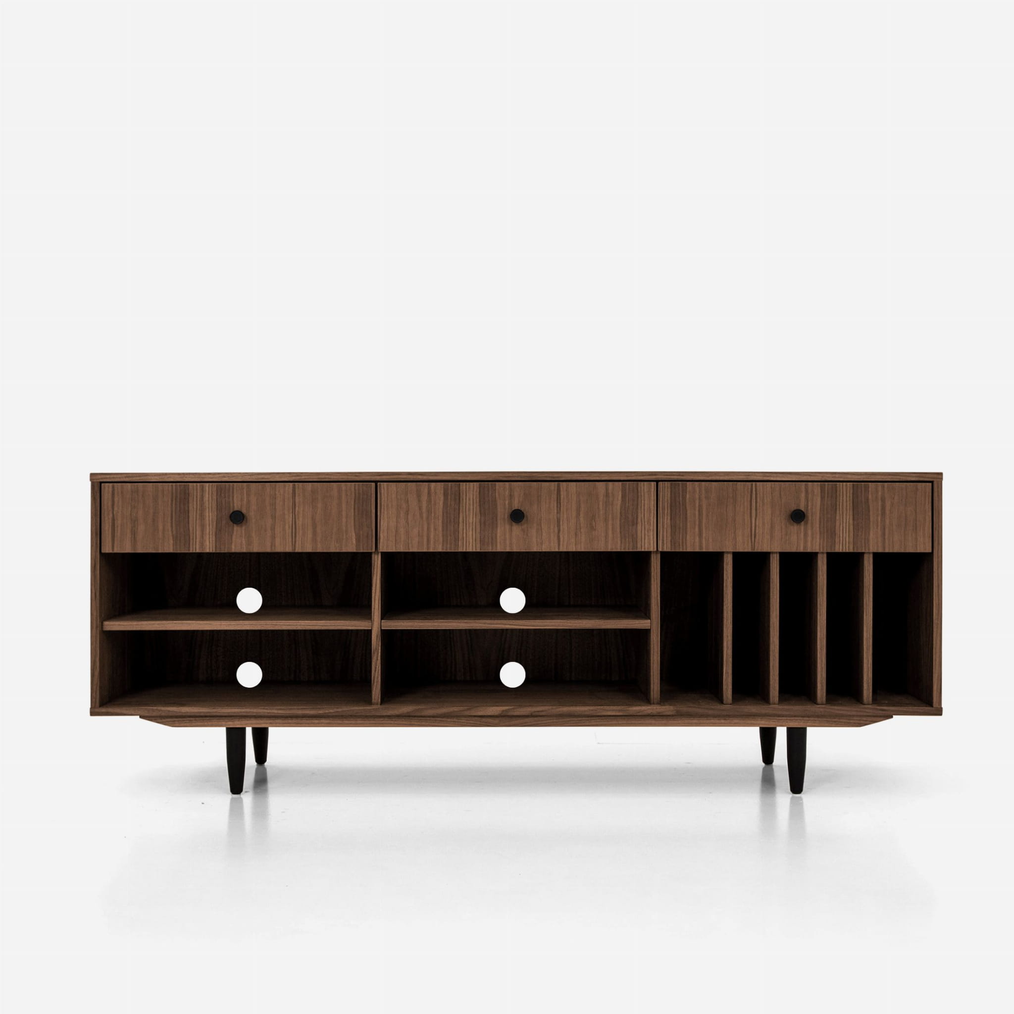 The lower shelves are slide-on, which means that their mounting system is invisible. The same goes for the side compartments. You can put your favourite vinyl records in them, and thanks to their adjustability, they can easily be adjusted to suit your needs.