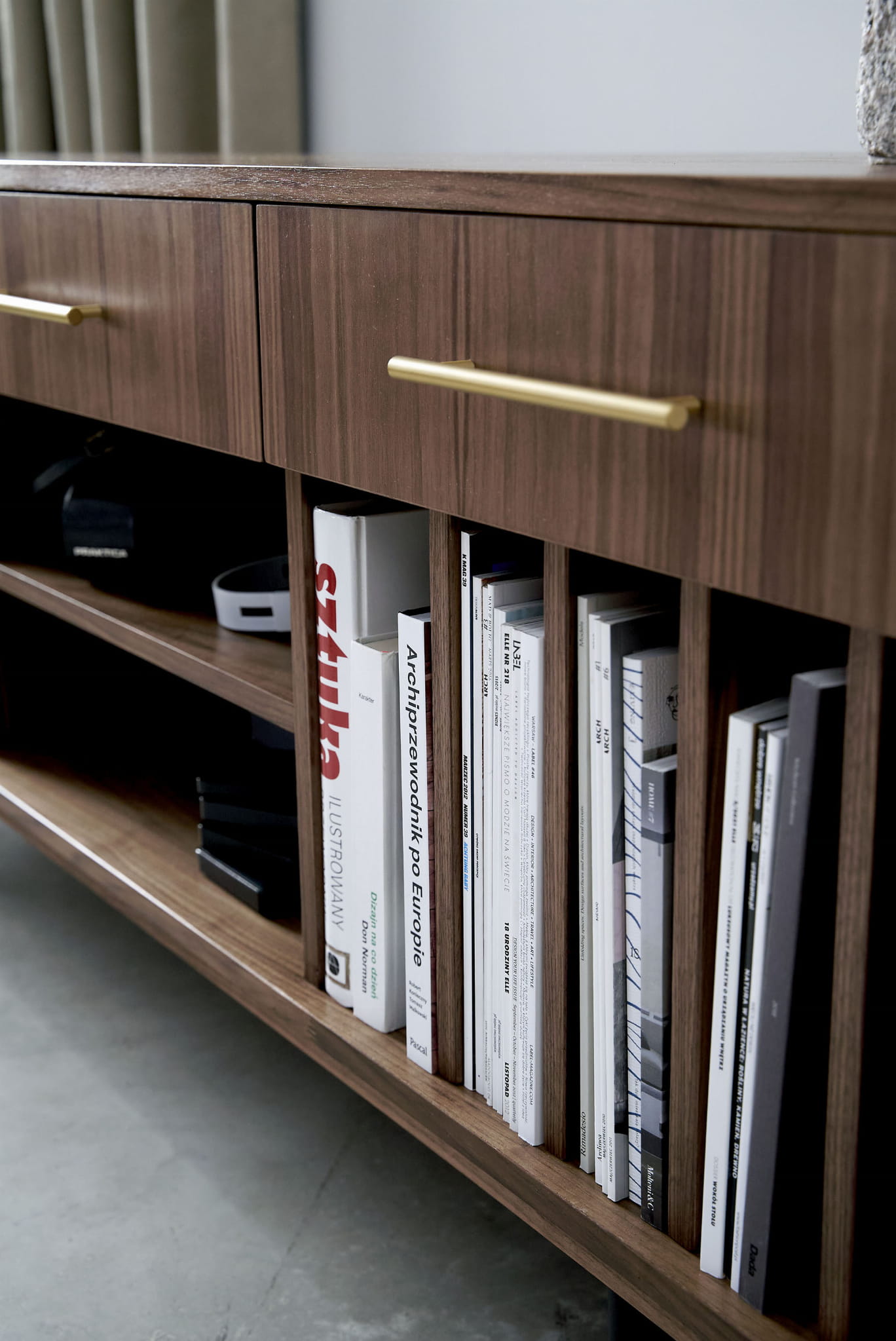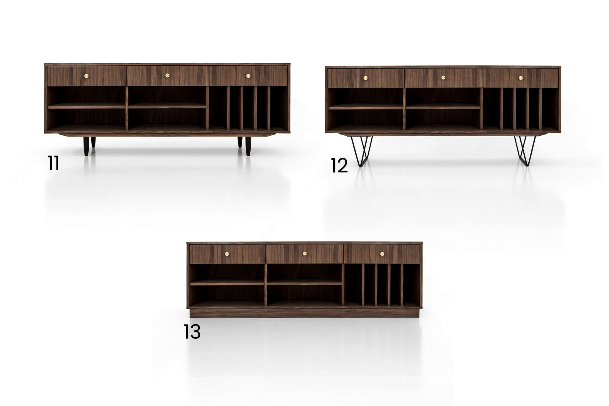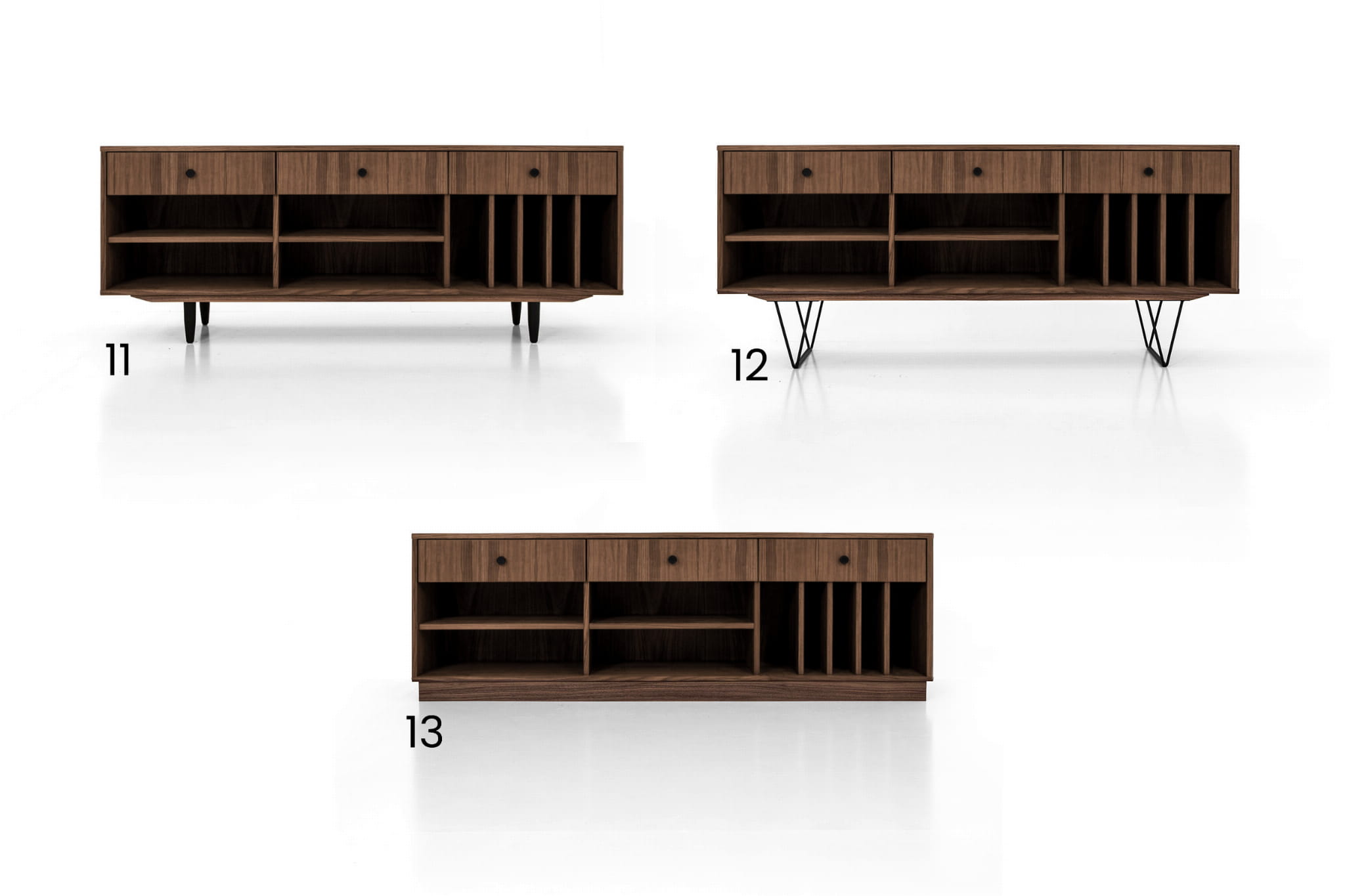 The lower shelves are slide-on, which means that their mounting system is invisible. The same goes for the side compartments. You can put your favourite vinyl records in them, and thanks to their adjustability, they can easily be adjusted to suit your needs.