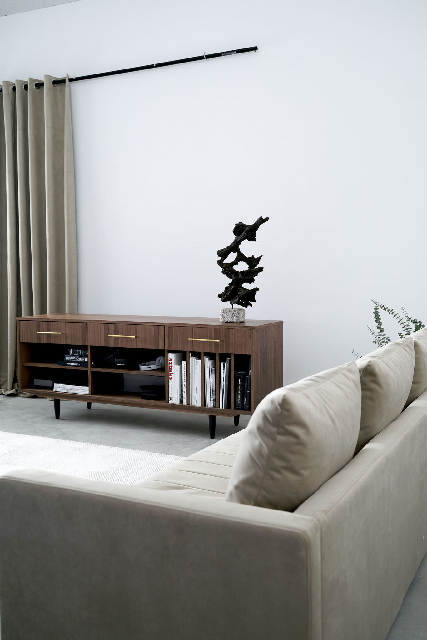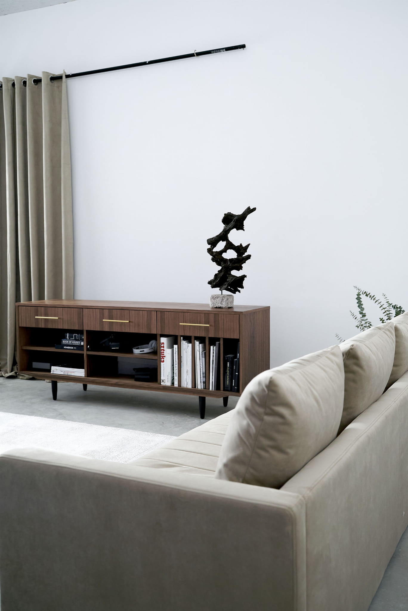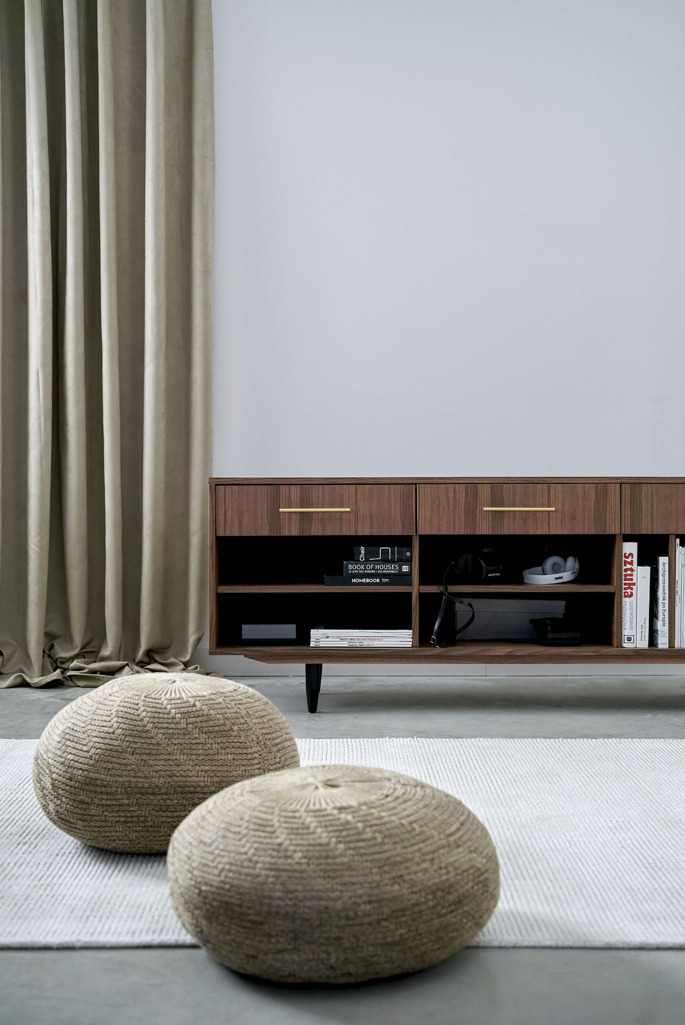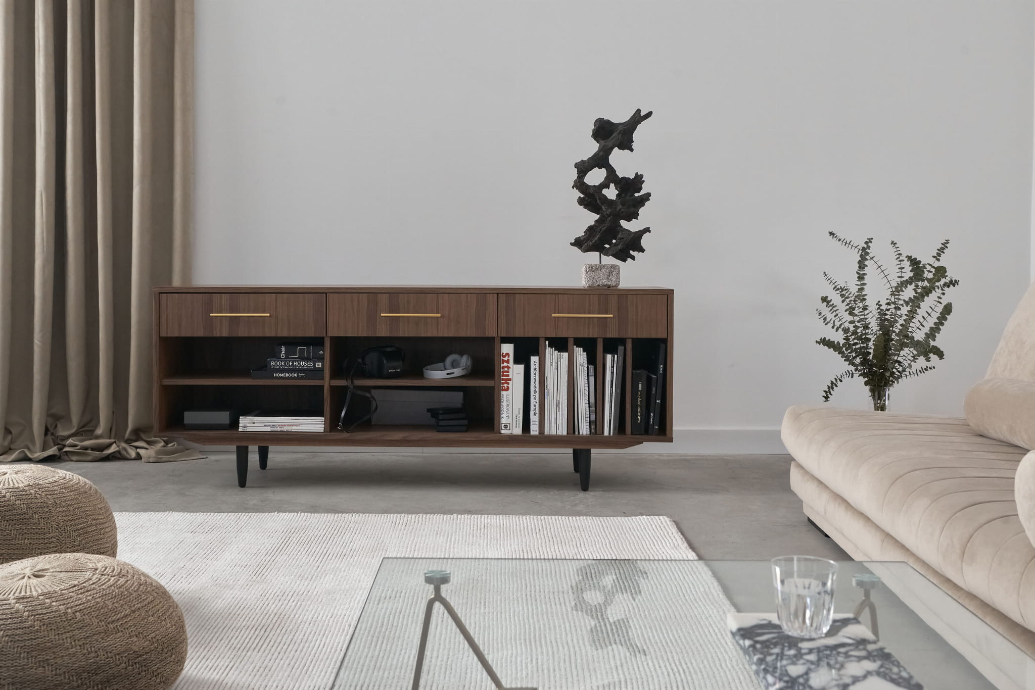 The lower shelves are slide-on, which means that their mounting system is invisible. The same goes for the side compartments. You can put your favourite vinyl records in them, and thanks to their adjustability, they can easily be adjusted to suit your needs.