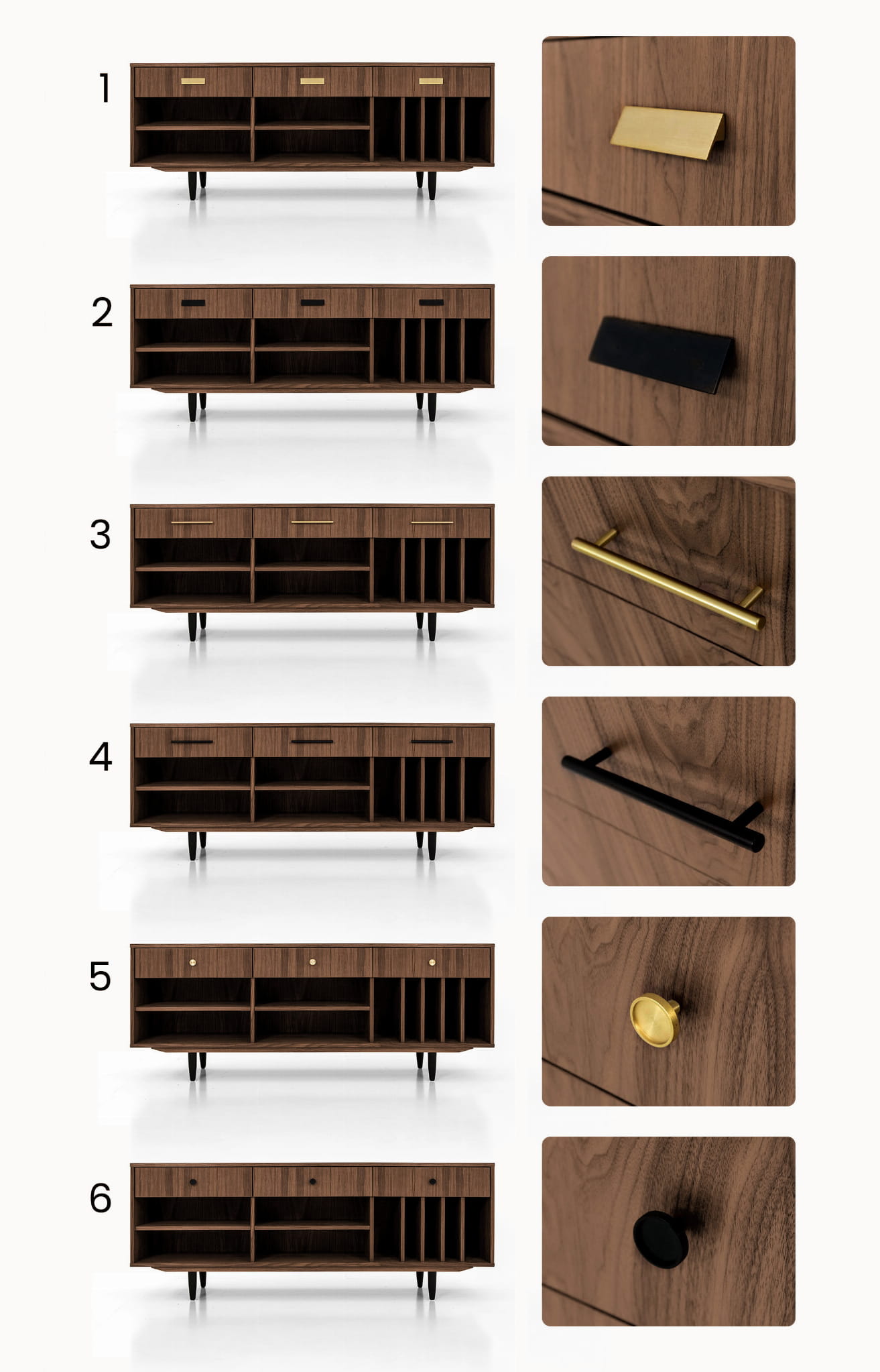 For this chest of drawers, you can select one of three types of legs. Each of them differs in height. All variants are shown in one of the photos.